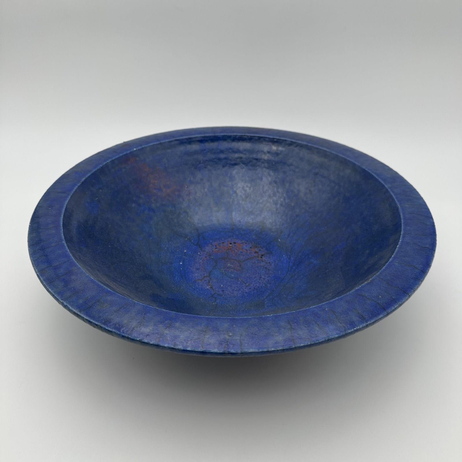Standing 9 cm tall with a large diameter of 35 cm, the work reveals a remarkable interplay of textures. The inner basin is covered with a thick, deep, and vibrant blue glaze, whose nuances are reminiscent of precious stones. The wide rim is traversed by an elegant network of natural enamel crazing. This technique, resulting from a perfectly mastered firing process, brings a true touch of soul to the object.