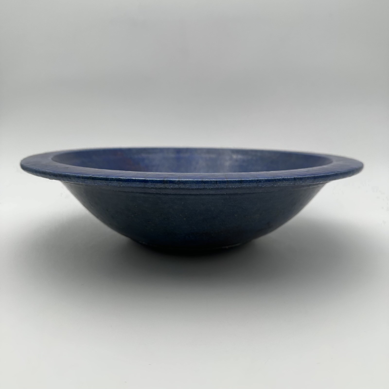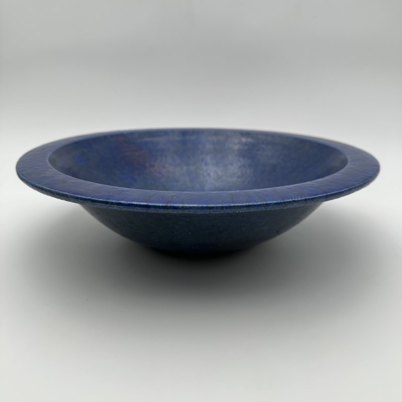 Standing 9 cm tall with a large diameter of 35 cm, the work reveals a remarkable interplay of textures. The inner basin is covered with a thick, deep, and vibrant blue glaze, whose nuances are reminiscent of precious stones. The wide rim is traversed by an elegant network of natural enamel crazing. This technique, resulting from a perfectly mastered firing process, brings a true touch of soul to the object.