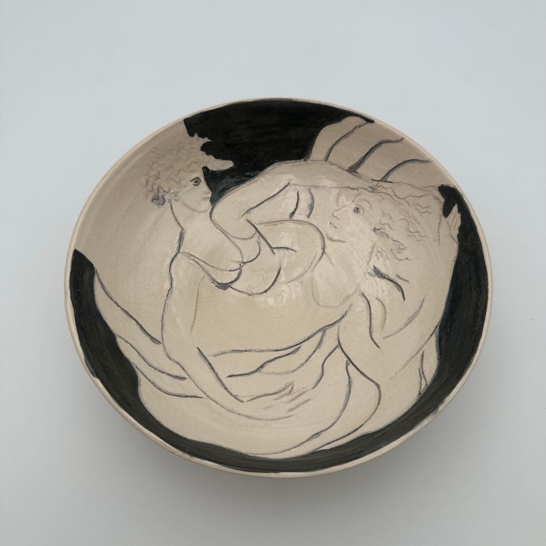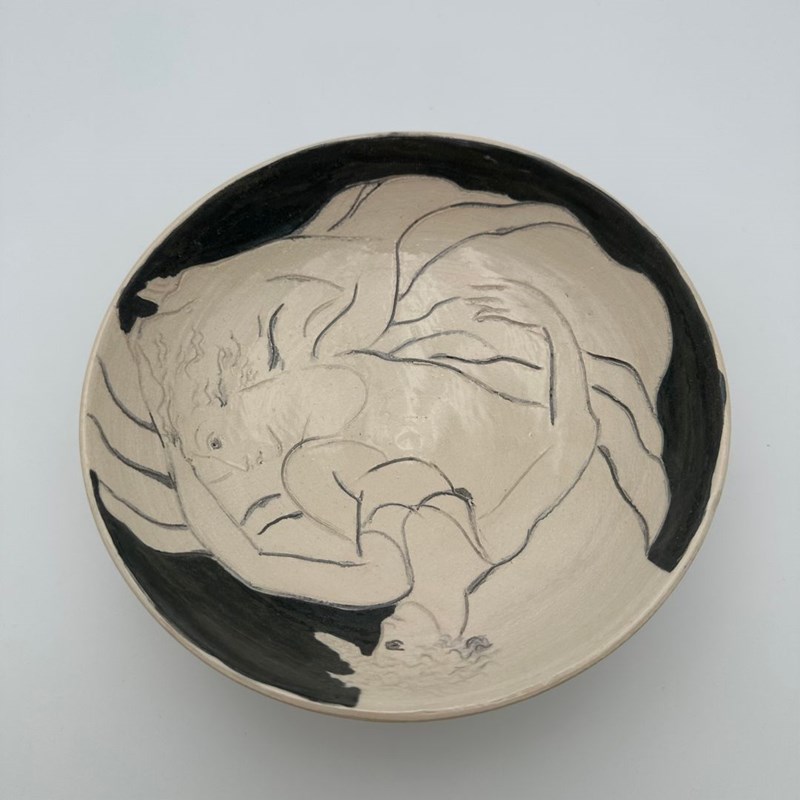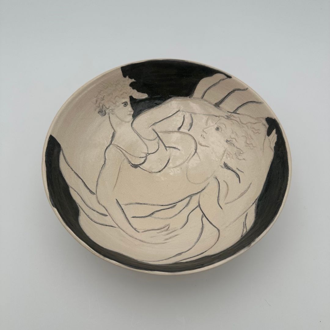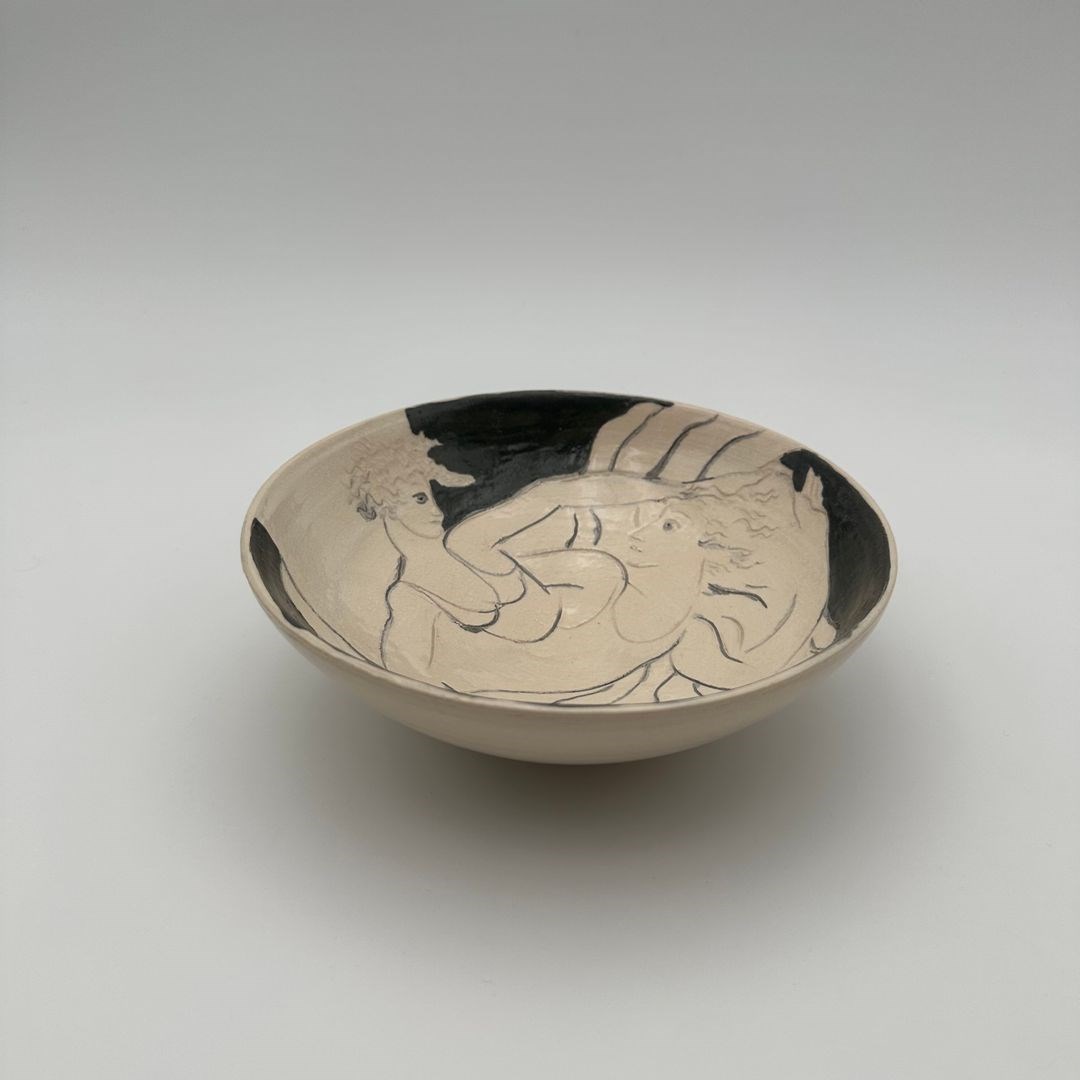 Ceramic vide-poche decorated with a drawn representation of two women, executed in a free and expressive style.