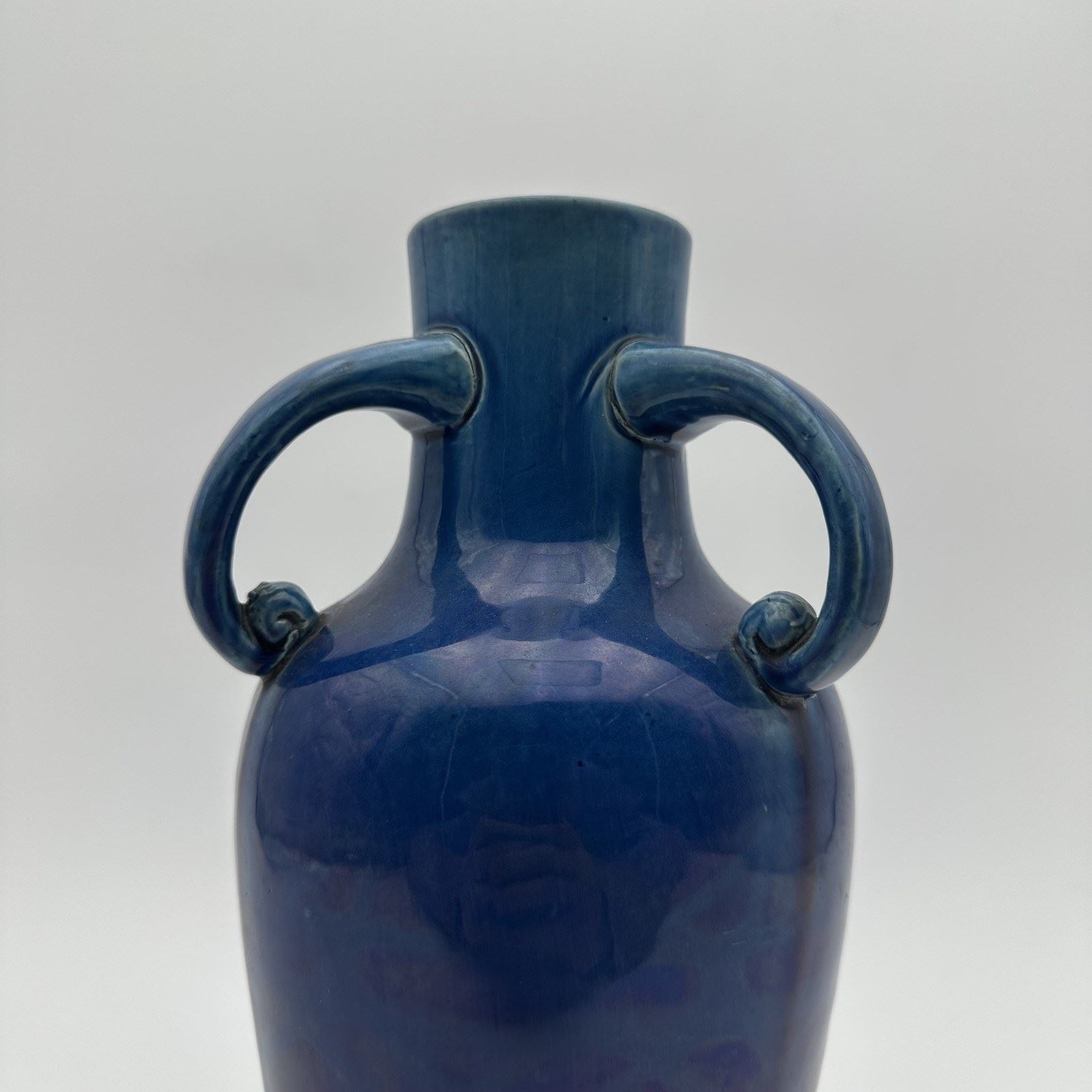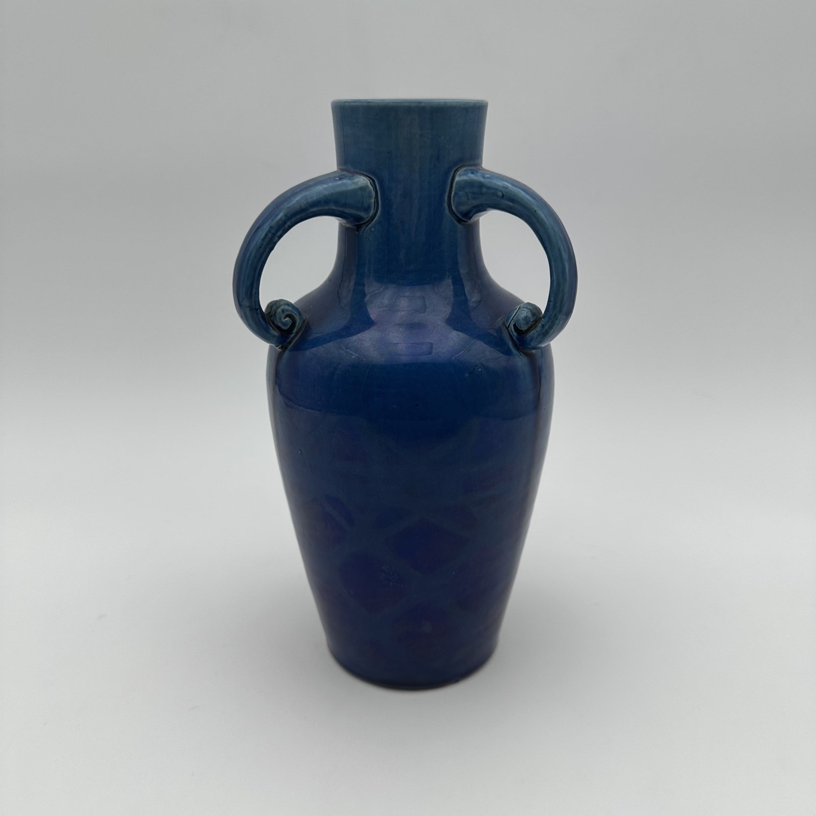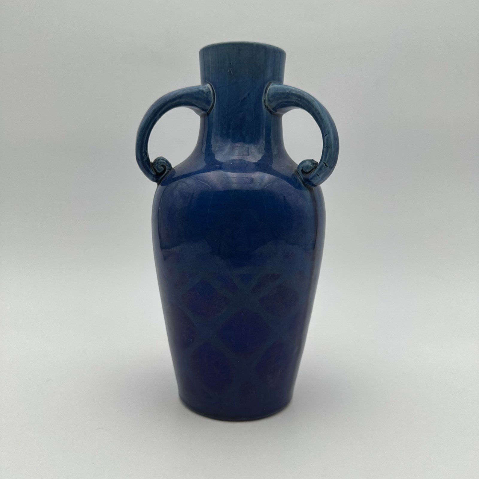 Standing 25.5 cm tall, the piece adopts a classic amphora silhouette, flanked by two charming symmetrical handles ending in delicate scrolls. The true magic of the object lies in its glaze: an intense, deep cobalt blue enamel that catches the light beautifully. Upon close inspection of the lower part of the body, one discovers a subtle molded geometric relief decor (evoking a scale or honeycomb pattern), revealed by the natural pooling and nuances of the glaze during firing.