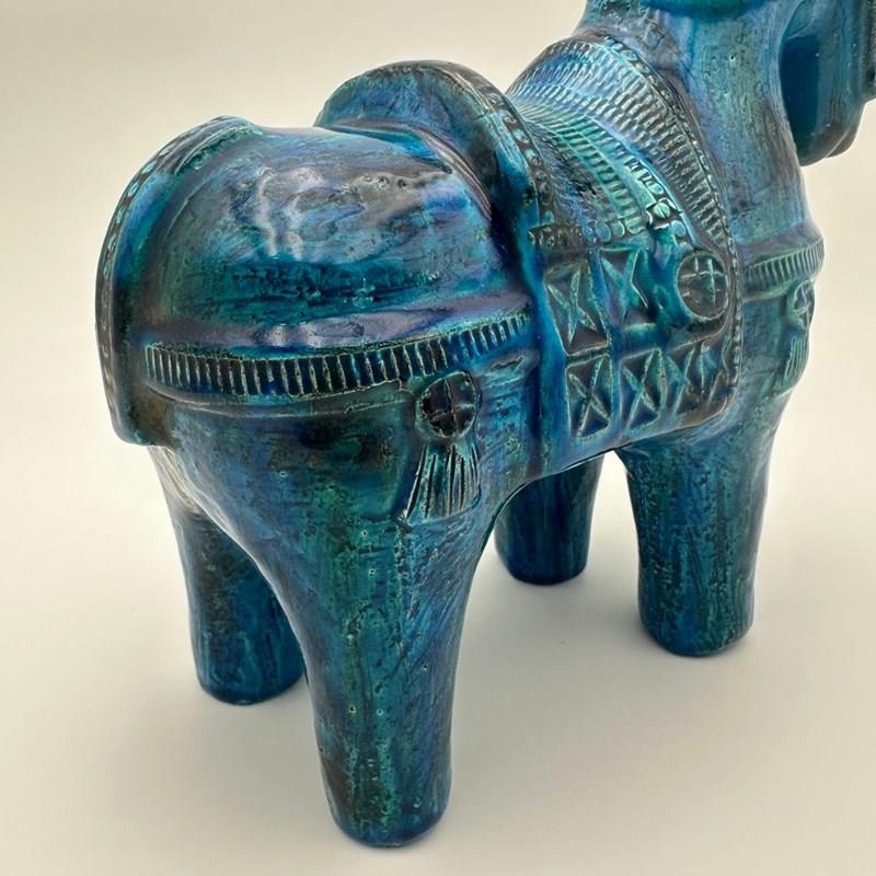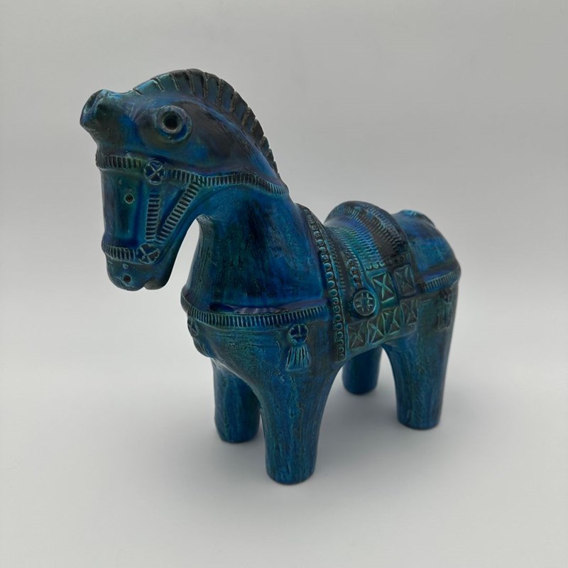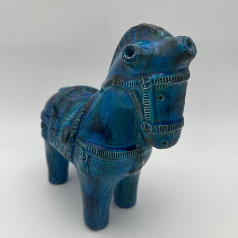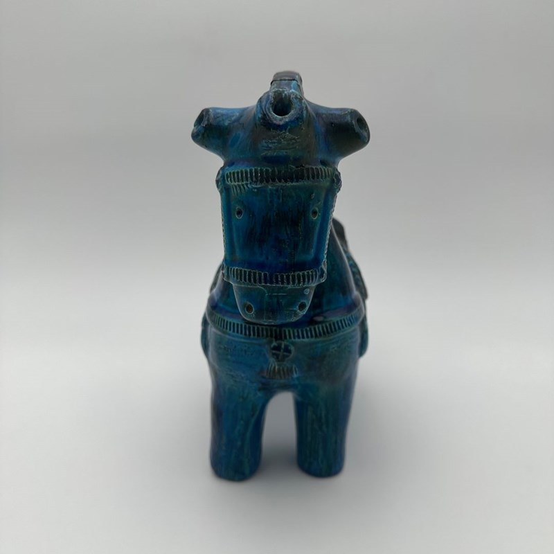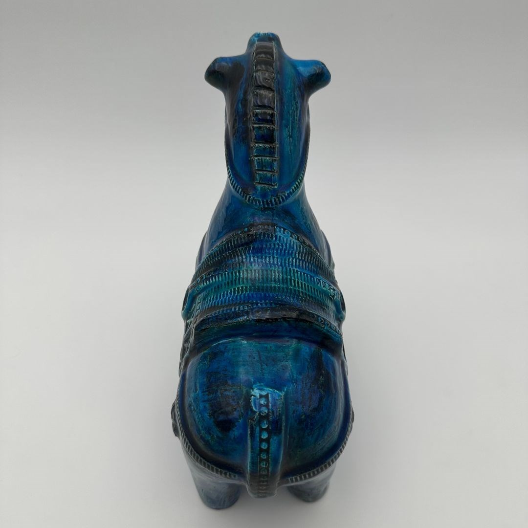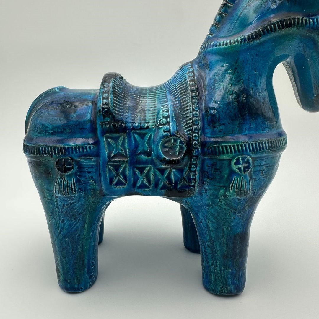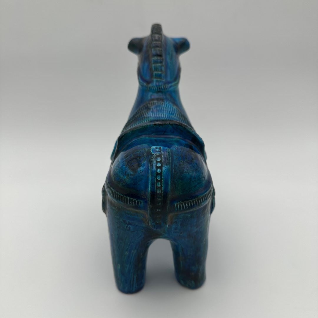 Decorative glazed ceramic horse by Aldo Londi for the Italian manufactory Bitossi, from the iconic Rimini Blu collection of the 1960s. This piece stands out for its glossy glaze, featuring a deep range of blue tones enhanced with subtle green and yellow brushwork, as well as the distinctive incised patterns characteristic of Londi’s work.