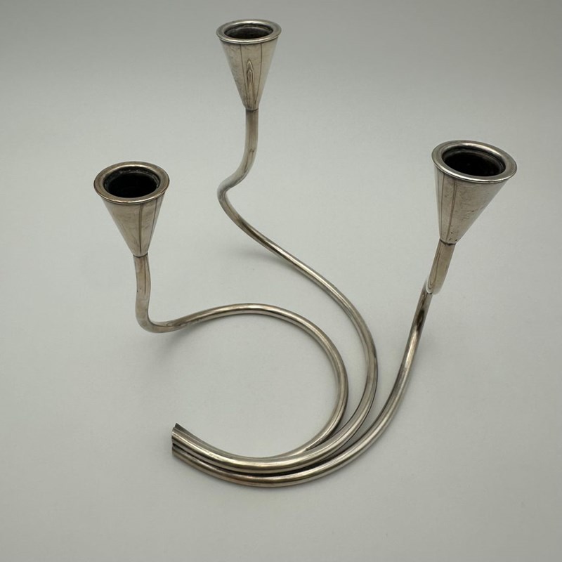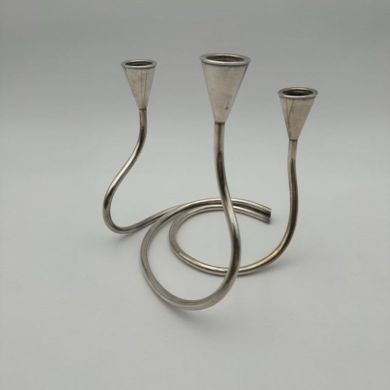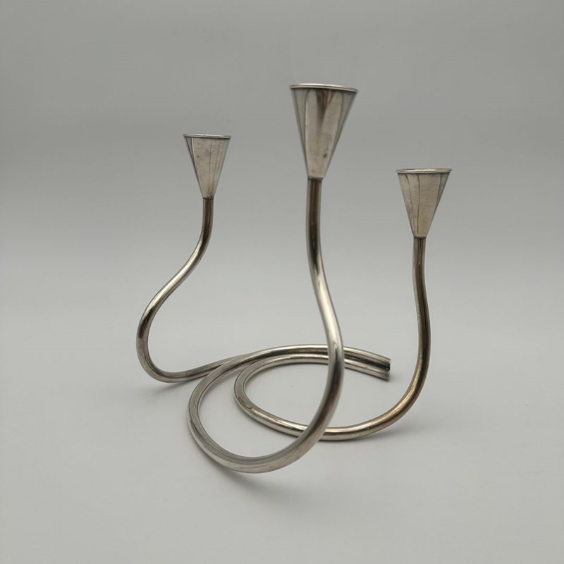 Design silvered metal candlestick with 3 candles. French work. Circa 1970