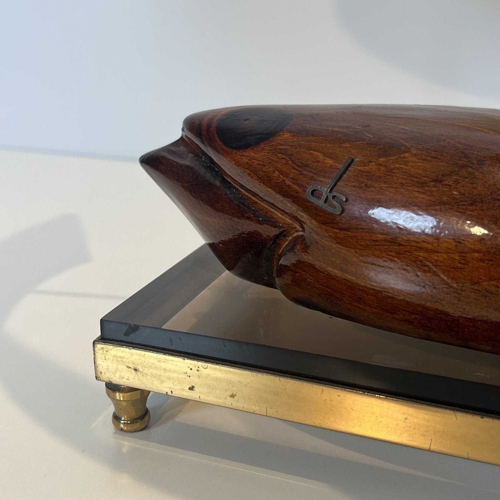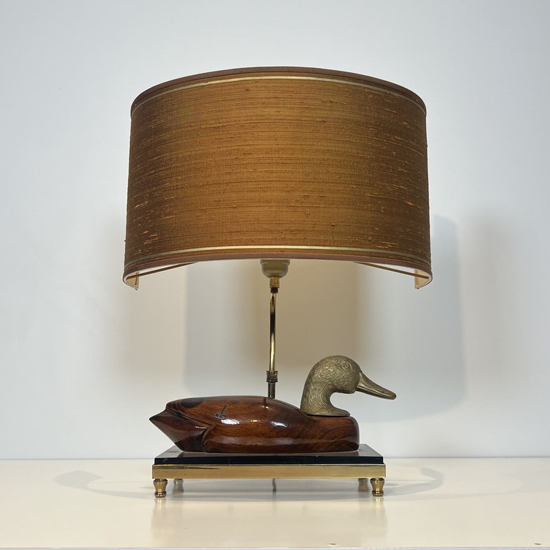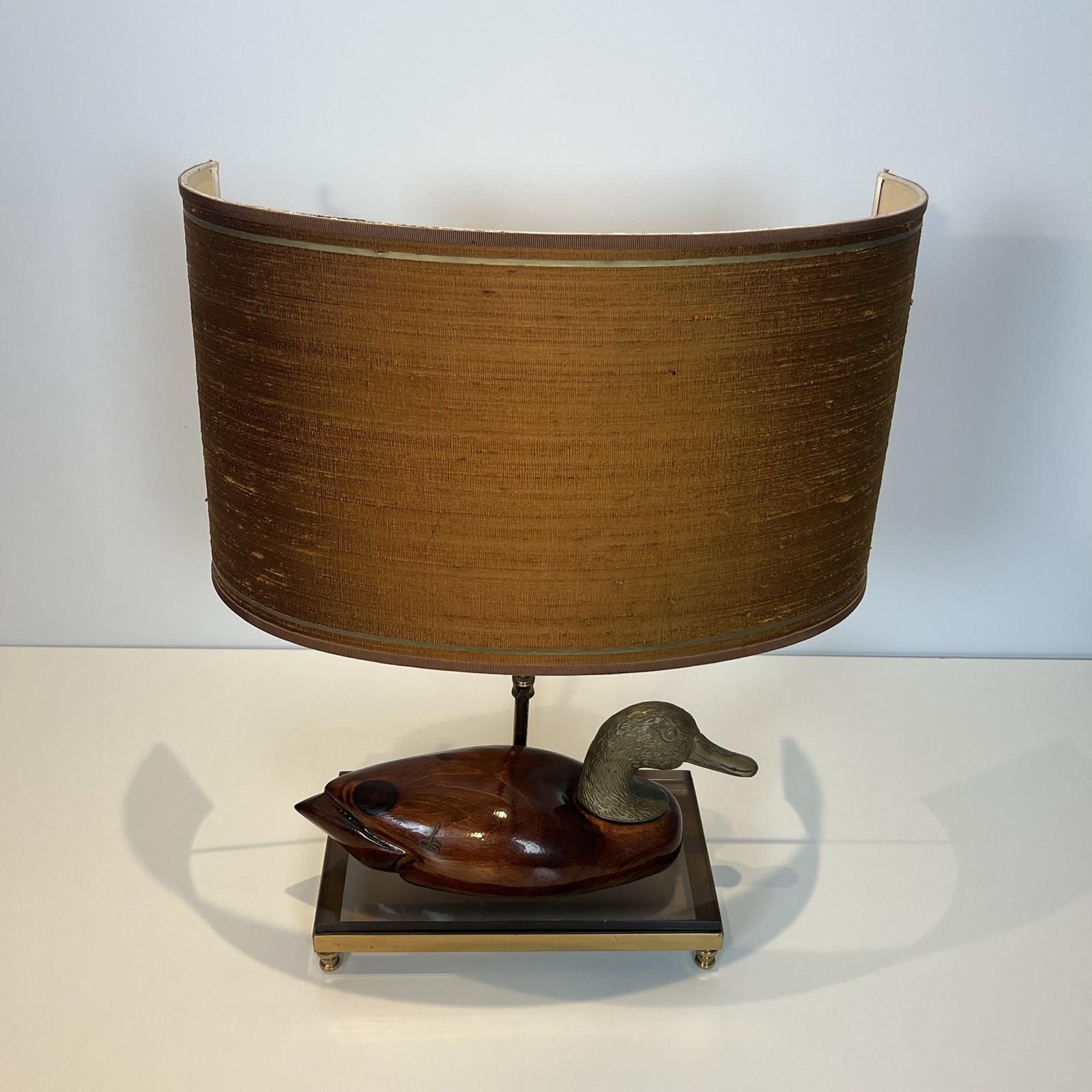 This table lamp is a representative creation of the taste for animal sculpture in high-end decoration during the late 20th century. The structural design relies on a rectangular base combining a polished brass frame with a thick tinted glass plate (resting on four small turned feet). The central element is a sculpture of a duck, whose body is carved from stained and varnished solid wood, providing a technical contrast to a finely textured silver-plated metal head. The tubular brass stem rises from the animal's back to support the lighting system.