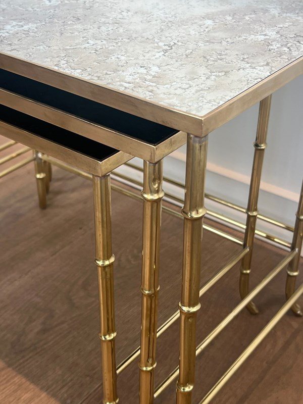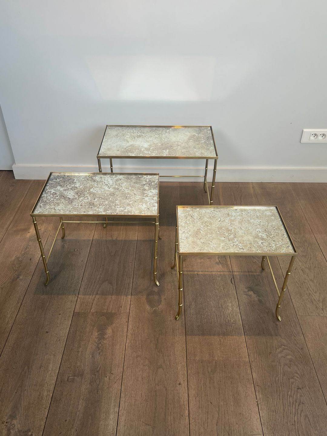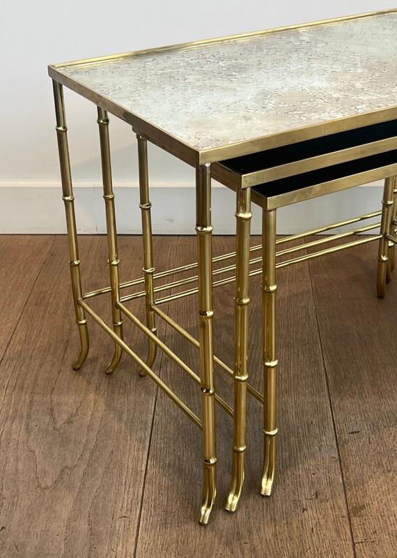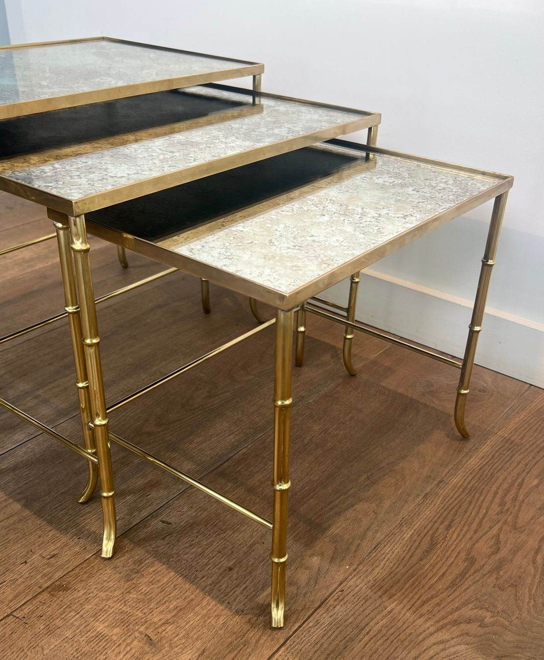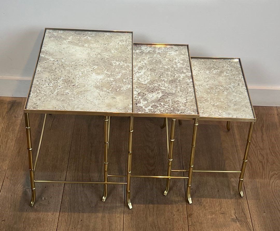 Faux-Bamboo Brass Nesting Tables With Eglomized Mirror Tops