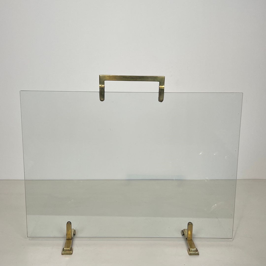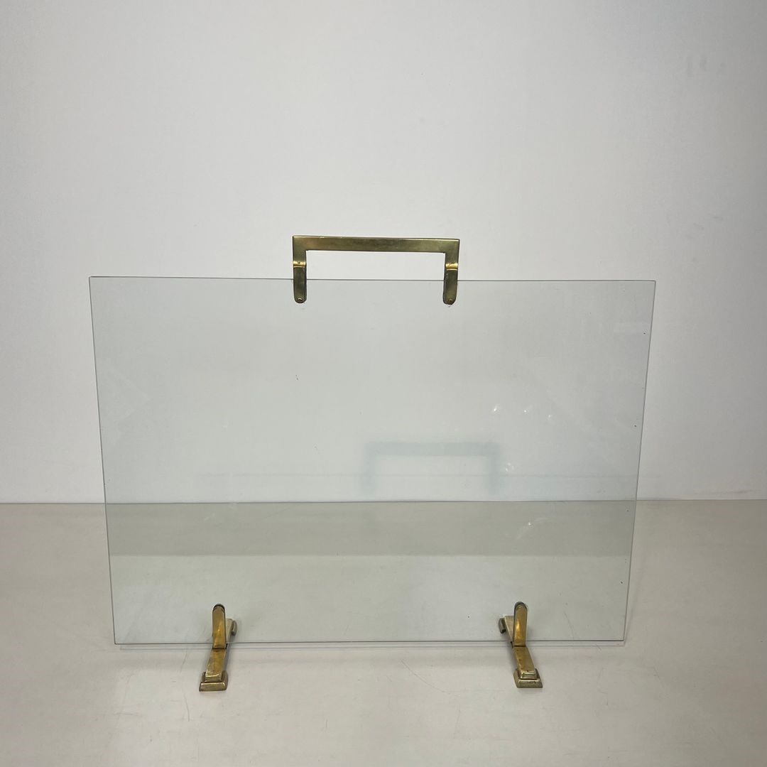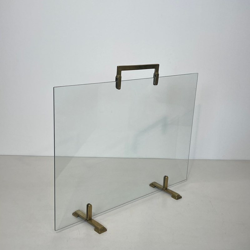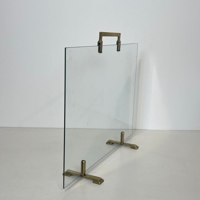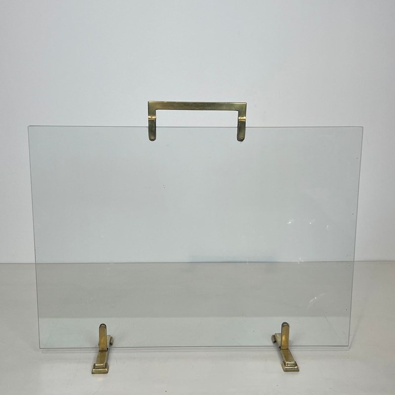 Glass and brass fireplace screen with brass feet. French work. Circa 1970