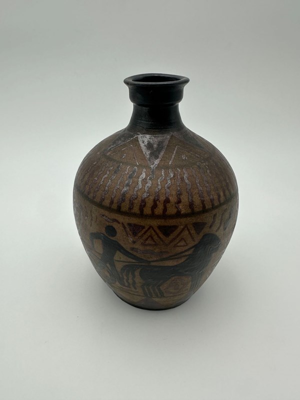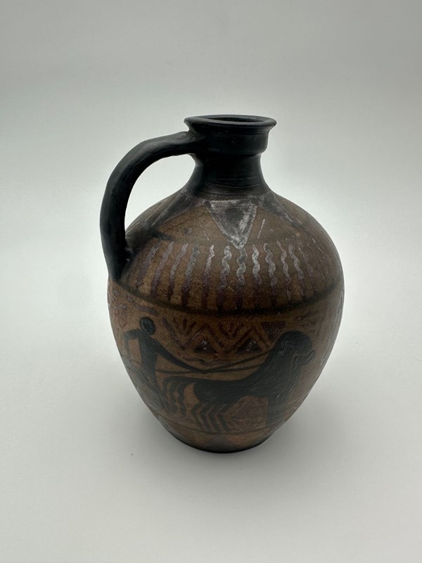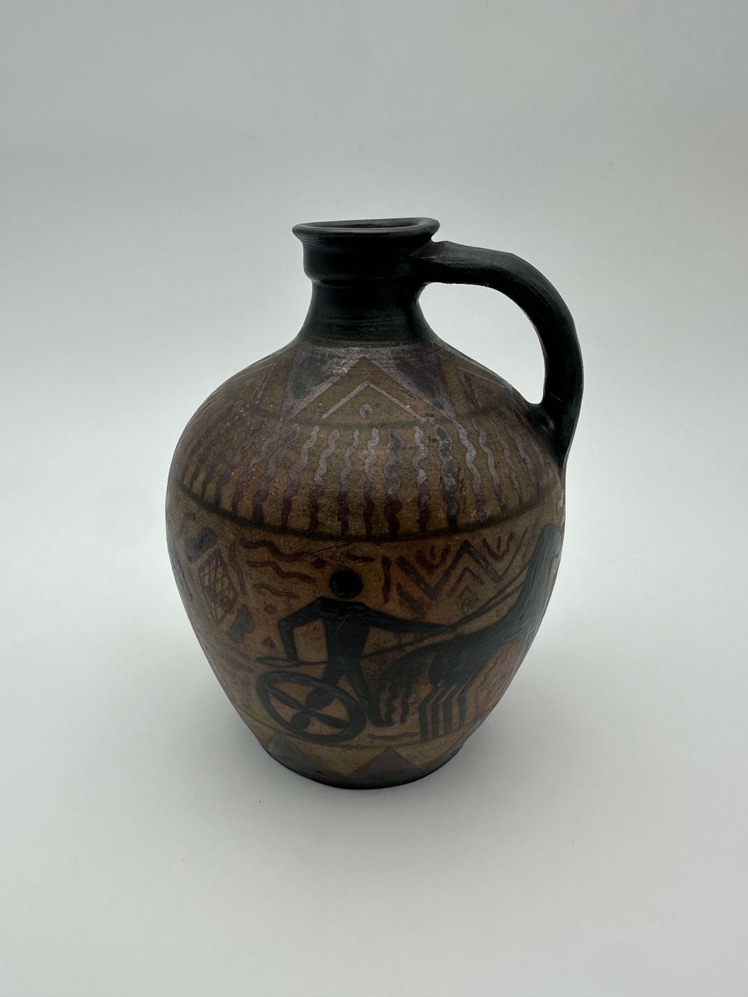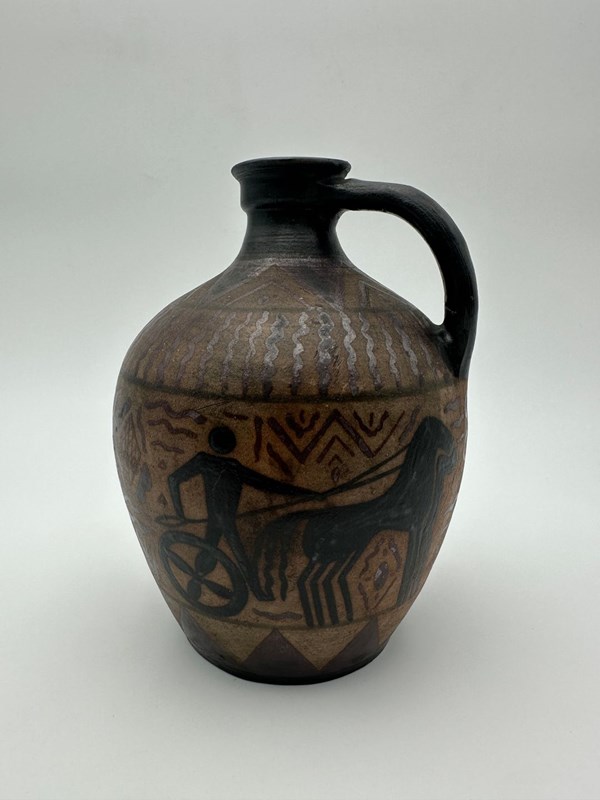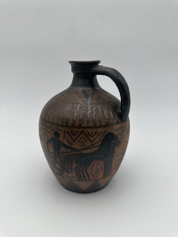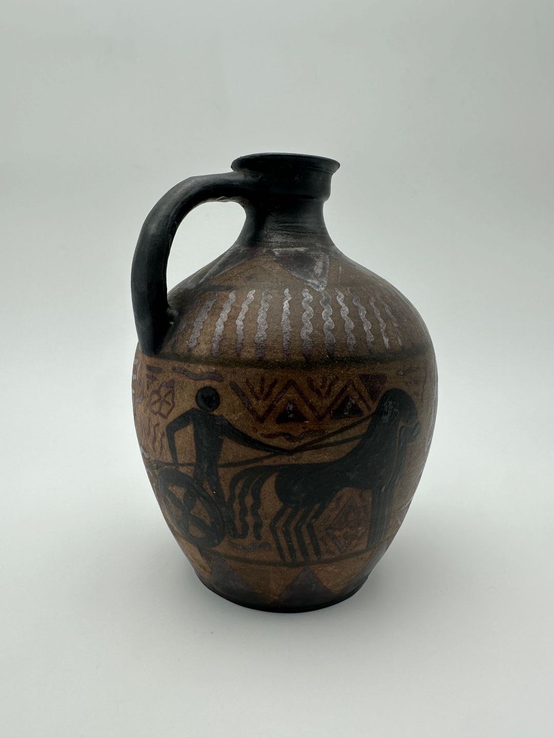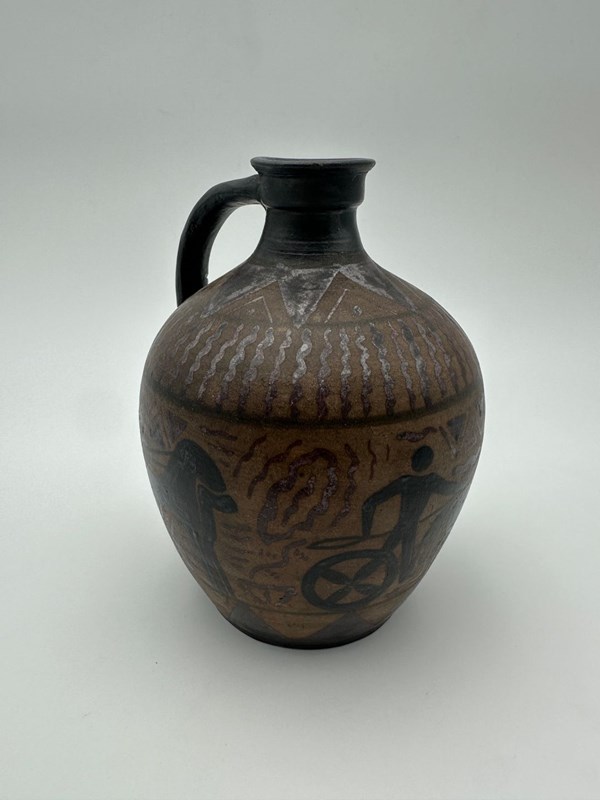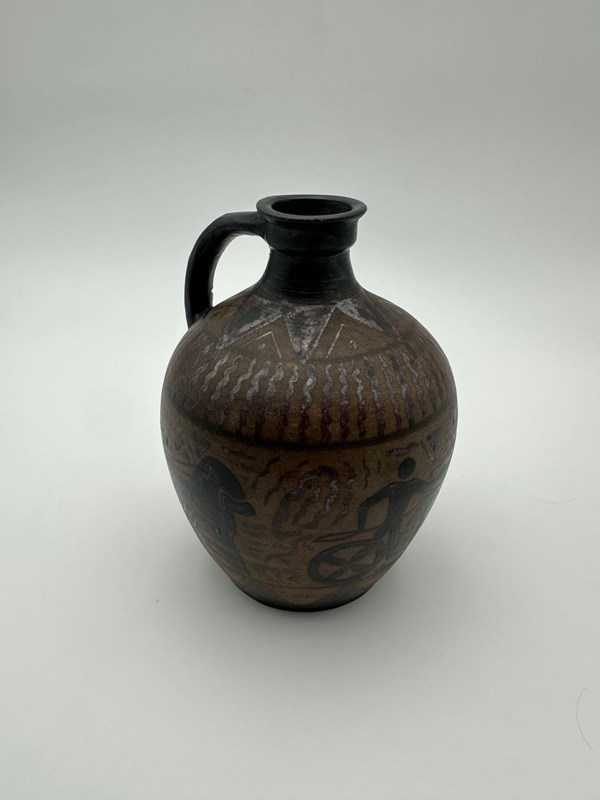 Glazed stoneware pitcher by VE Ciboure, Vilotte period, circa 1920. The piece features a continuous frieze depicting antique chariots on an ochre ground, rendered in a refined neo-classical style characteristic of the manufactory’s early production.