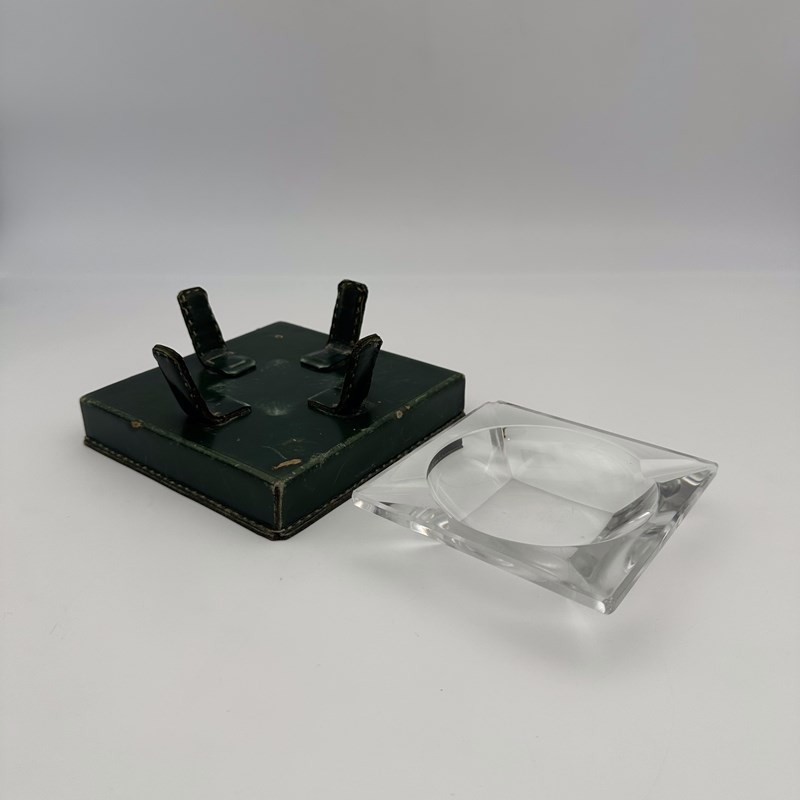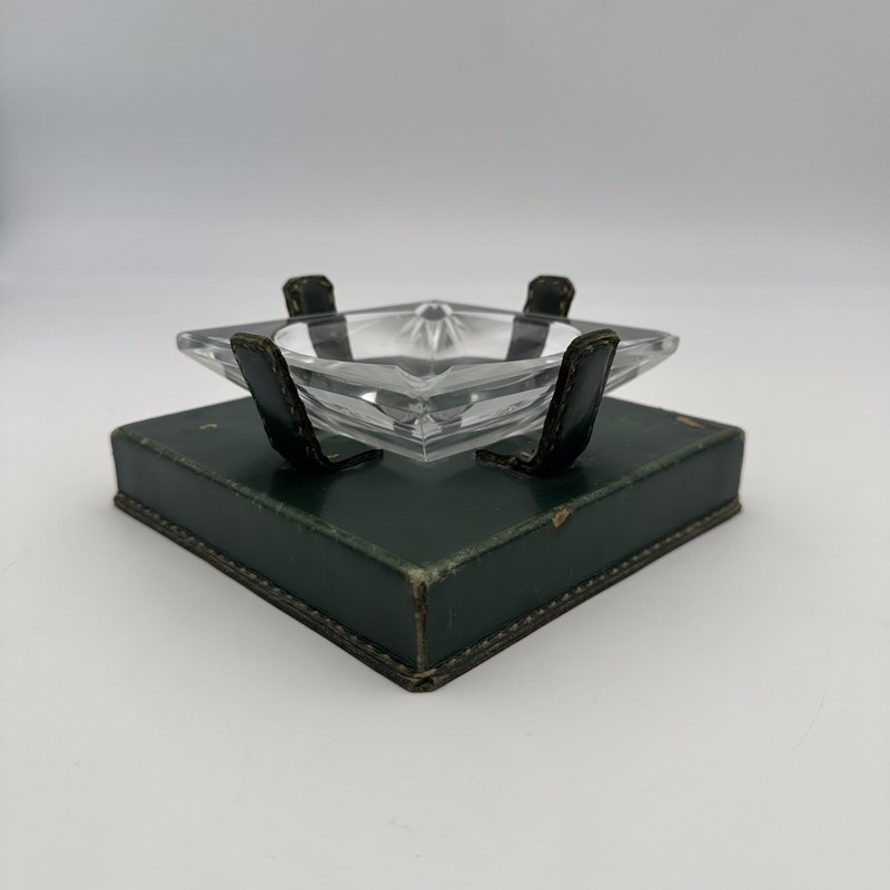 With its 15 cm square base, the object reveals a magnificent contrast of textures. The base and the four metal supports are entirely wrapped in an intense forest green leather, delicately highlighted by "saddle" stitching. This warm structure suspends a heavy, transparent crystal (or solid glass) receptacle with beveled geometric lines, creating a superb interplay of transparency and reflections.