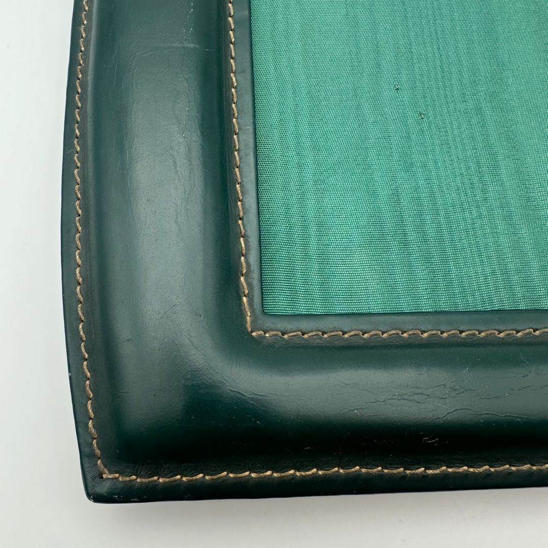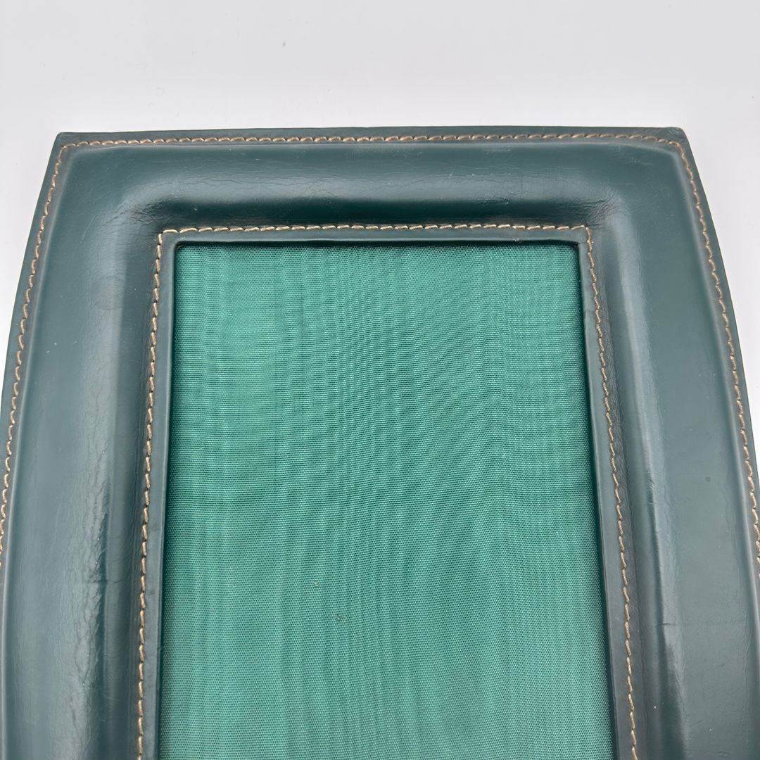 Green leather-covered photo frame made in the style of Jacques Adnet, an iconic figure of French design, renowned for his refined Art Deco-inspired creations combining leather and clean architectural lines.