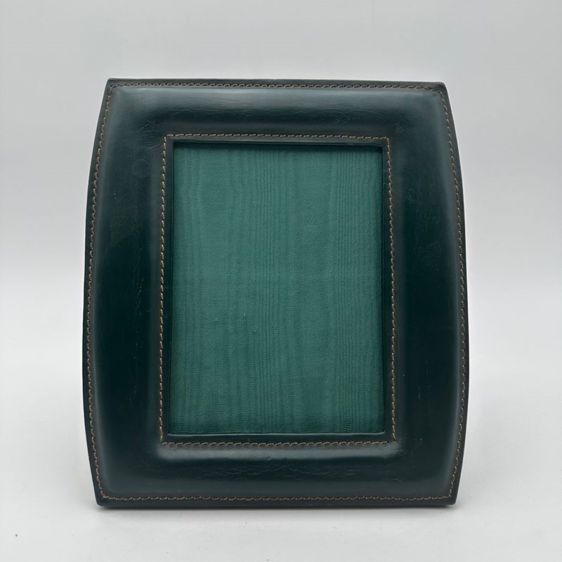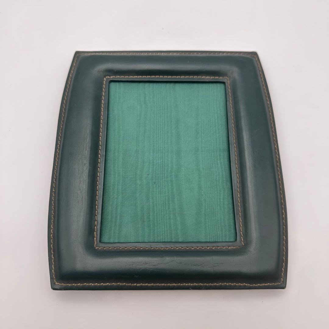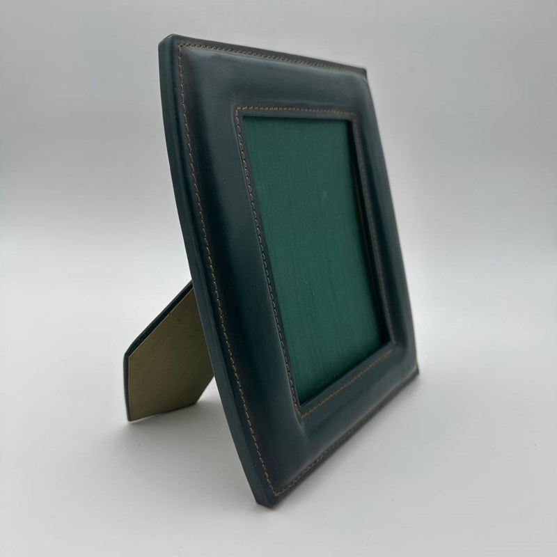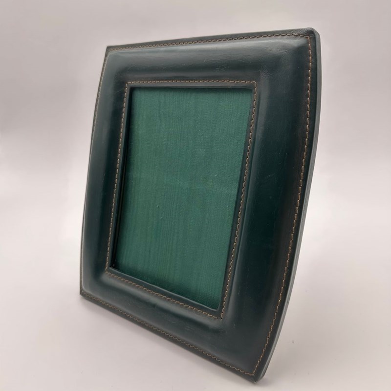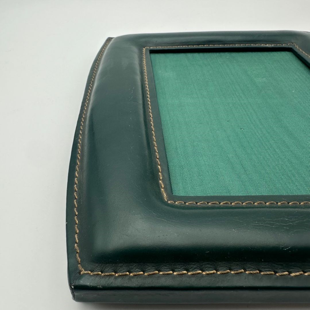 Green leather-covered photo frame made in the style of Jacques Adnet, an iconic figure of French design, renowned for his refined Art Deco-inspired creations combining leather and clean architectural lines.