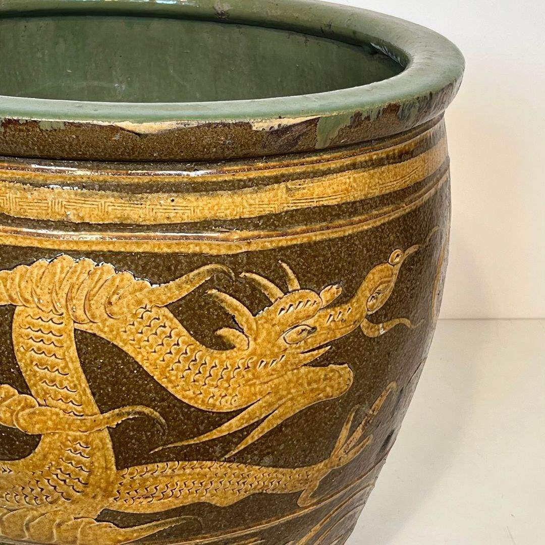 Important Chinese polychrome glazed terracotta jardinière decorated with dragons. Chinese work. Circa