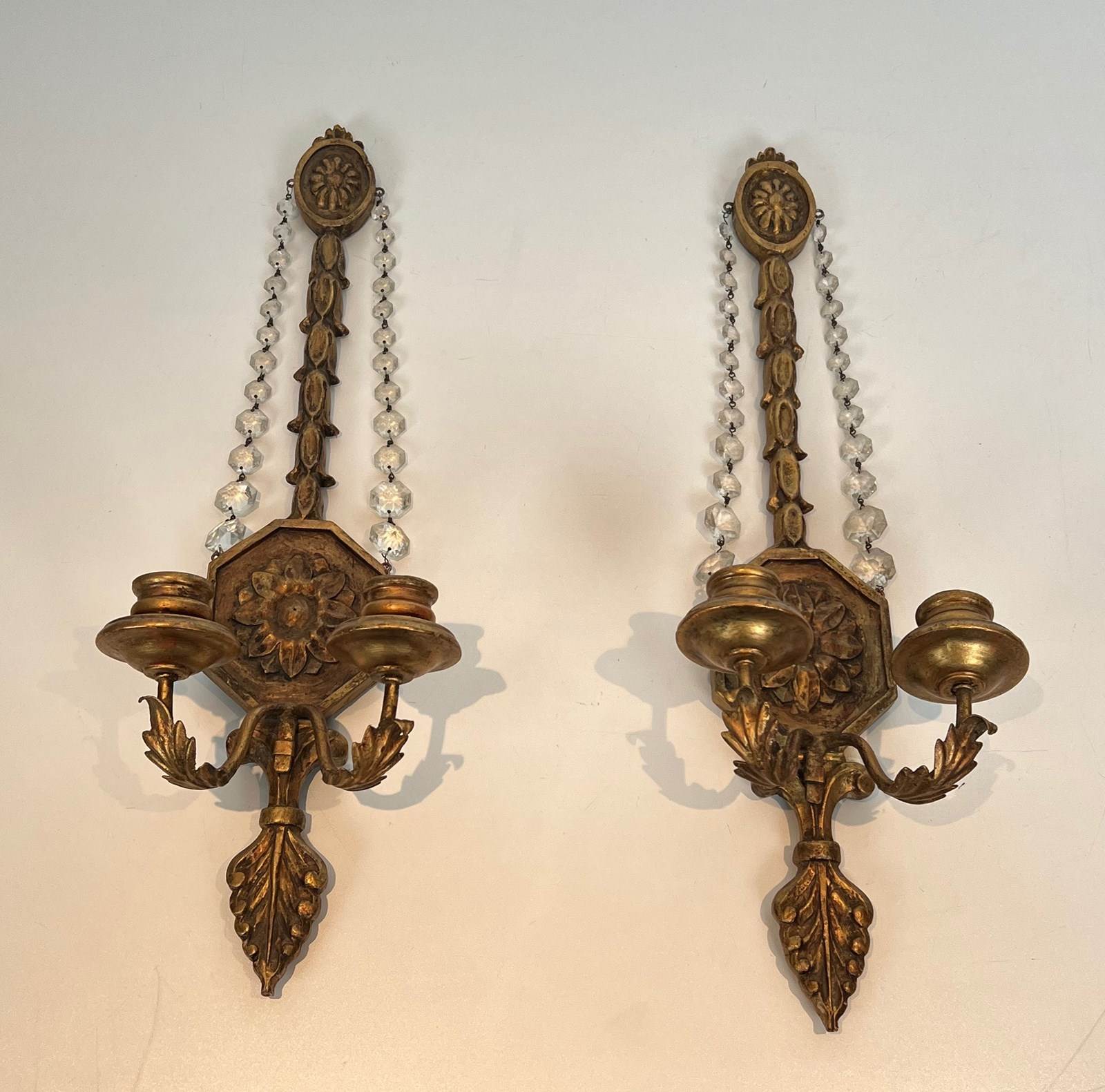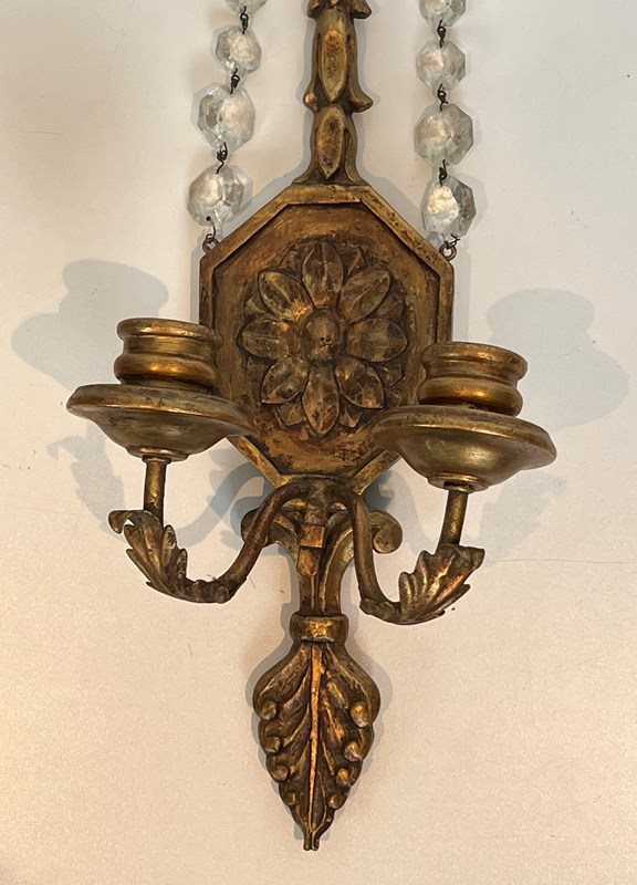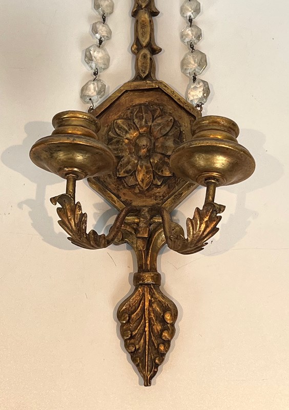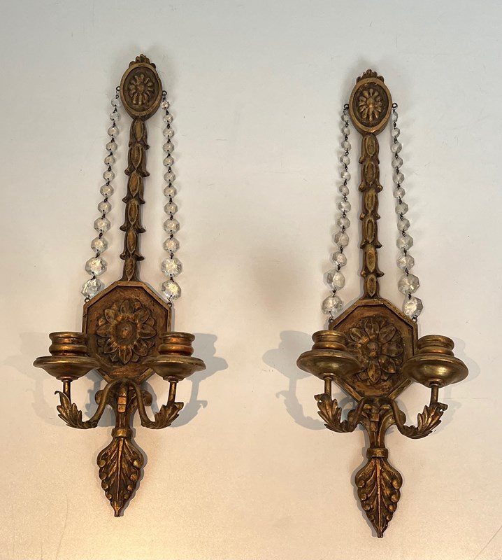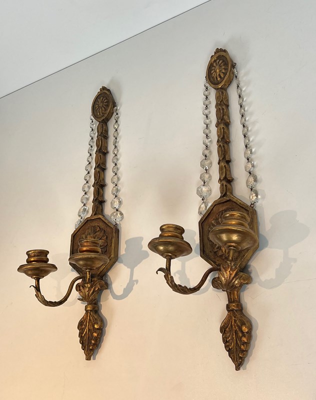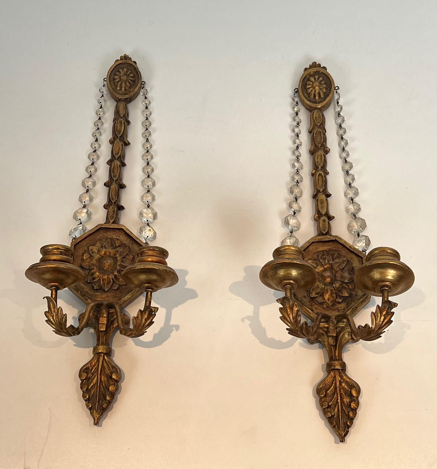 Important pair of Louis the 16th style gilded carved wood wall sconces with crystal garlands. French work. Circa 1940