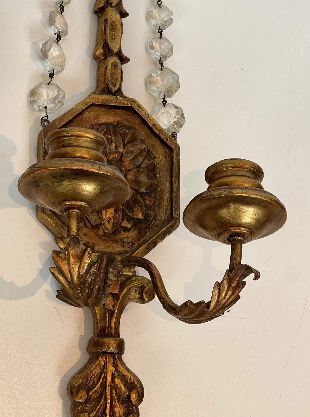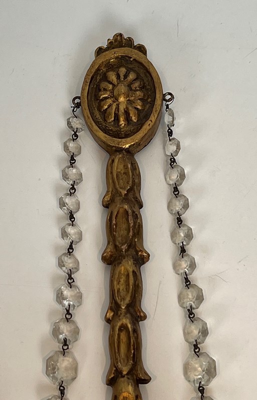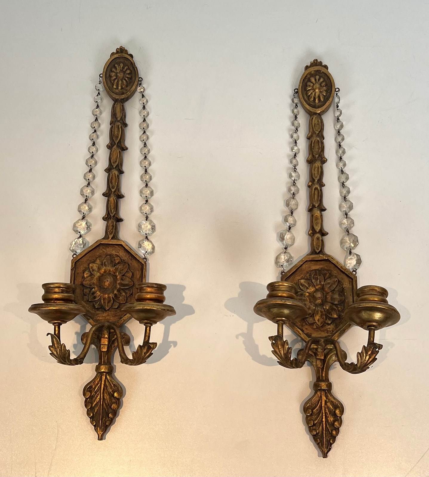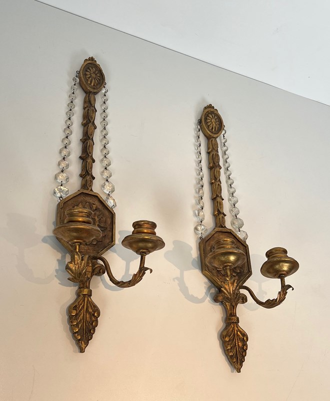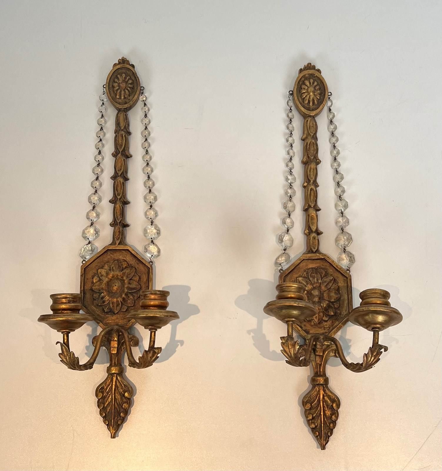 Important pair of Louis the 16th style gilded carved wood wall sconces with crystal garlands. French work. Circa 1940