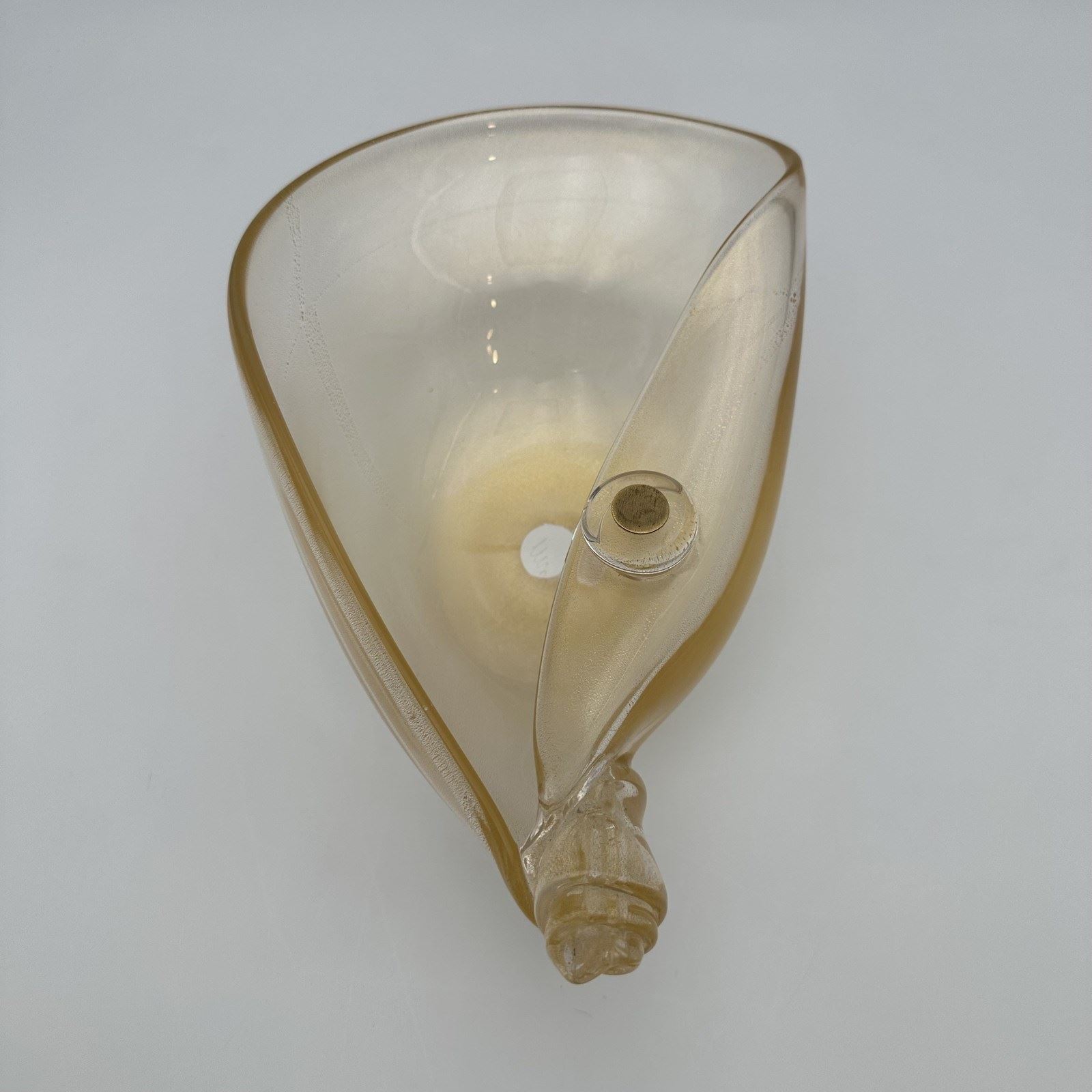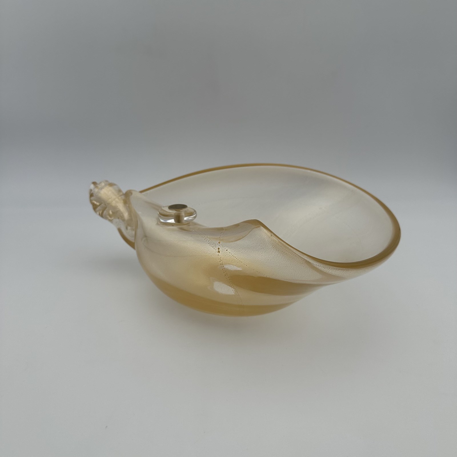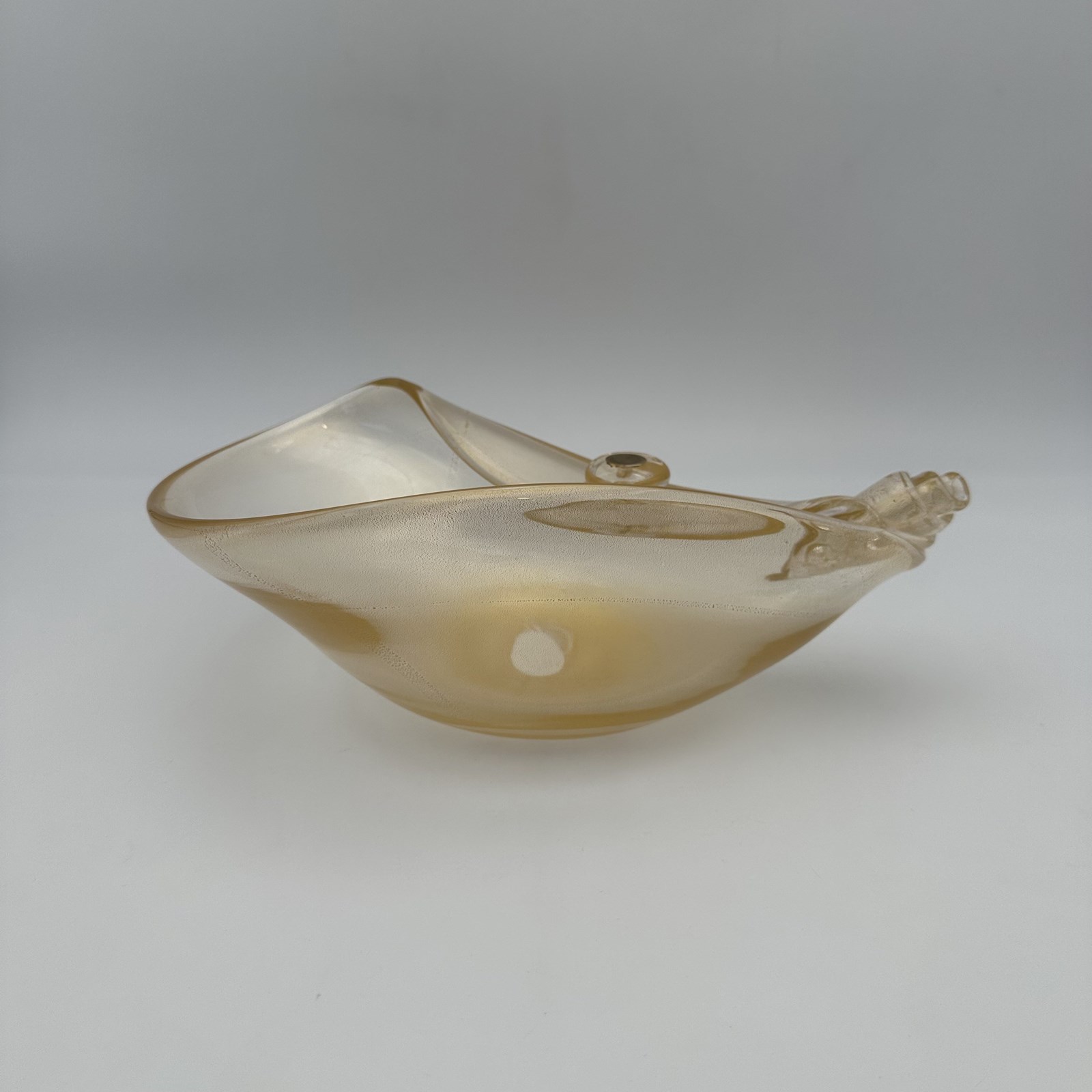 With its generous dimensions (30 cm wide), the object captivates with the fluidity of its "free-form" design, evoking the frozen movement of a wave or the elegance of a seashell. The edges of the glass are delicately pinched and folded over, creating subtle sculptural details. The true magic of this piece lies in its surface treatment: the thick glass incorporates a magnificent pearlescent iridescence in champagne and golden hues. This complex technique allows the bowl to catch and diffract light spectacularly, offering shimmering reflections that shift depending on the viewing angle.