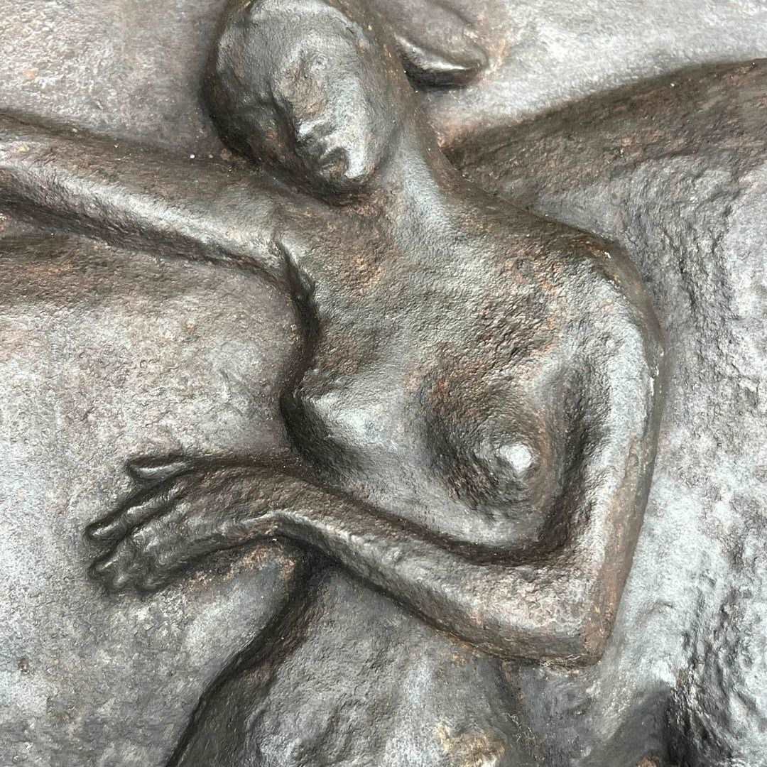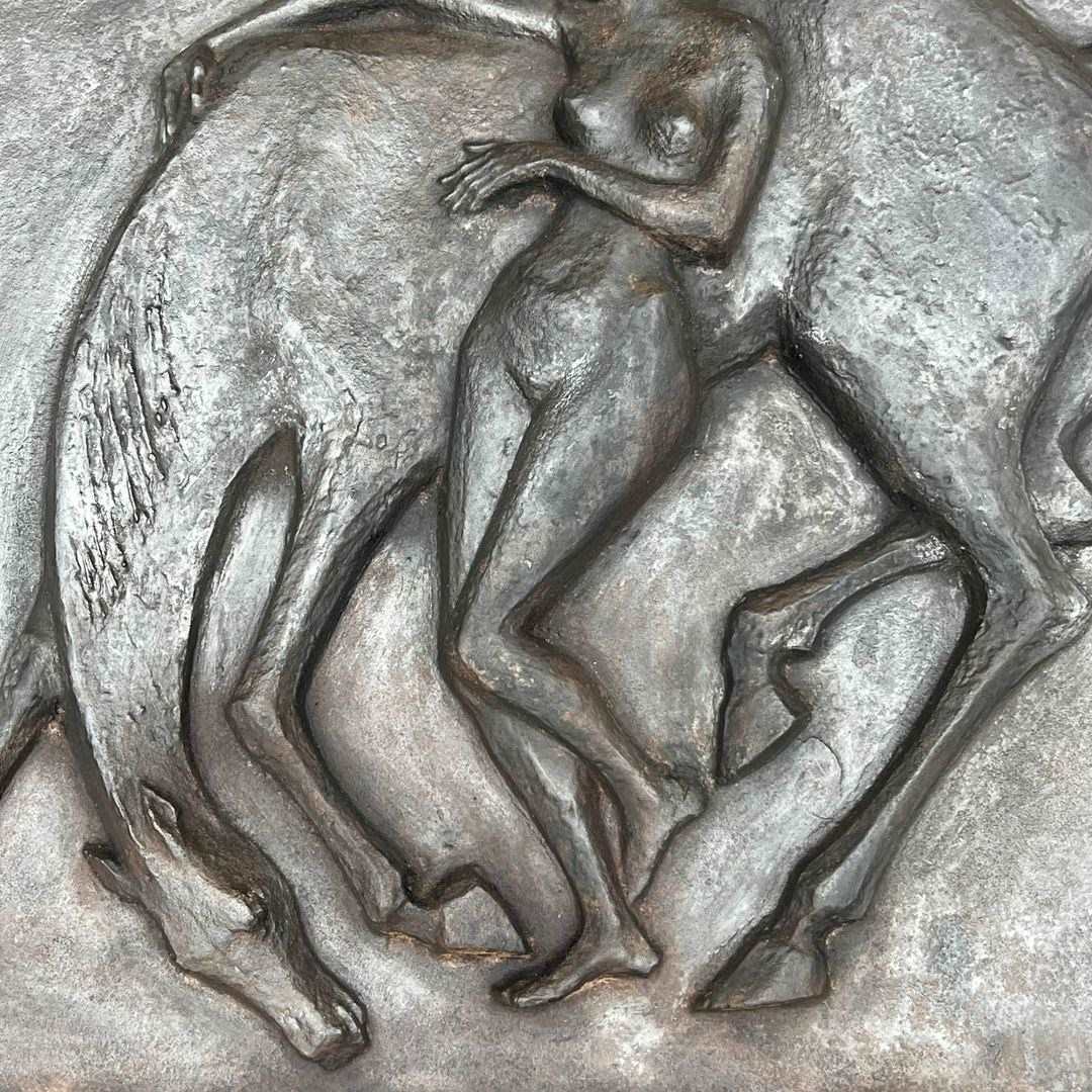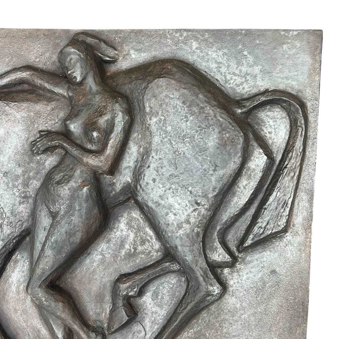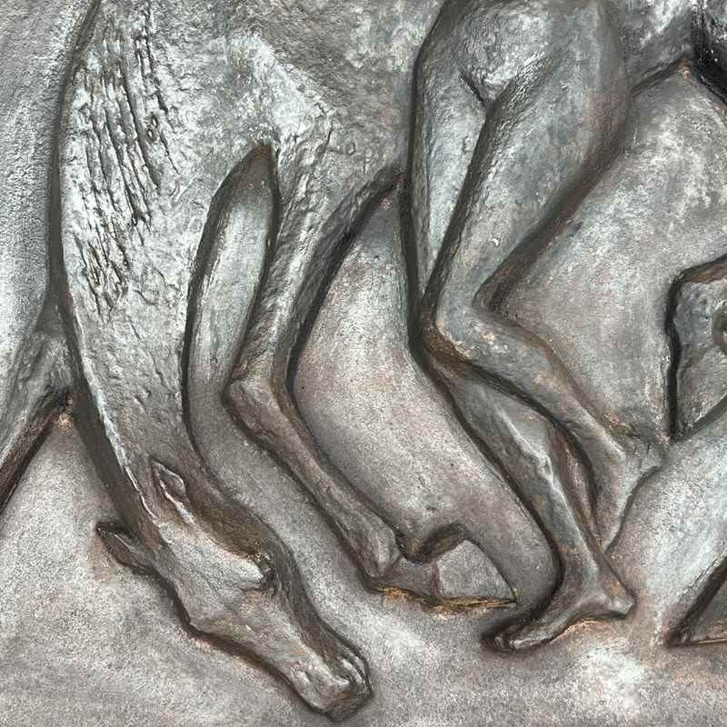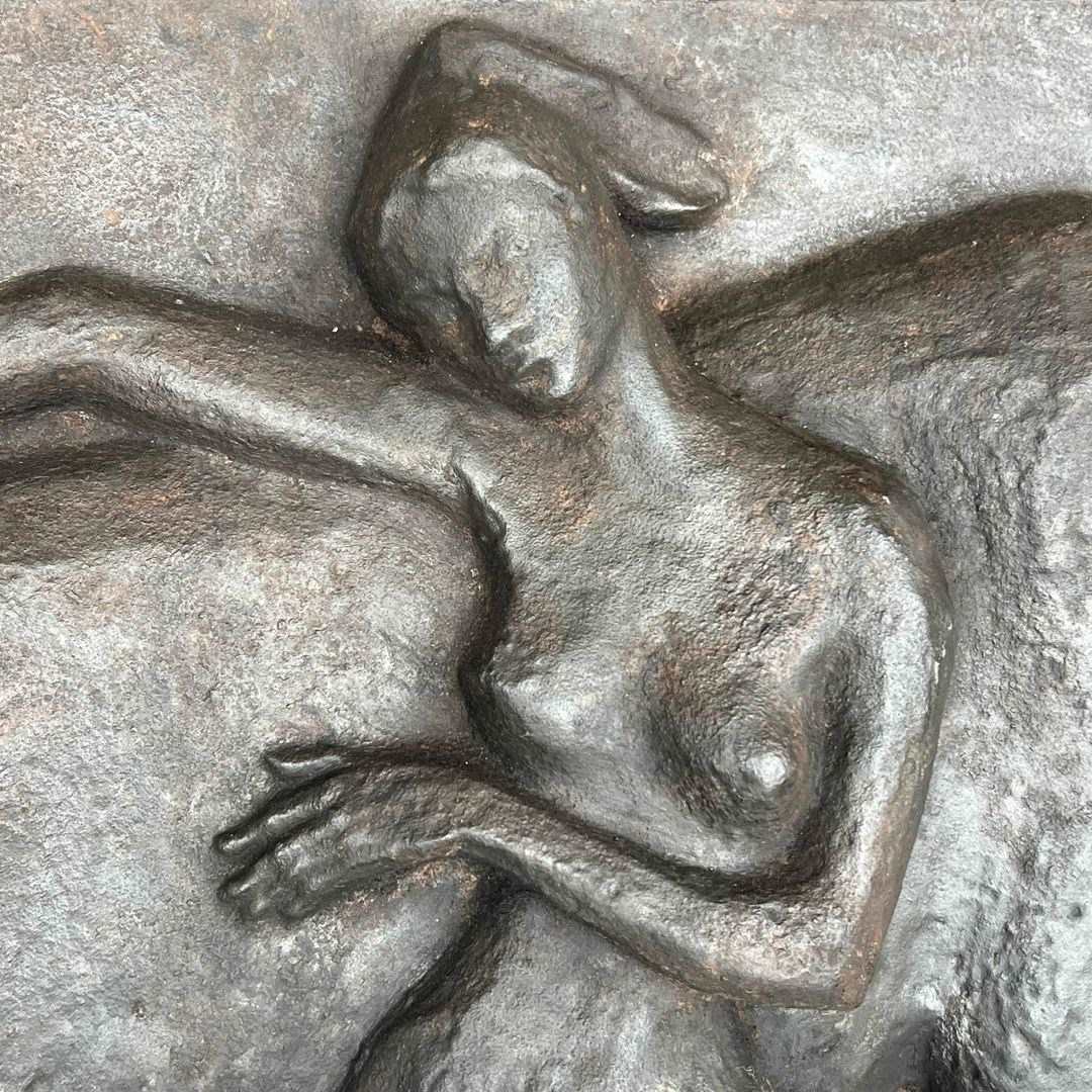 Large cast iron fireback representing a nude woman caressing her horse. French work in the Art Deco style. Circa 1970