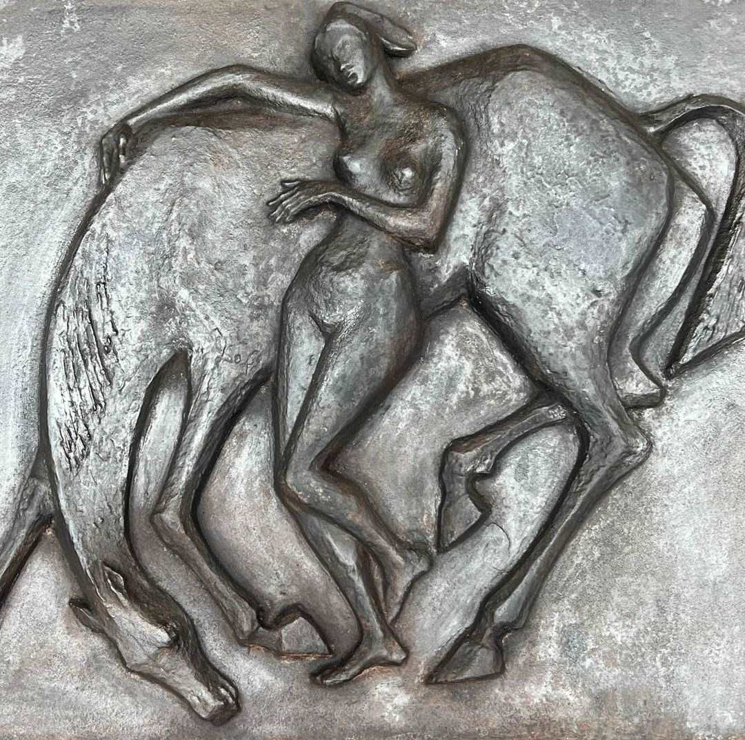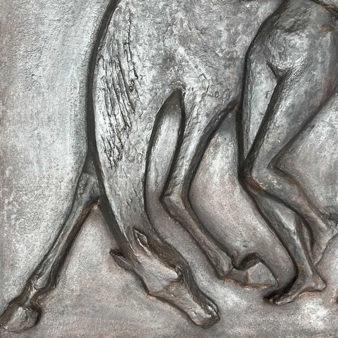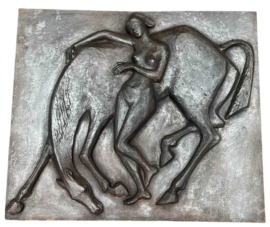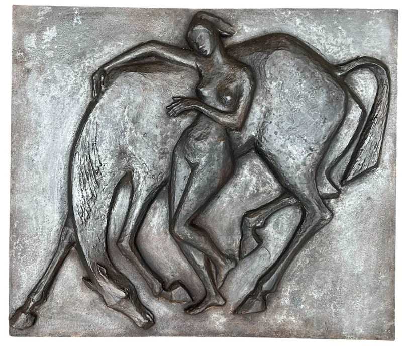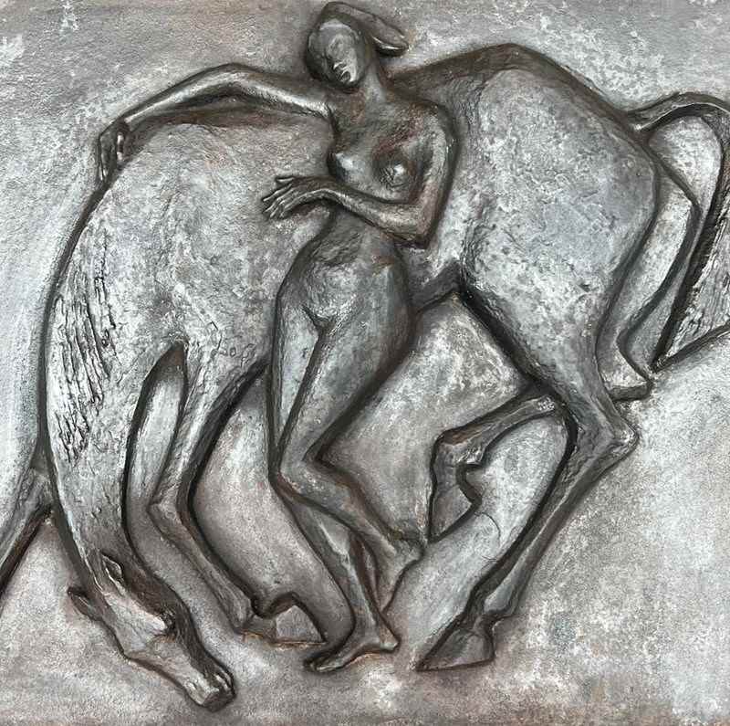 Large cast iron fireback representing a nude woman caressing her horse. French work in the Art Deco style. Circa 1970