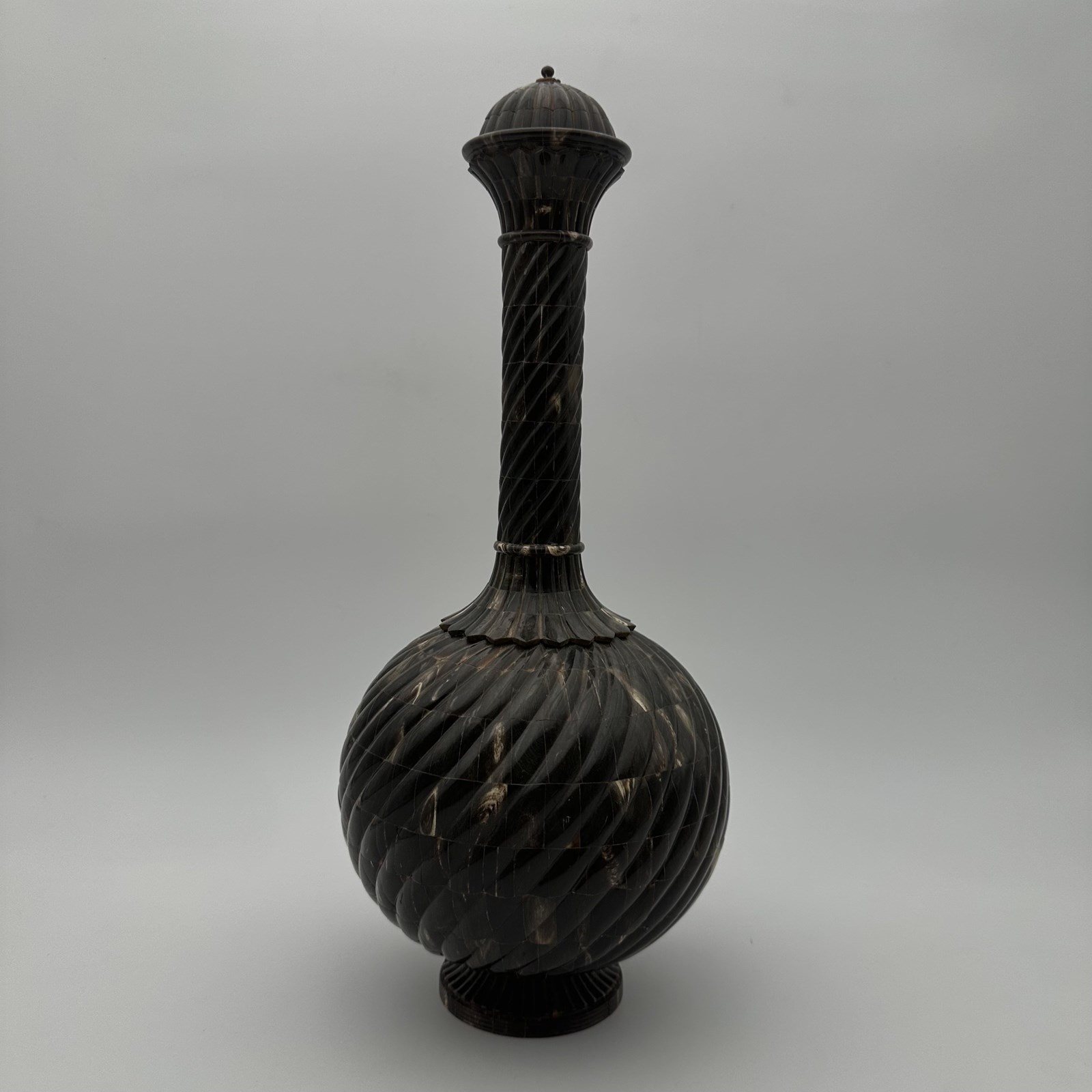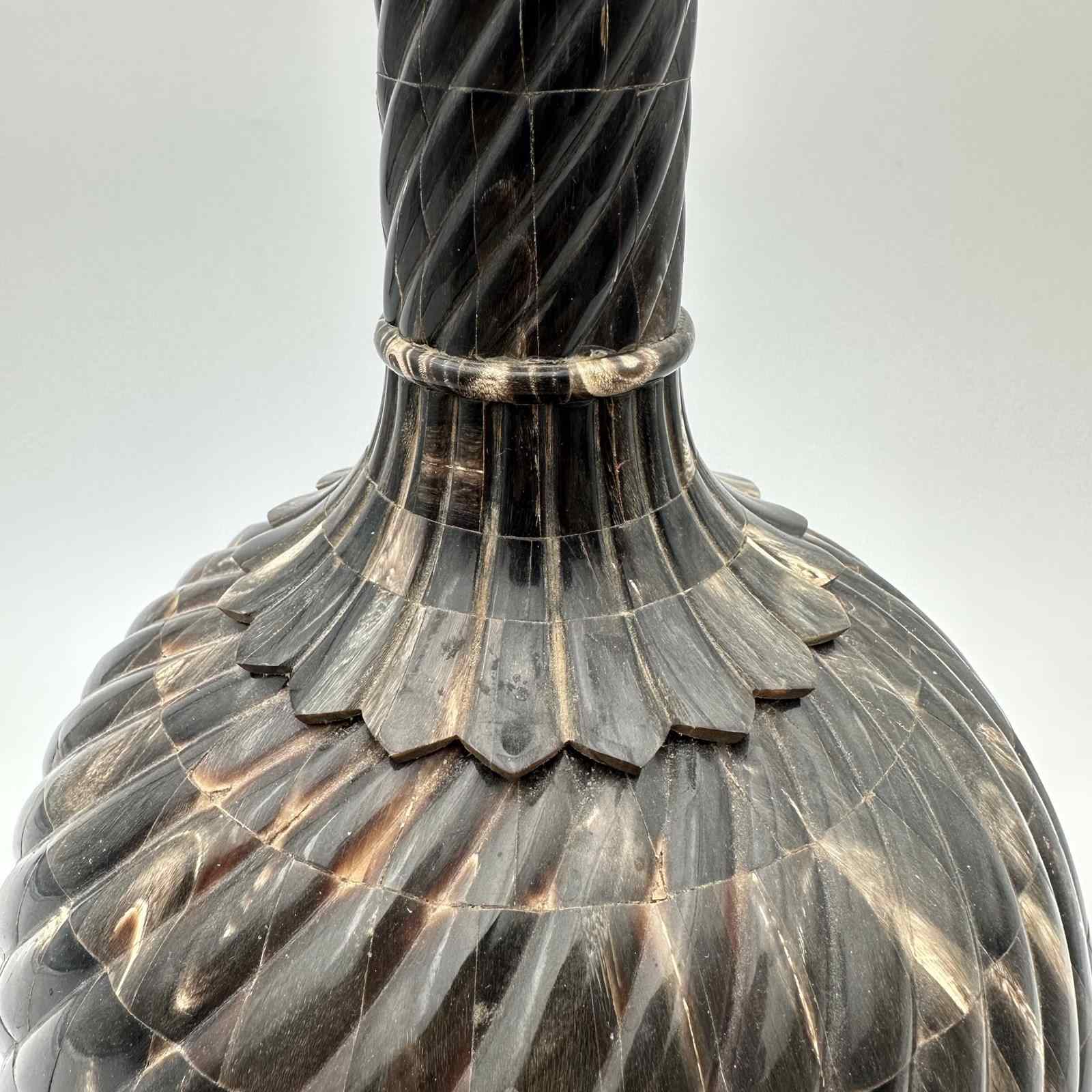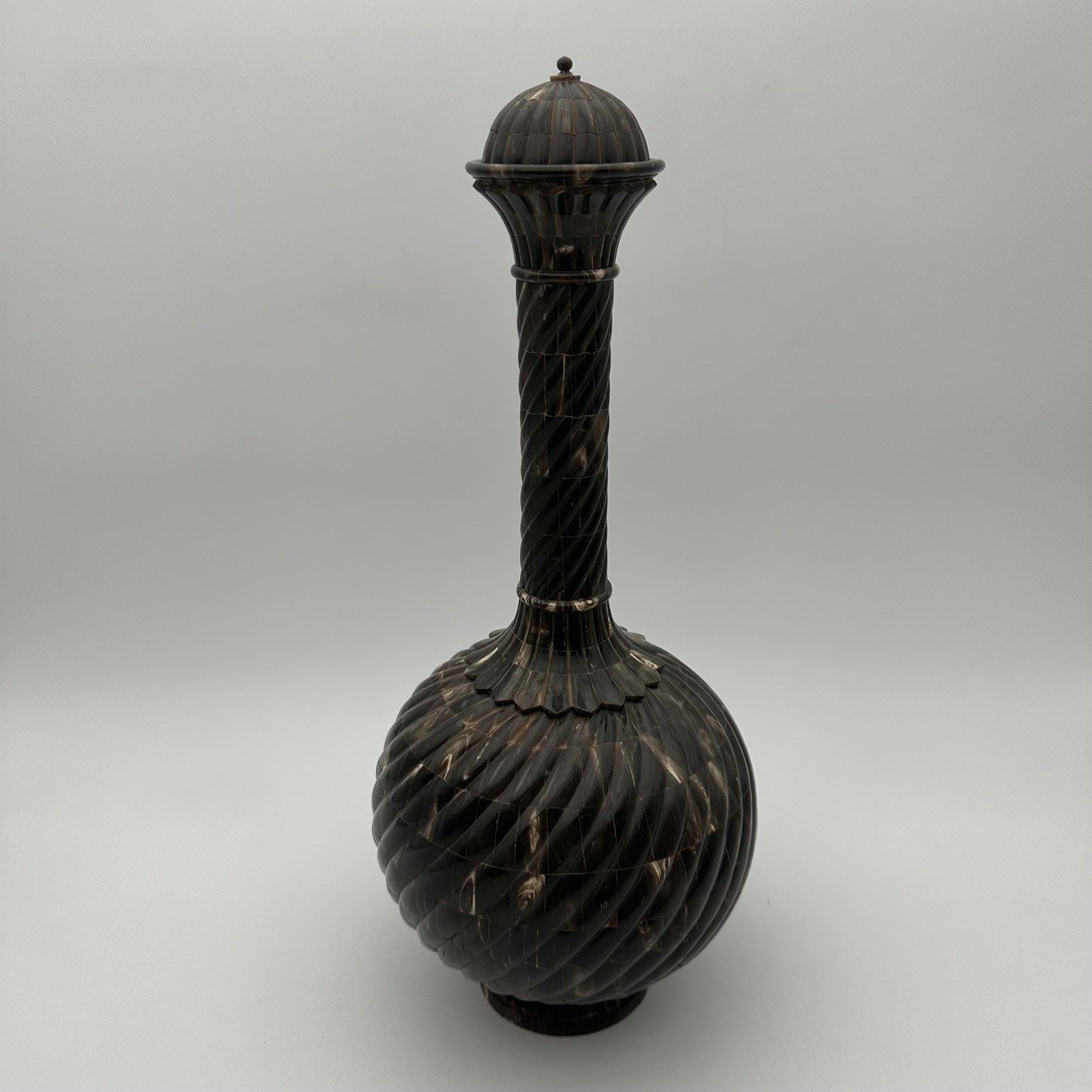 Standing an impressive 43 cm tall, the piece commands attention with its harmonious proportions. The turned wooden core, forming a generous 20 cm bulbous body, is entirely covered in a luxurious horn veneer worked into twisted gadroons. This raised pattern subtly catches the light on the brown and translucent reflections of the organic material. The refinement is taken to its peak with an elegant neck and stopper crafted from solid brass, delicately crowned with a decorative pearl finial. As a remarkable hidden detail, the base of the bottle reveals a delicate inlay depicting a lotus flower, the ultimate symbol of spiritual awakening.