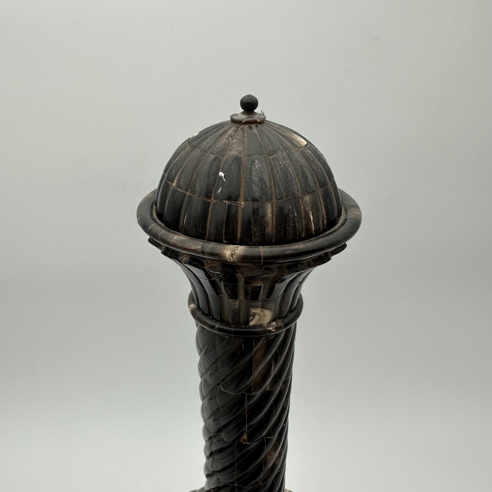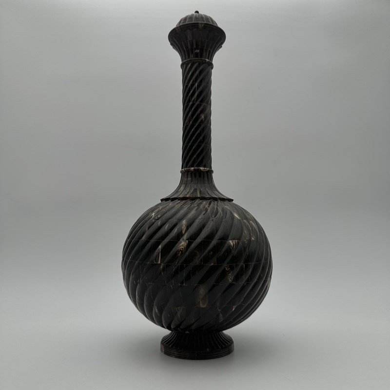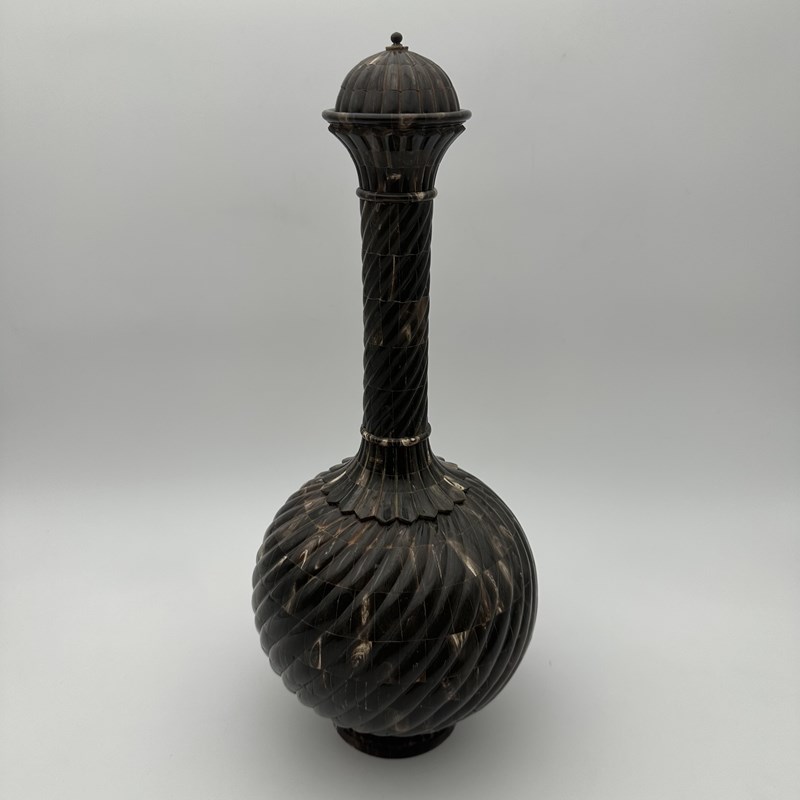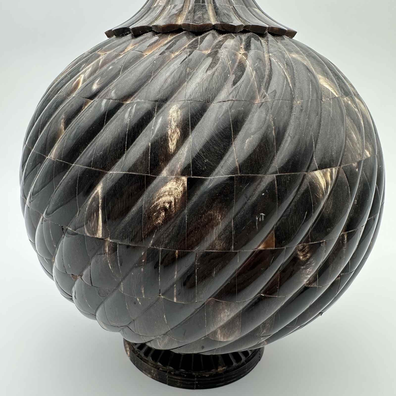 Standing an impressive 43 cm tall, the piece commands attention with its harmonious proportions. The turned wooden core, forming a generous 20 cm bulbous body, is entirely covered in a luxurious horn veneer worked into twisted gadroons. This raised pattern subtly catches the light on the brown and translucent reflections of the organic material. The refinement is taken to its peak with an elegant neck and stopper crafted from solid brass, delicately crowned with a decorative pearl finial. As a remarkable hidden detail, the base of the bottle reveals a delicate inlay depicting a lotus flower, the ultimate symbol of spiritual awakening.
