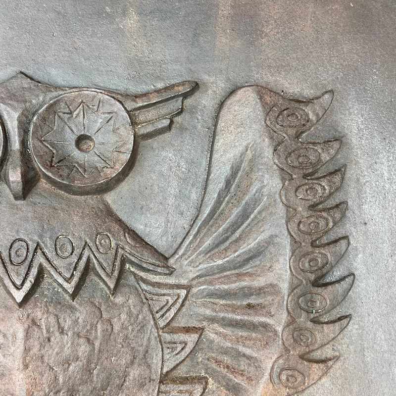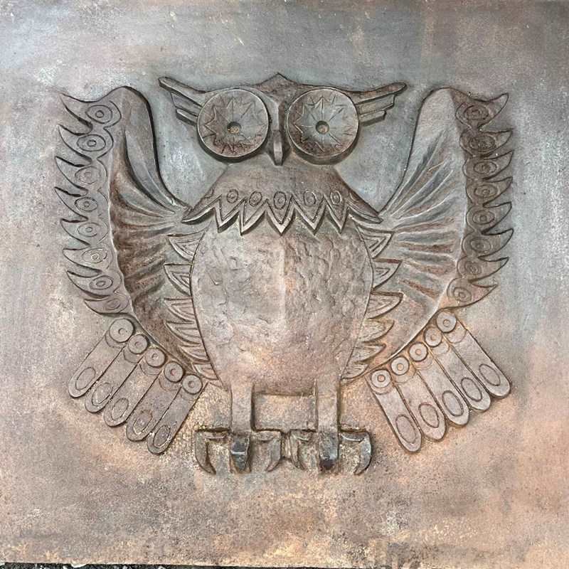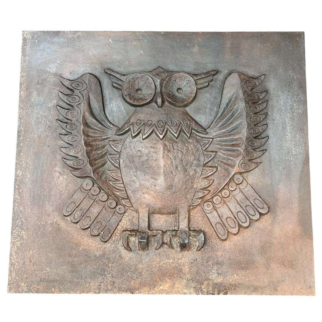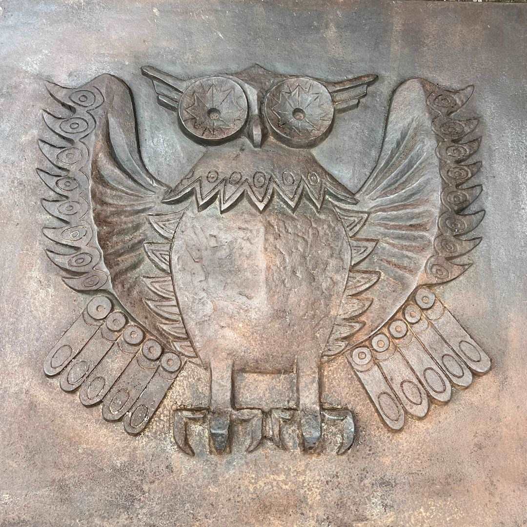 Large modernist cast iron fireback showing an owl. French work Signed by Lucas and Stamped by Stern Circa 1970