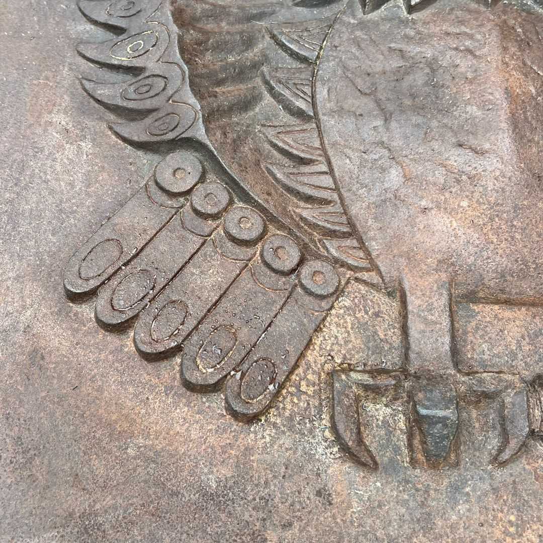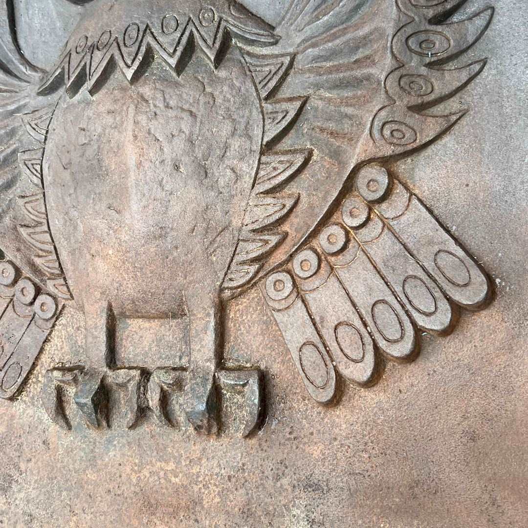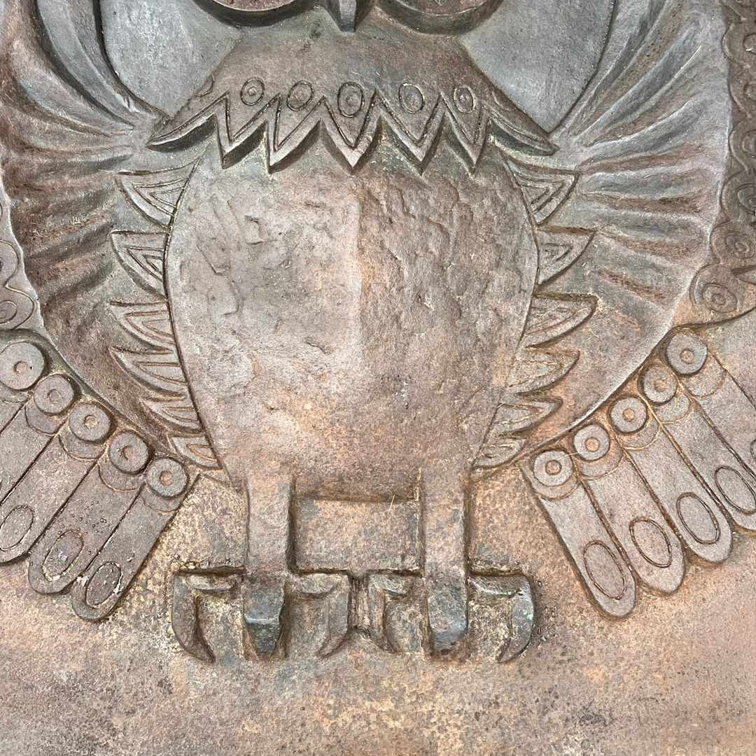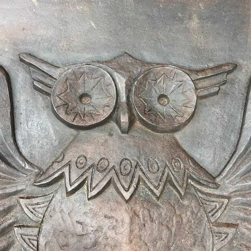 Large modernist cast iron fireback showing an owl. French work Signed by Lucas and Stamped by Stern Circa 1970