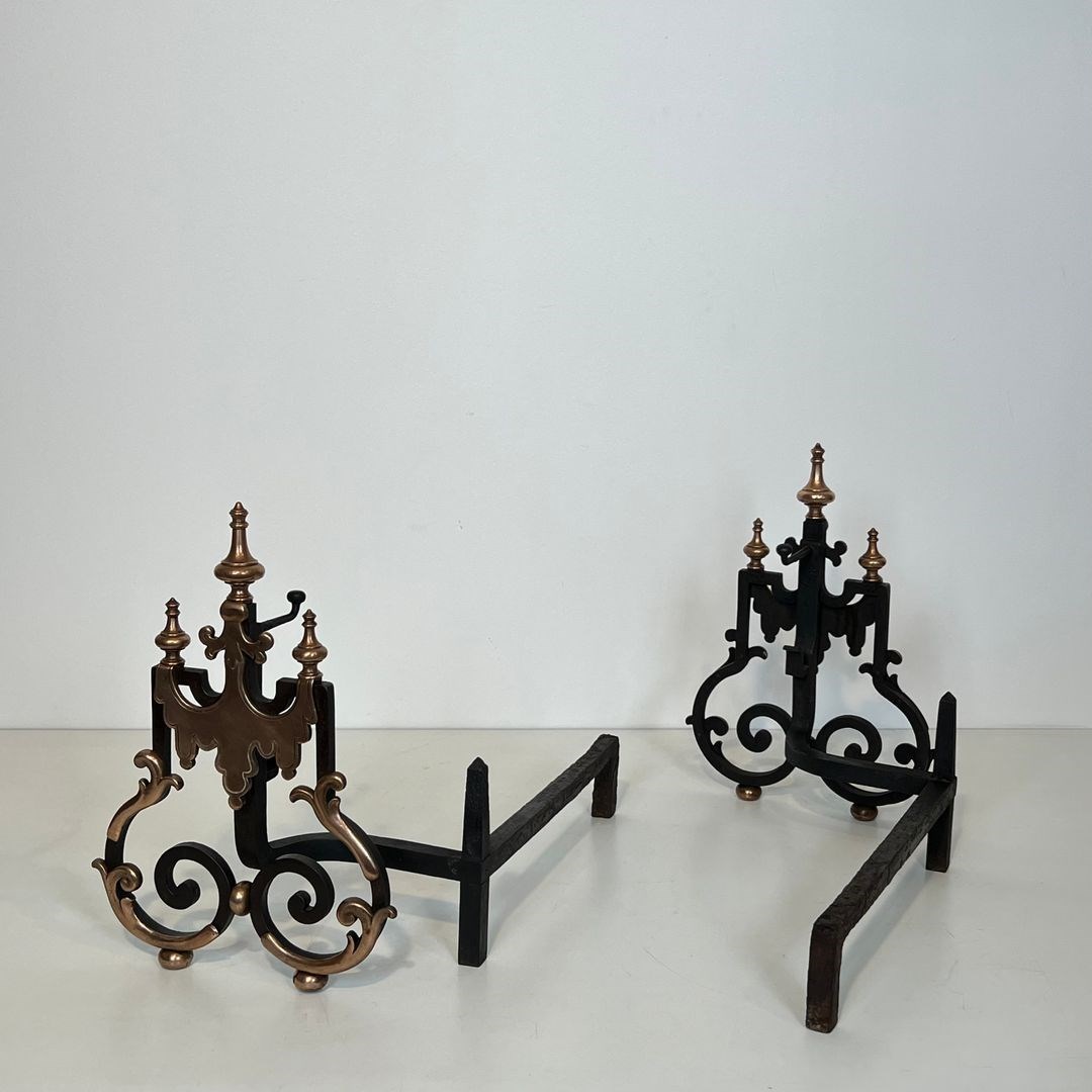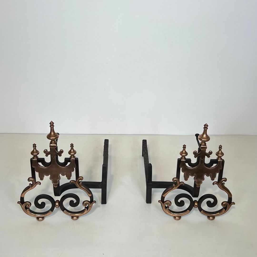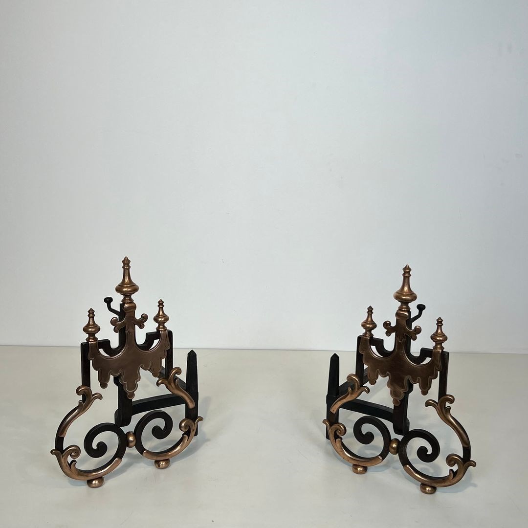 Large pair of wrought iron and copper andirons. French work. 19th Century