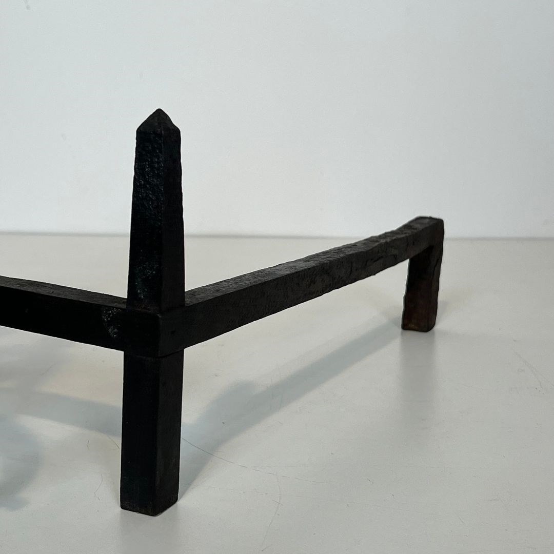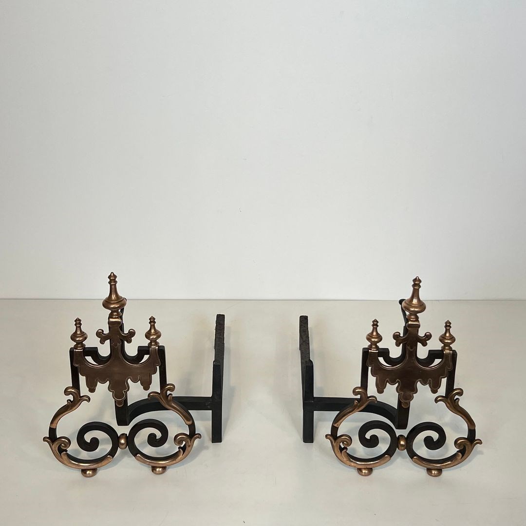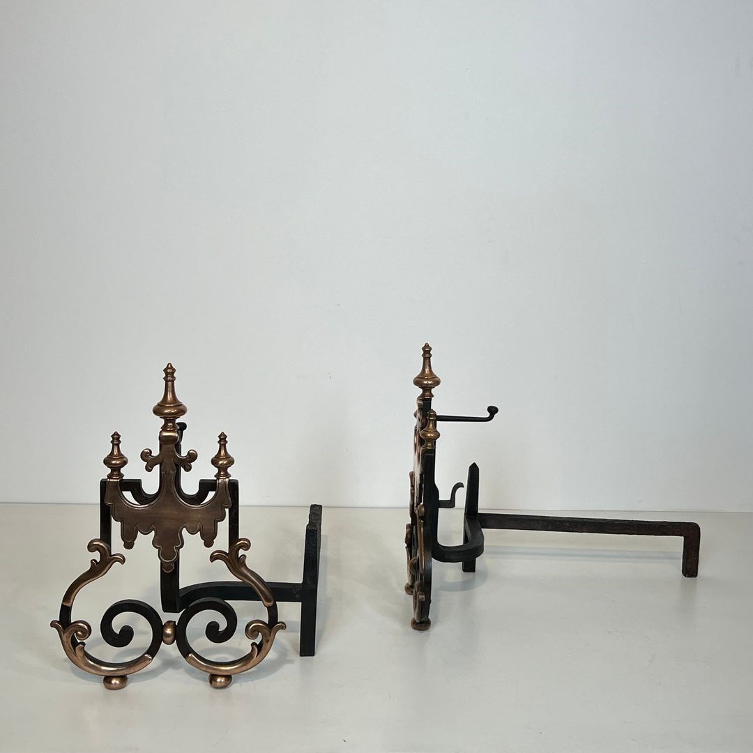 Large pair of wrought iron and copper andirons. French work. 19th Century