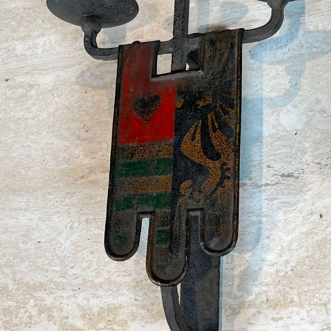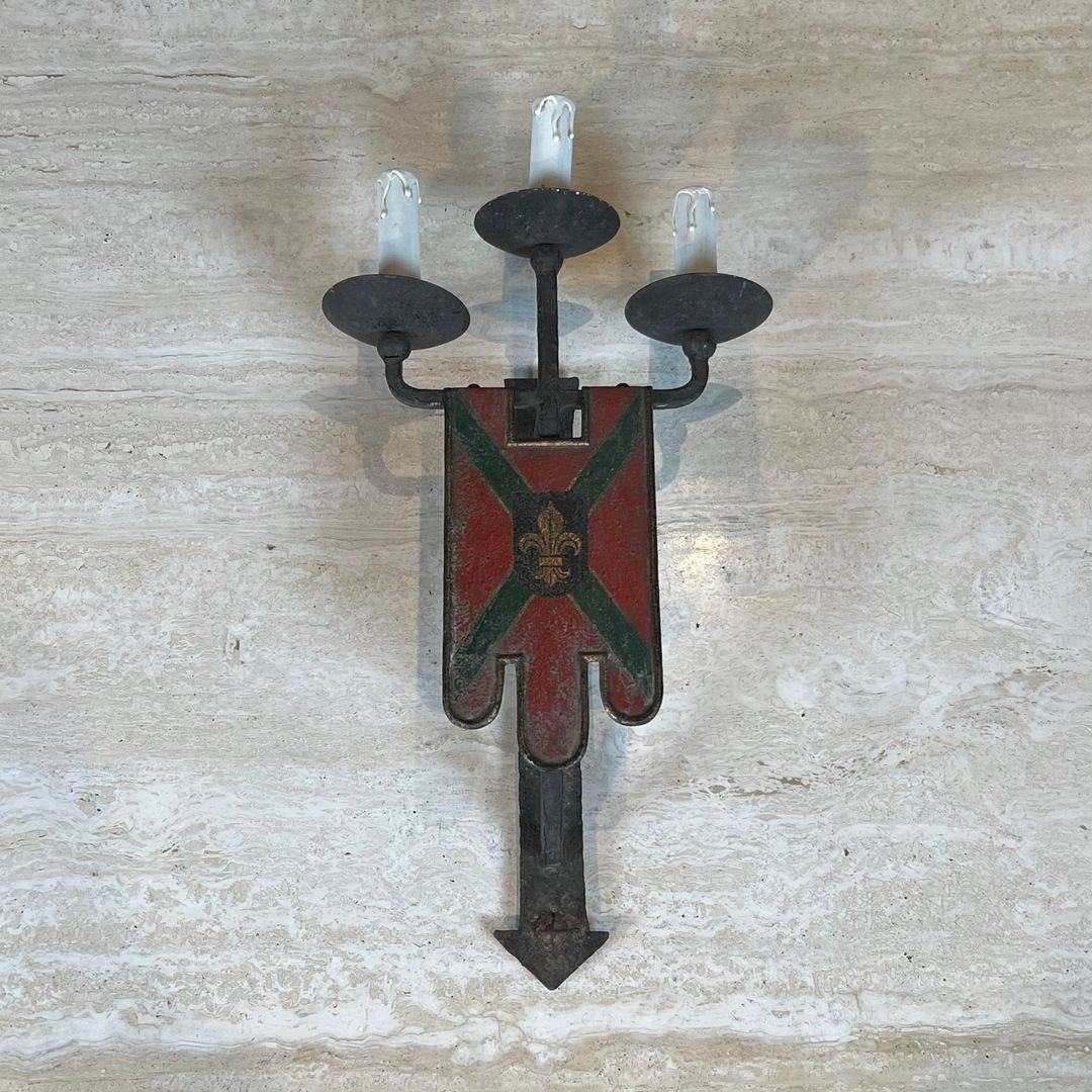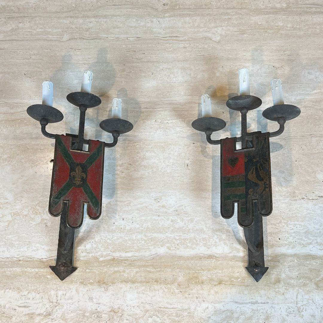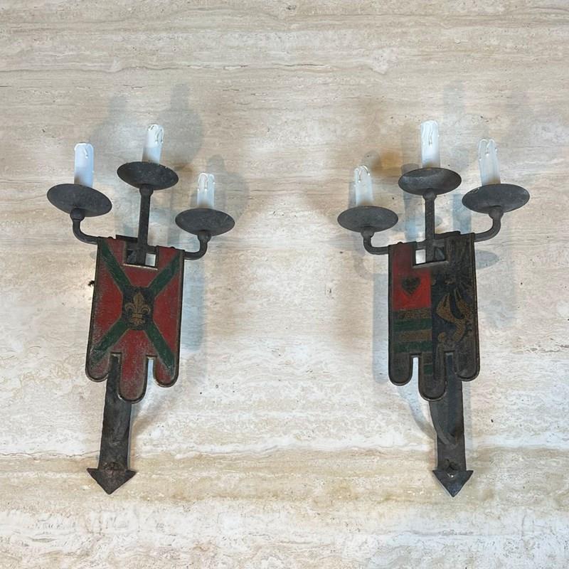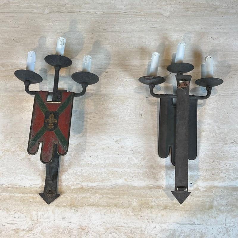 Large pair of wrought iron wall lights with 3 Arms comprising coat of arms in its center. French work in the Gothic Style. Circa 1940