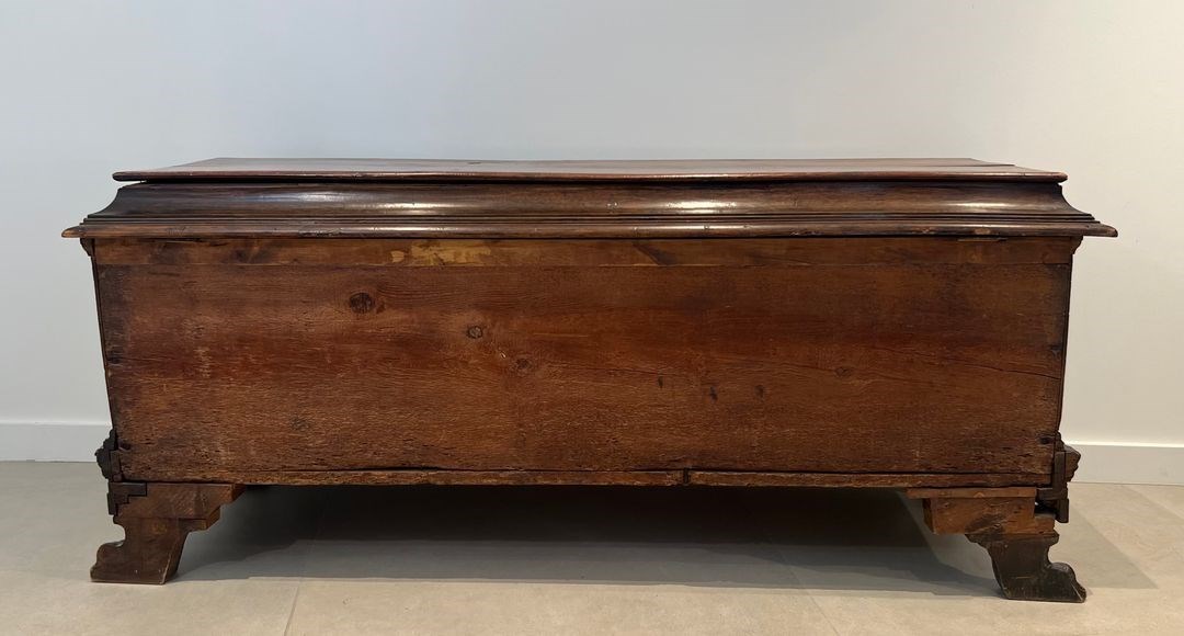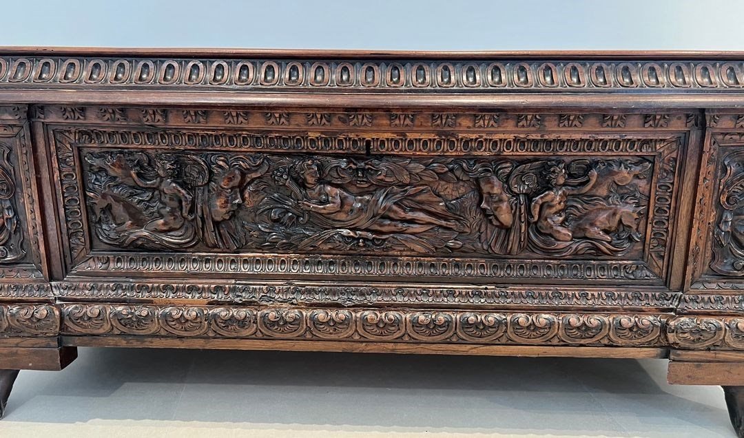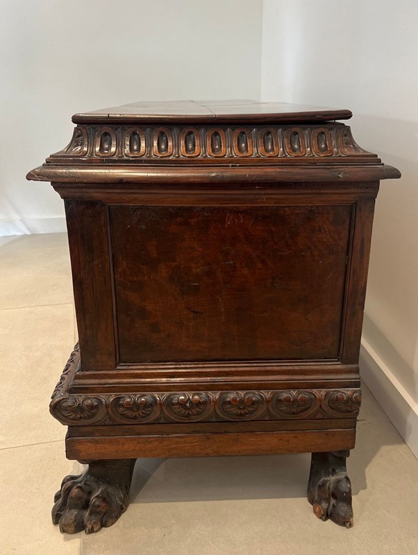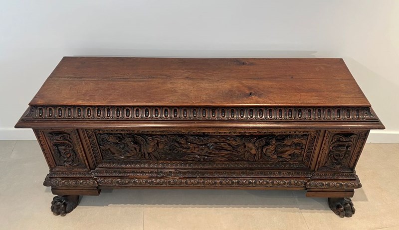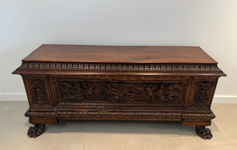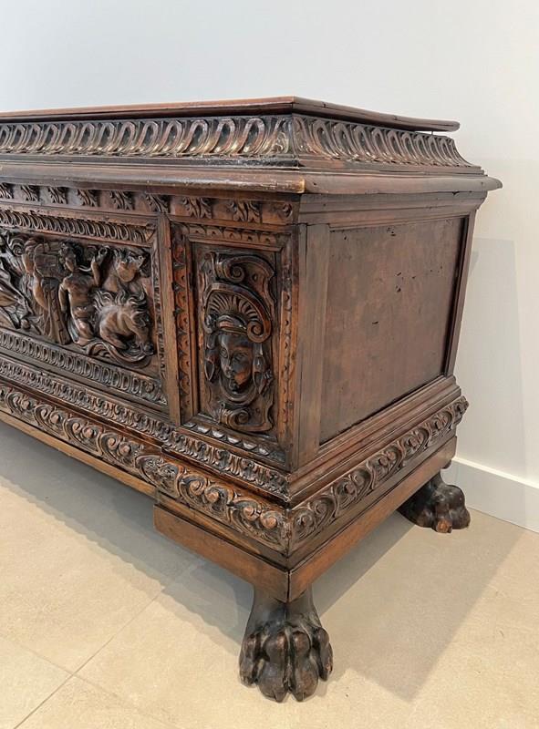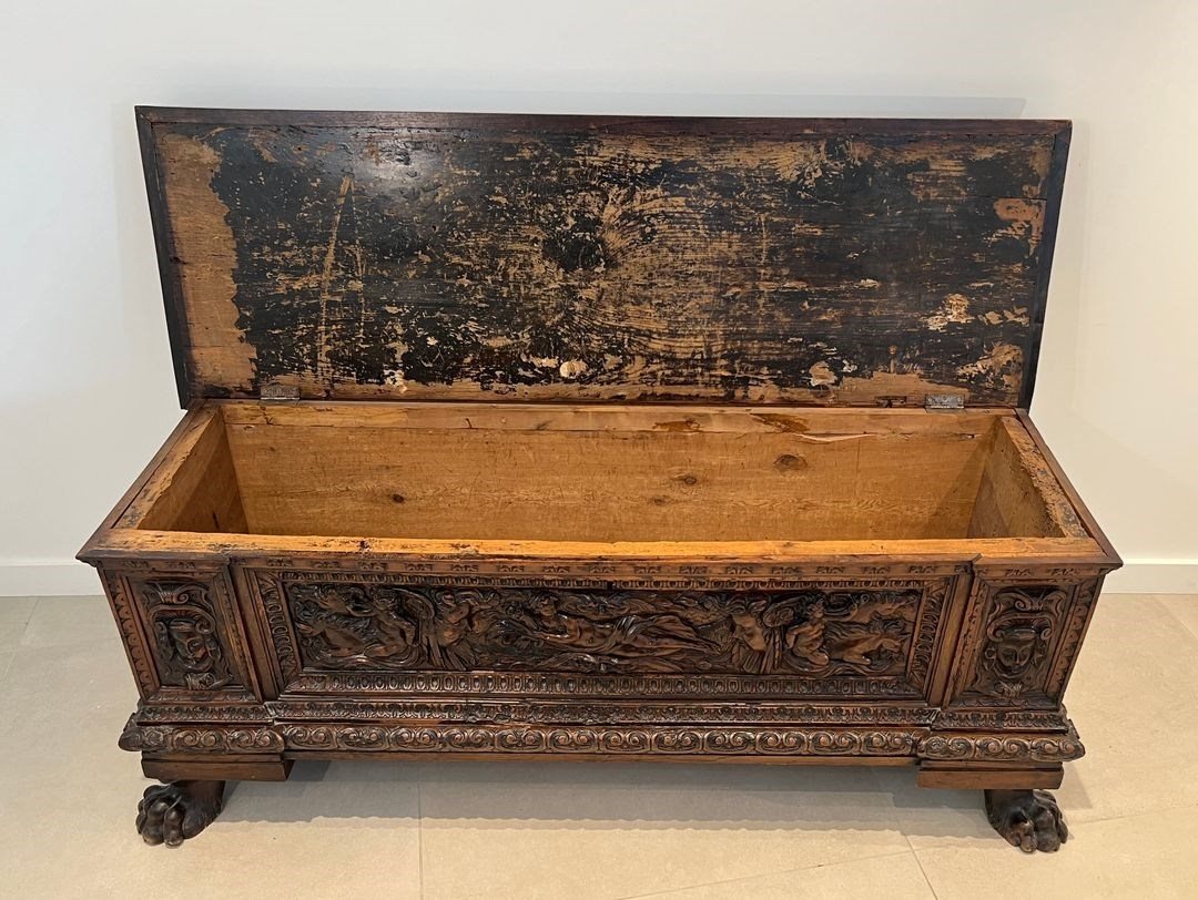 Large richely carved walnut cassonne chest resting on four claw feet. Italian Renaissance period. 17th century