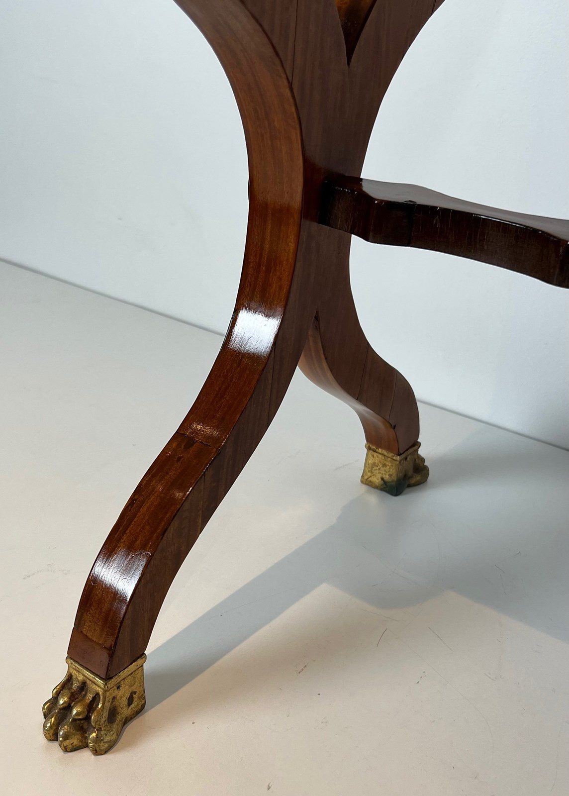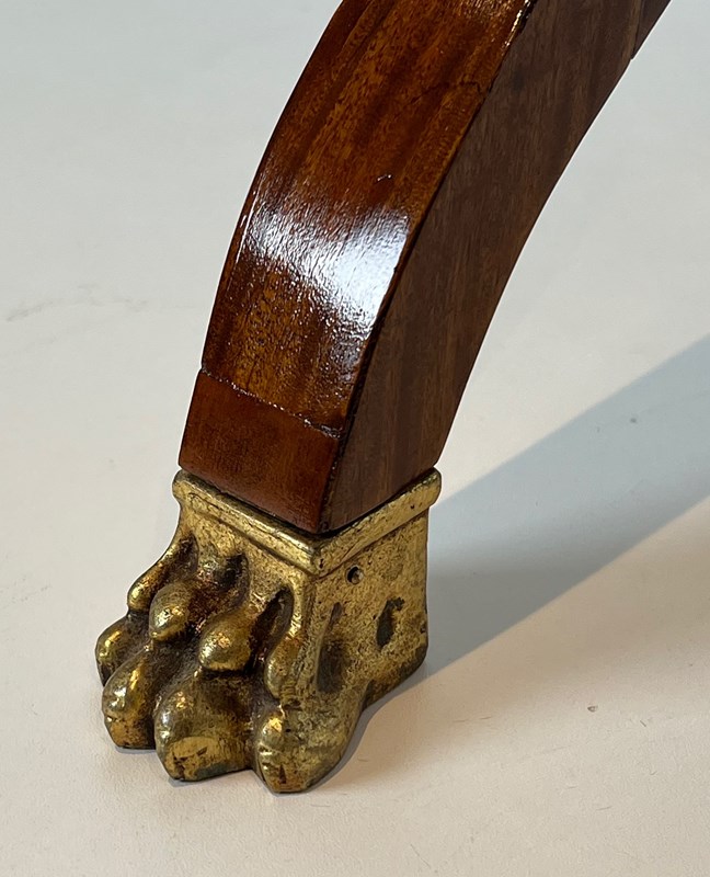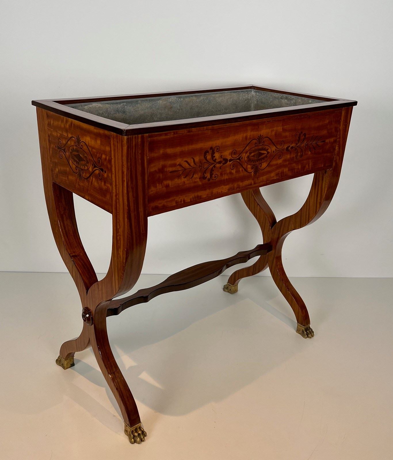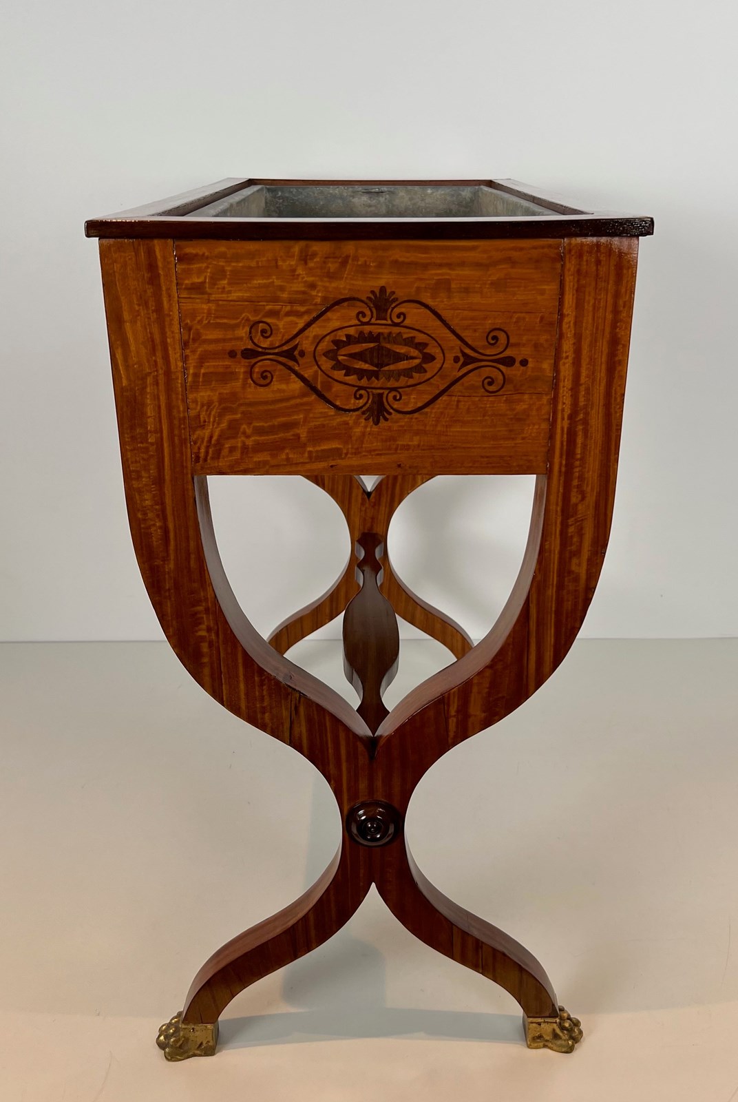 Mahogany planter inlaid with amaranth, featuring a zinc tub, an "X" shaped base and bronze claw feet. French work from Charles X period. Circa 1830