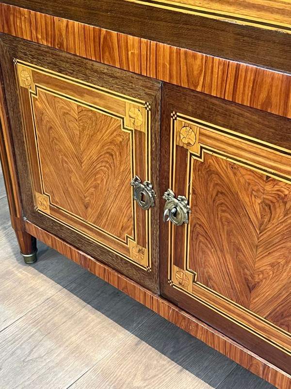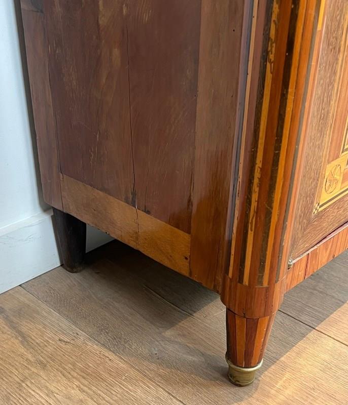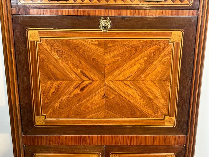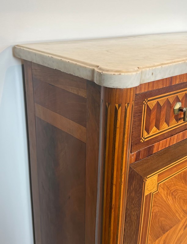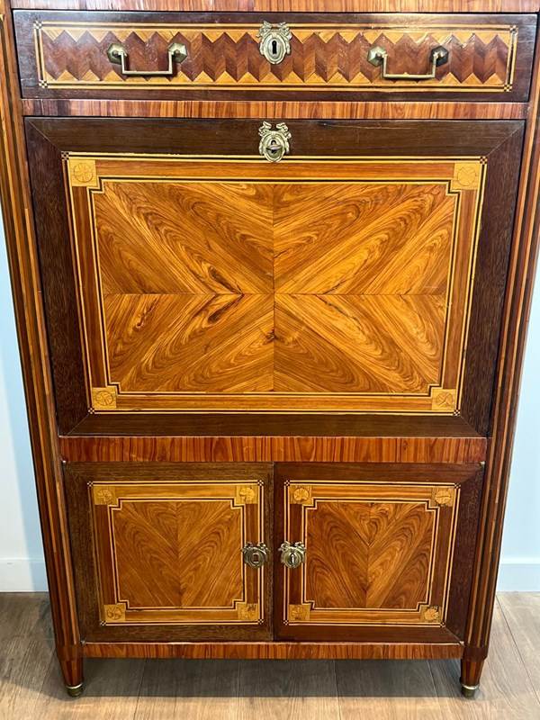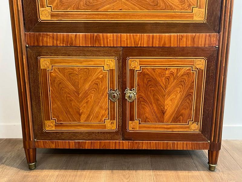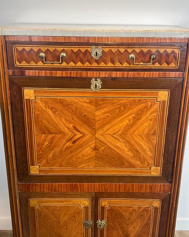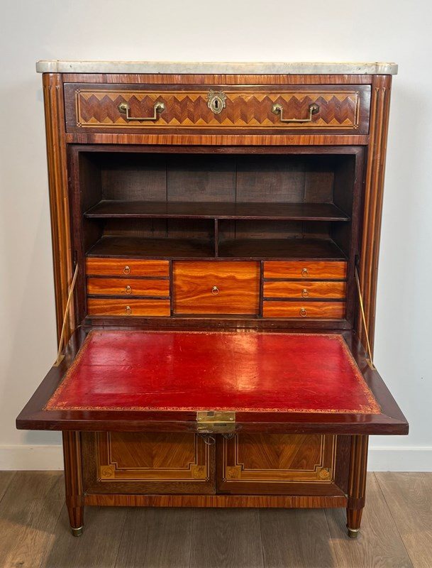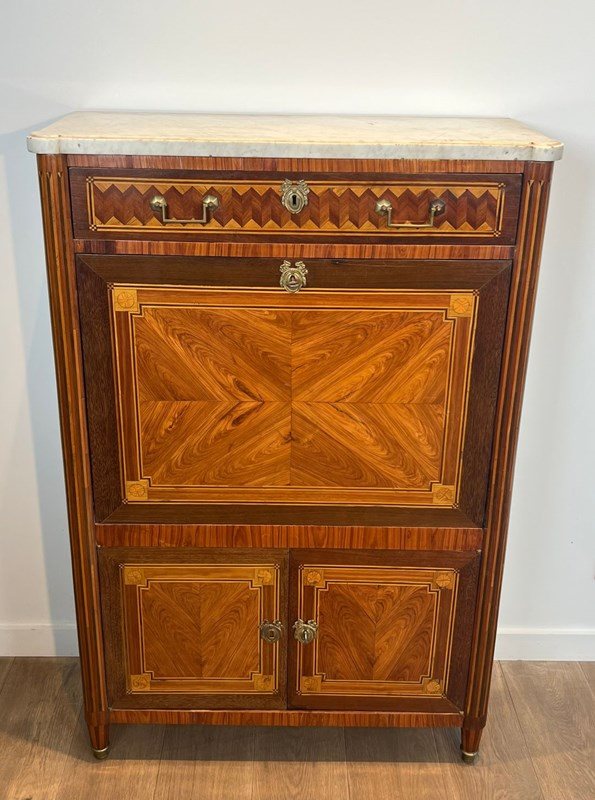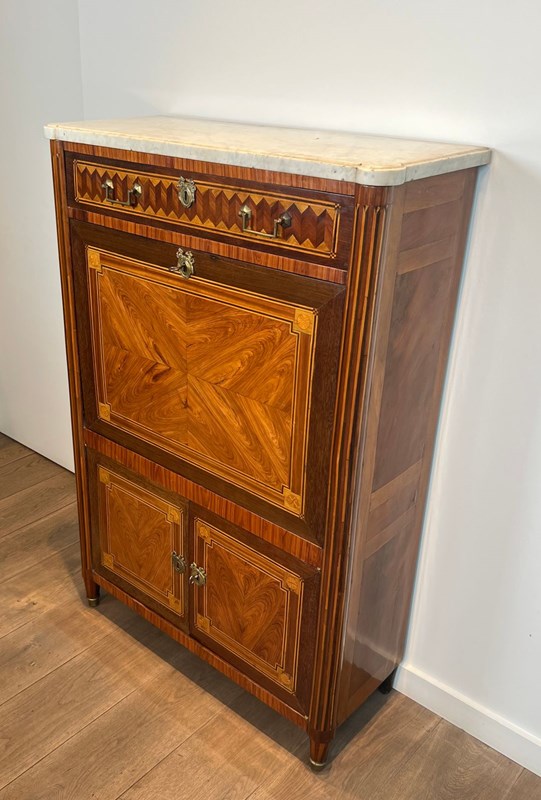 Marquetry drop-leaf secretary on an oak frame opening with a drawer, a drop-leaf door and two lower leaves and decorated with a Carrara marble slab. French work from the Louis XVI period. Circa 1800