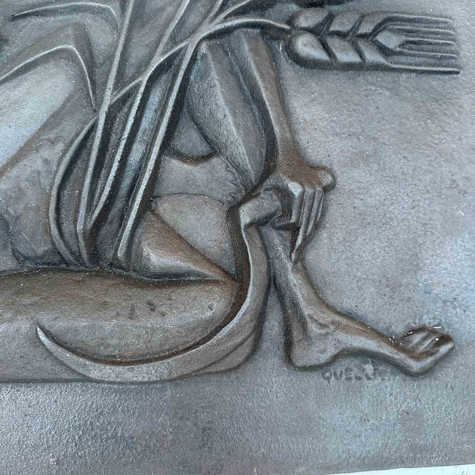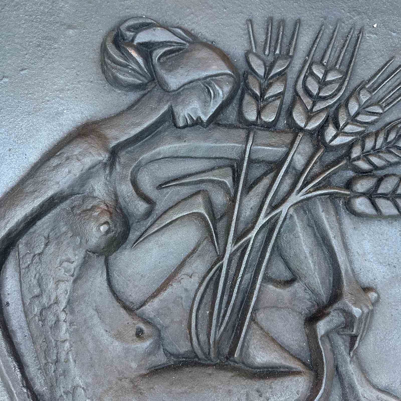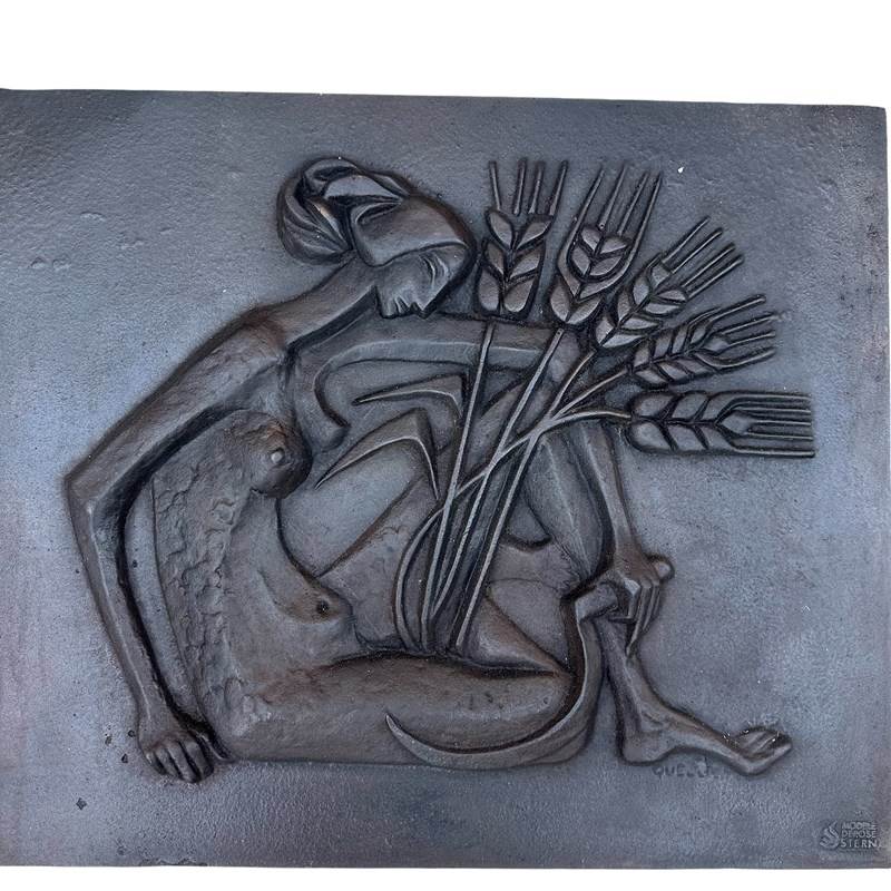 Modernist Cast Iron Fireback Representing a Nude Woman with a Scythe and Ears of Wheat. Foundry Mark Stern and Signed M Quellier? French. Circa 1950