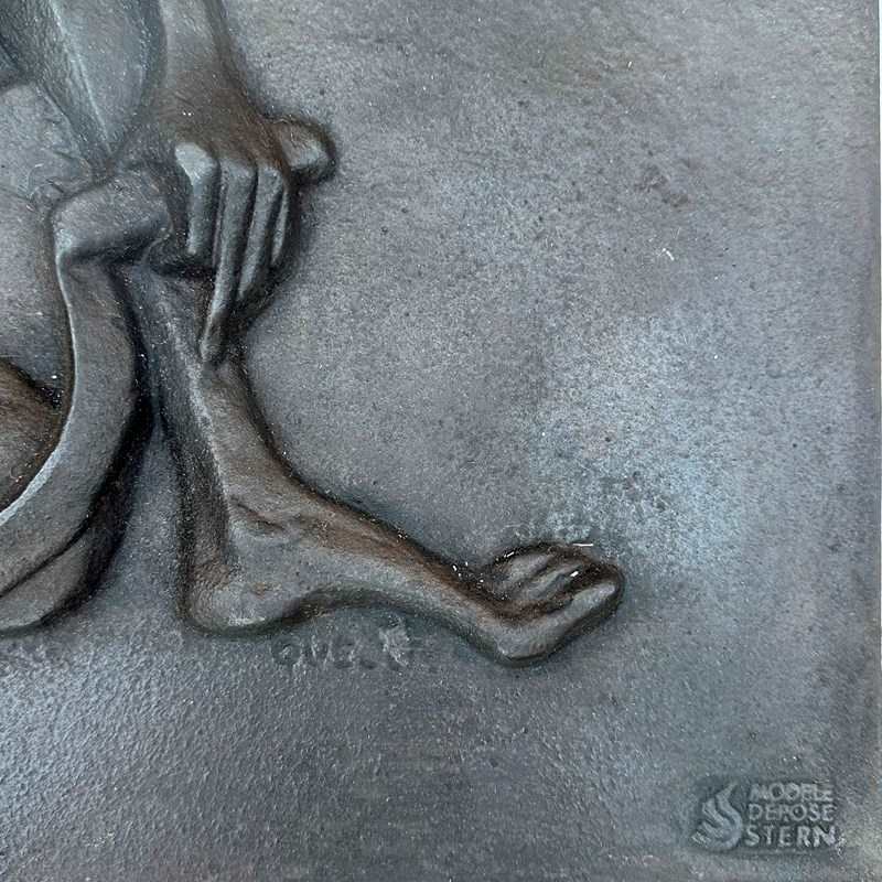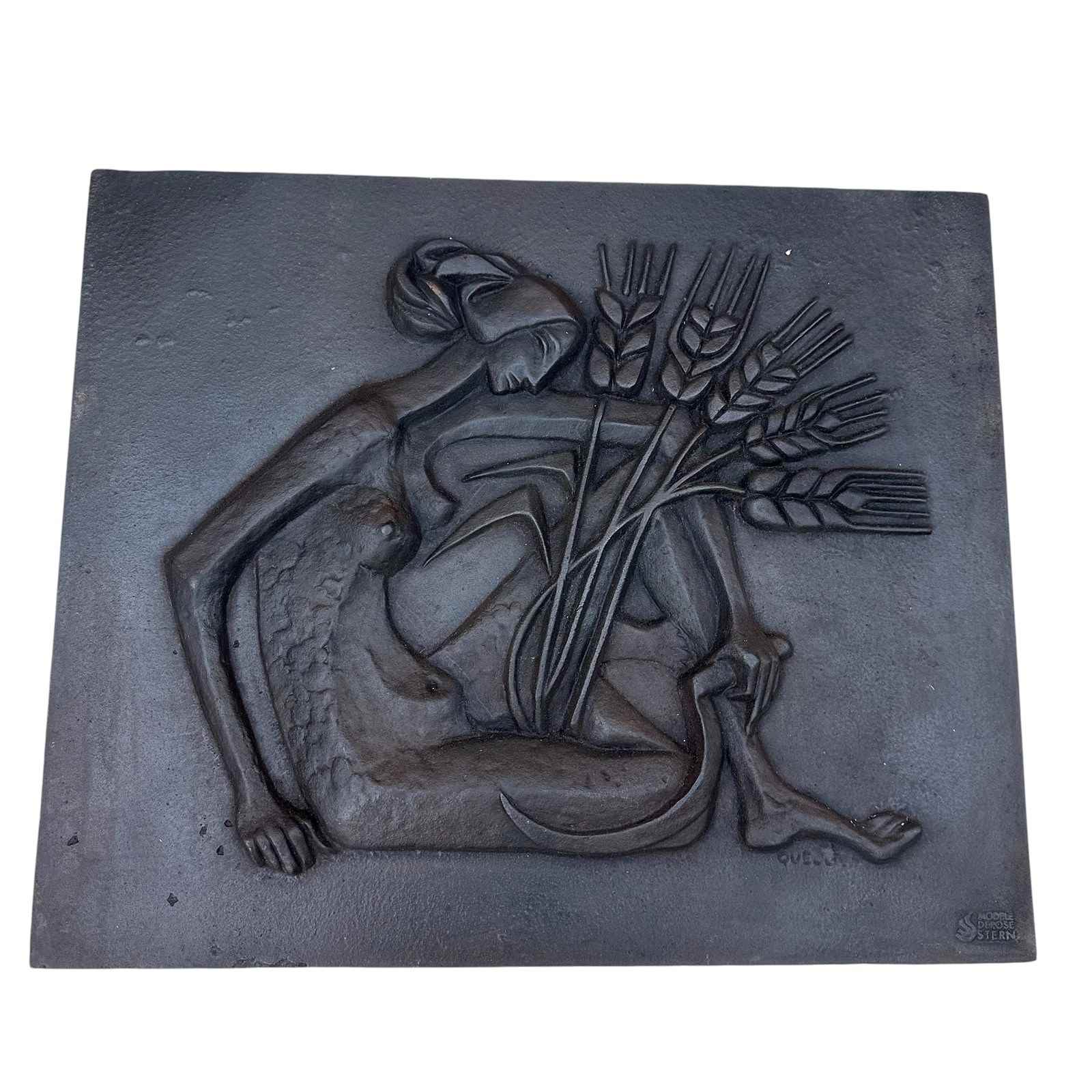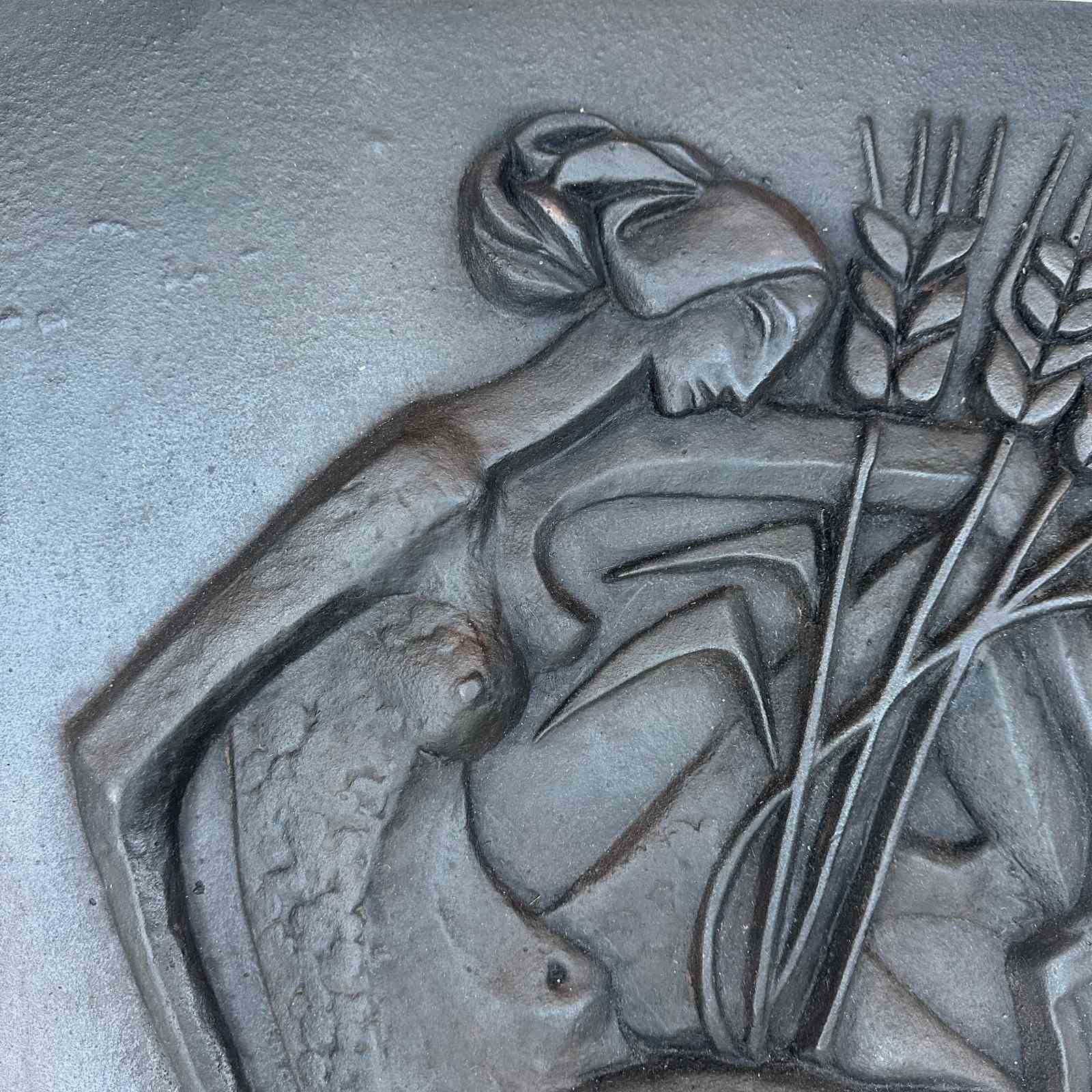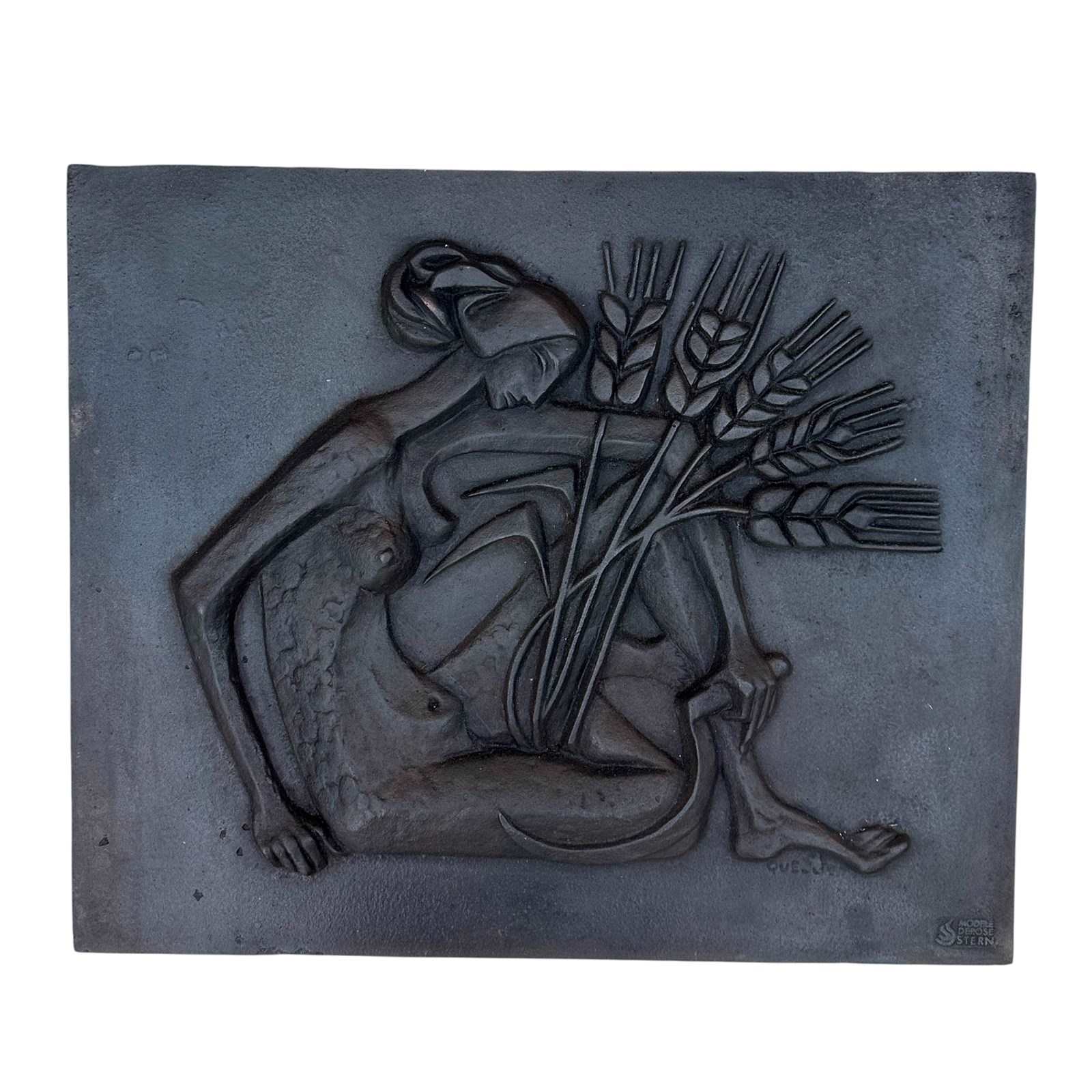 Modernist Cast Iron Fireback Representing a Nude Woman with a Scythe and Ears of Wheat. Foundry Mark Stern and Signed M Quellier? French. Circa 1950