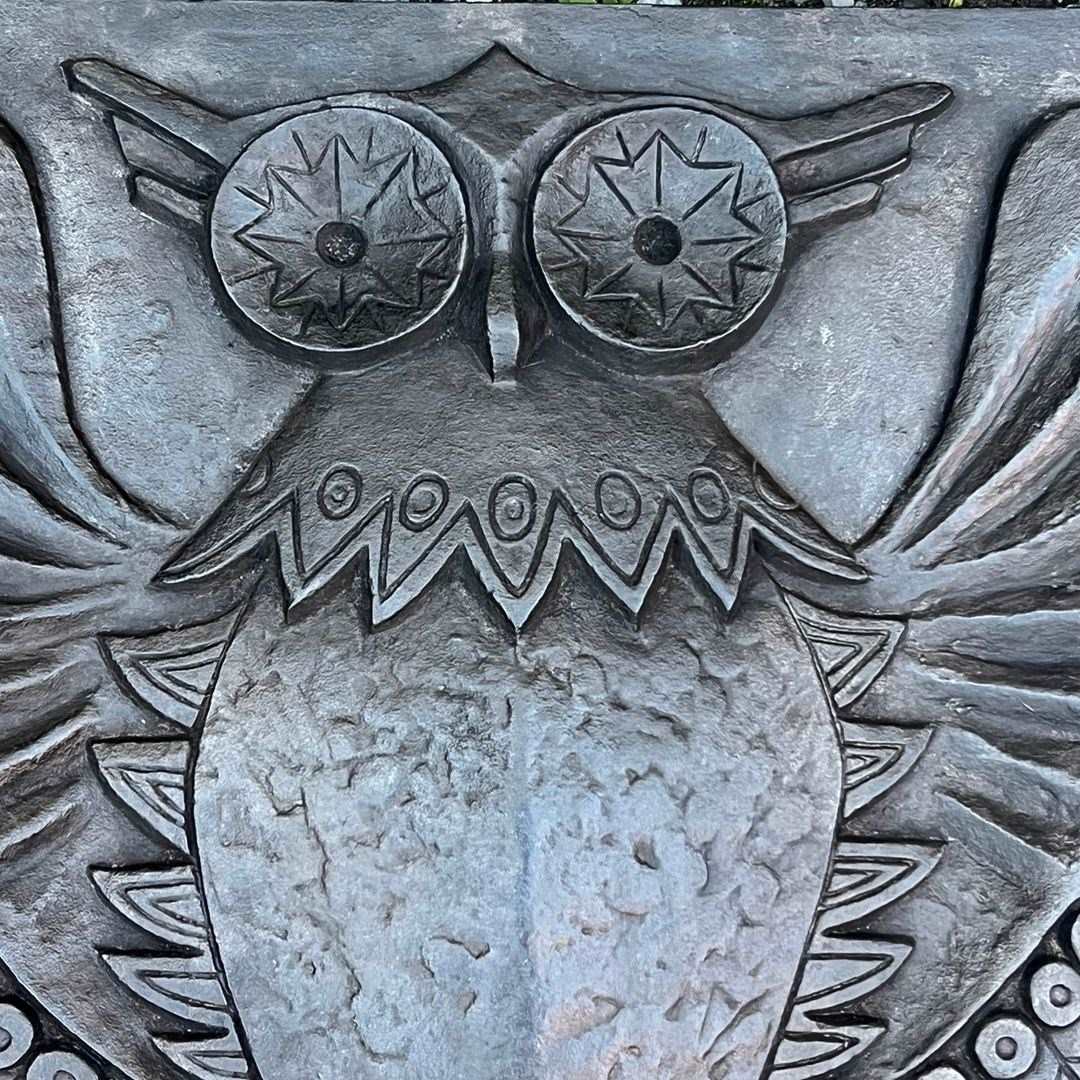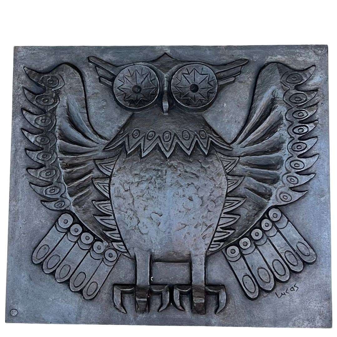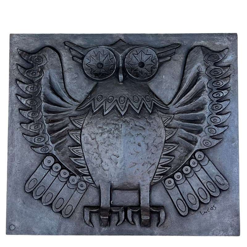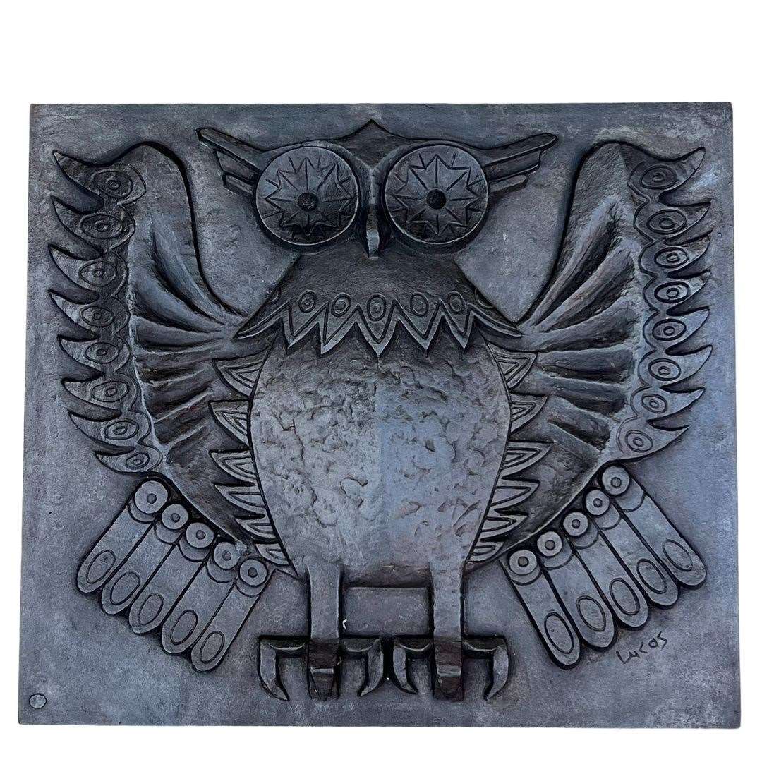 Modernist cast iron fireback showing an owl. French work Signed by Lucas and Stamped by Stern Circa 1970