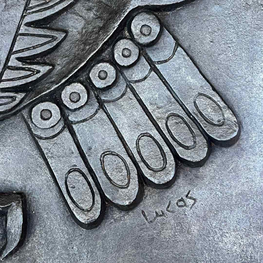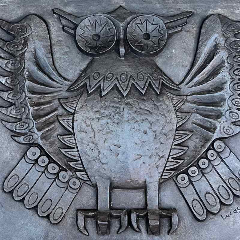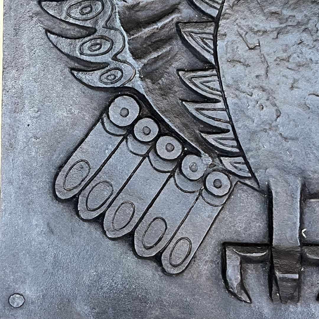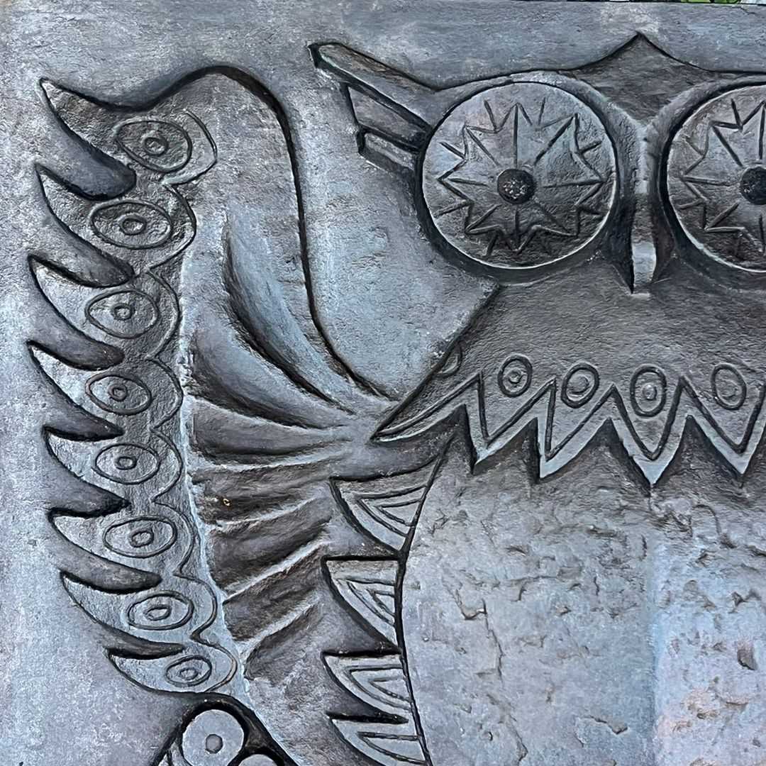 Modernist cast iron fireback showing an owl. French work Signed by Lucas and Stamped by Stern Circa 1970