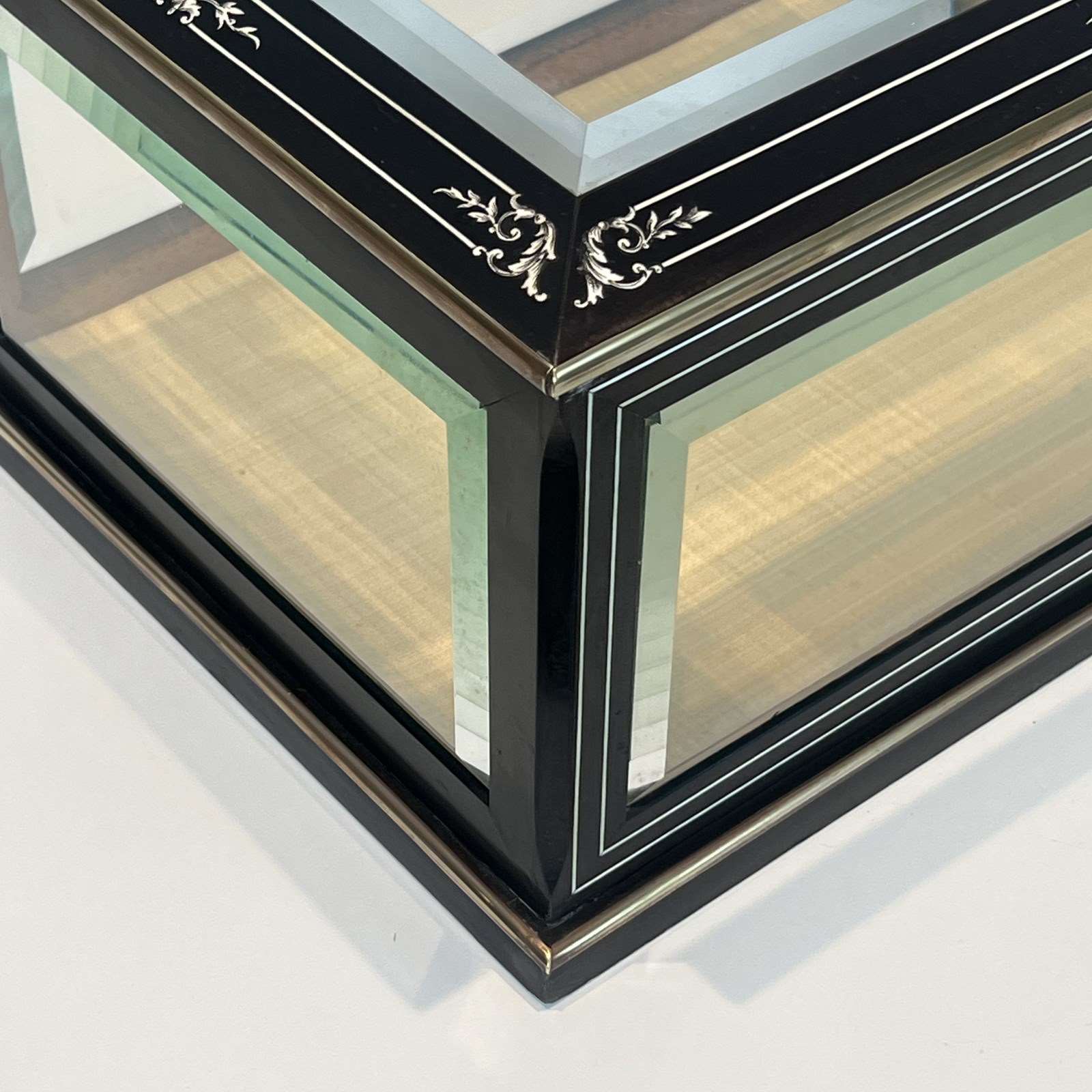 Napoleon III style jewelry box in black lacquered wood with beveled glass inlaid with mother-of-pearl and brass trim. French work. Circa 1880