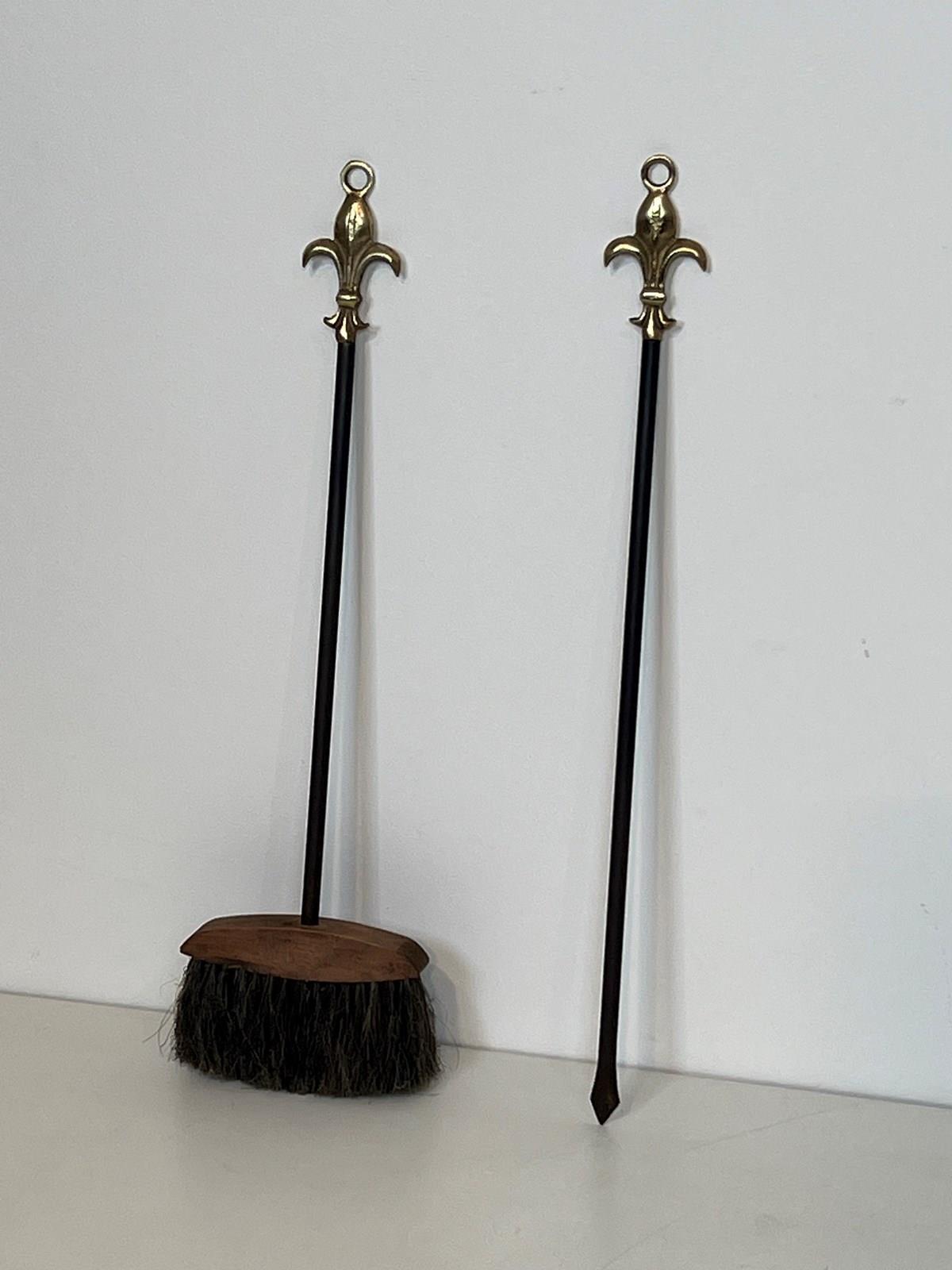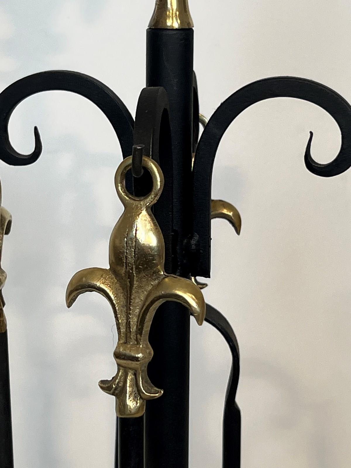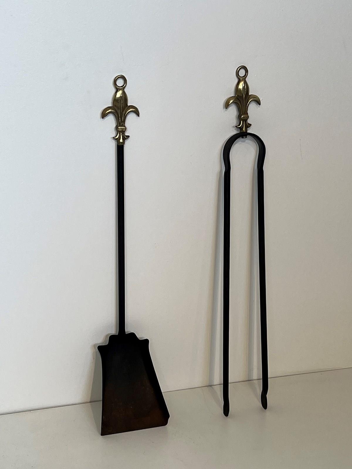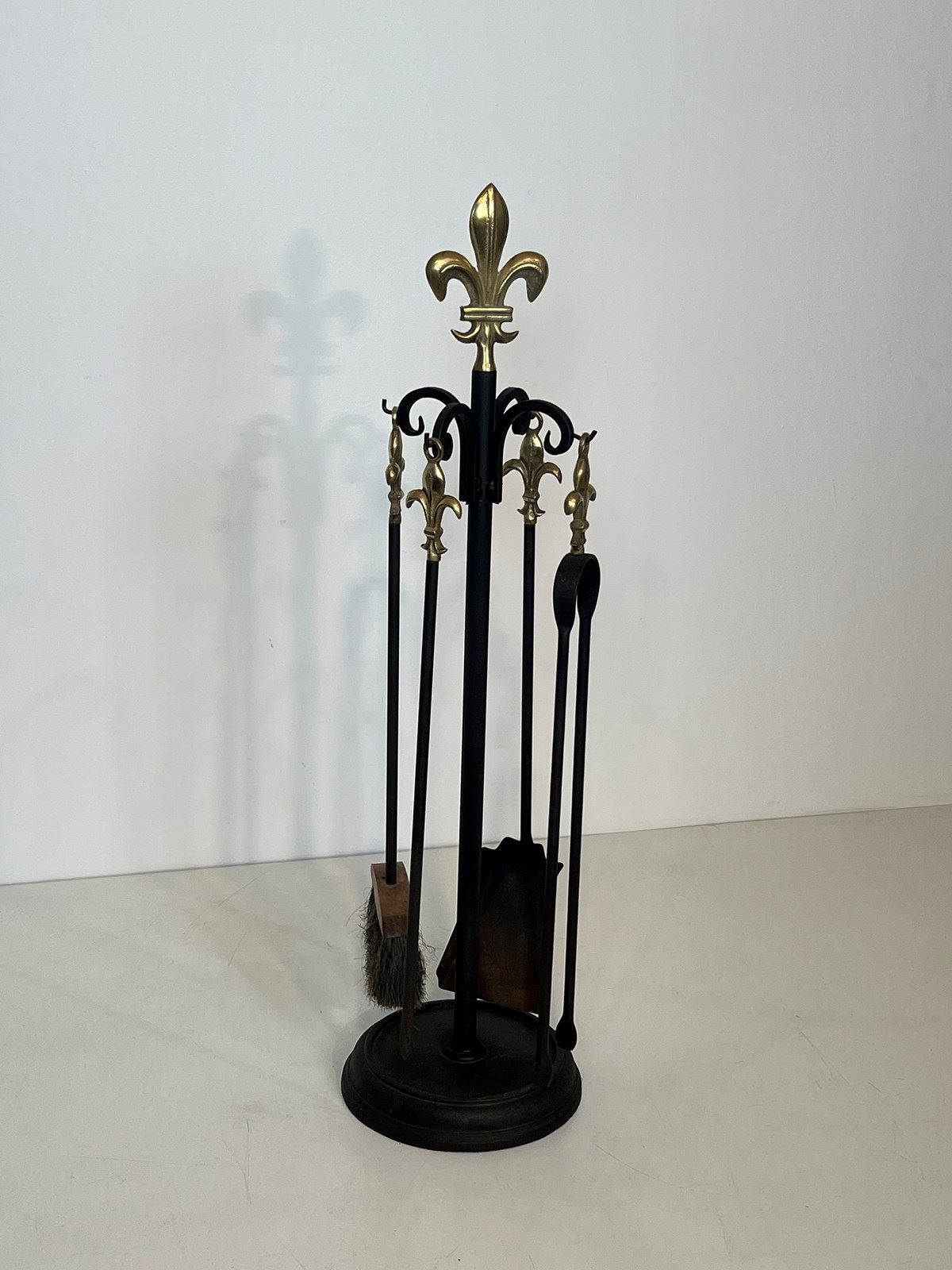 Neoclassical style black lacquered metal and brass fireplace tools with lily flowers. French work. Circa 1970