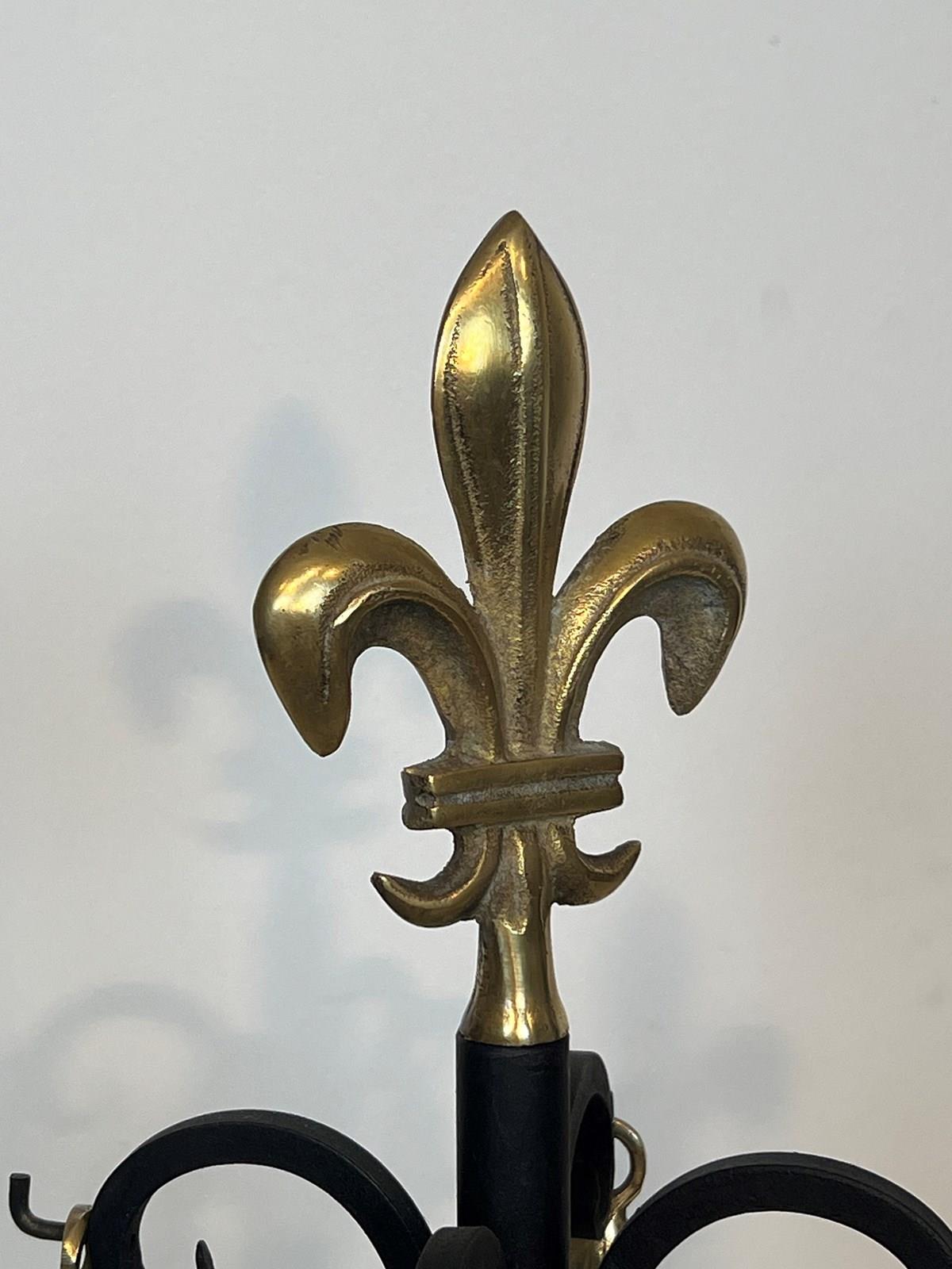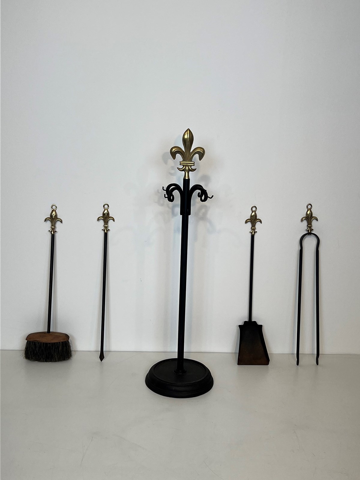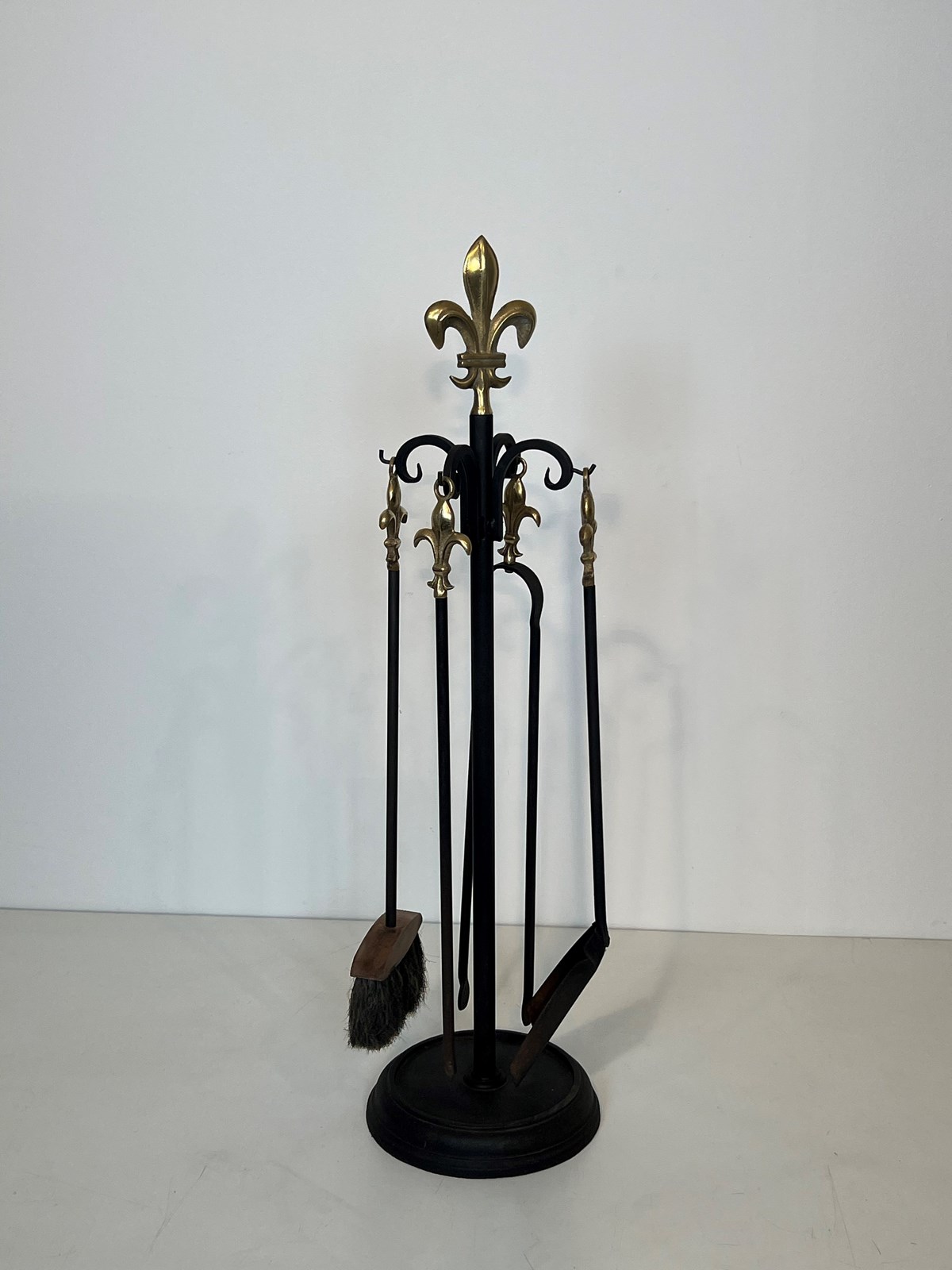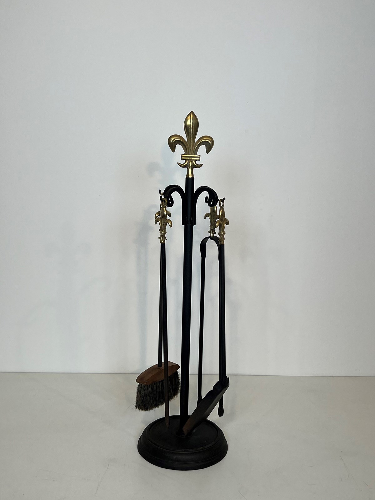 Neoclassical style black lacquered metal and brass fireplace tools with lily flowers. French work. Circa 1970