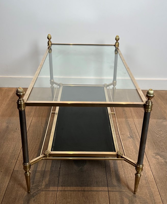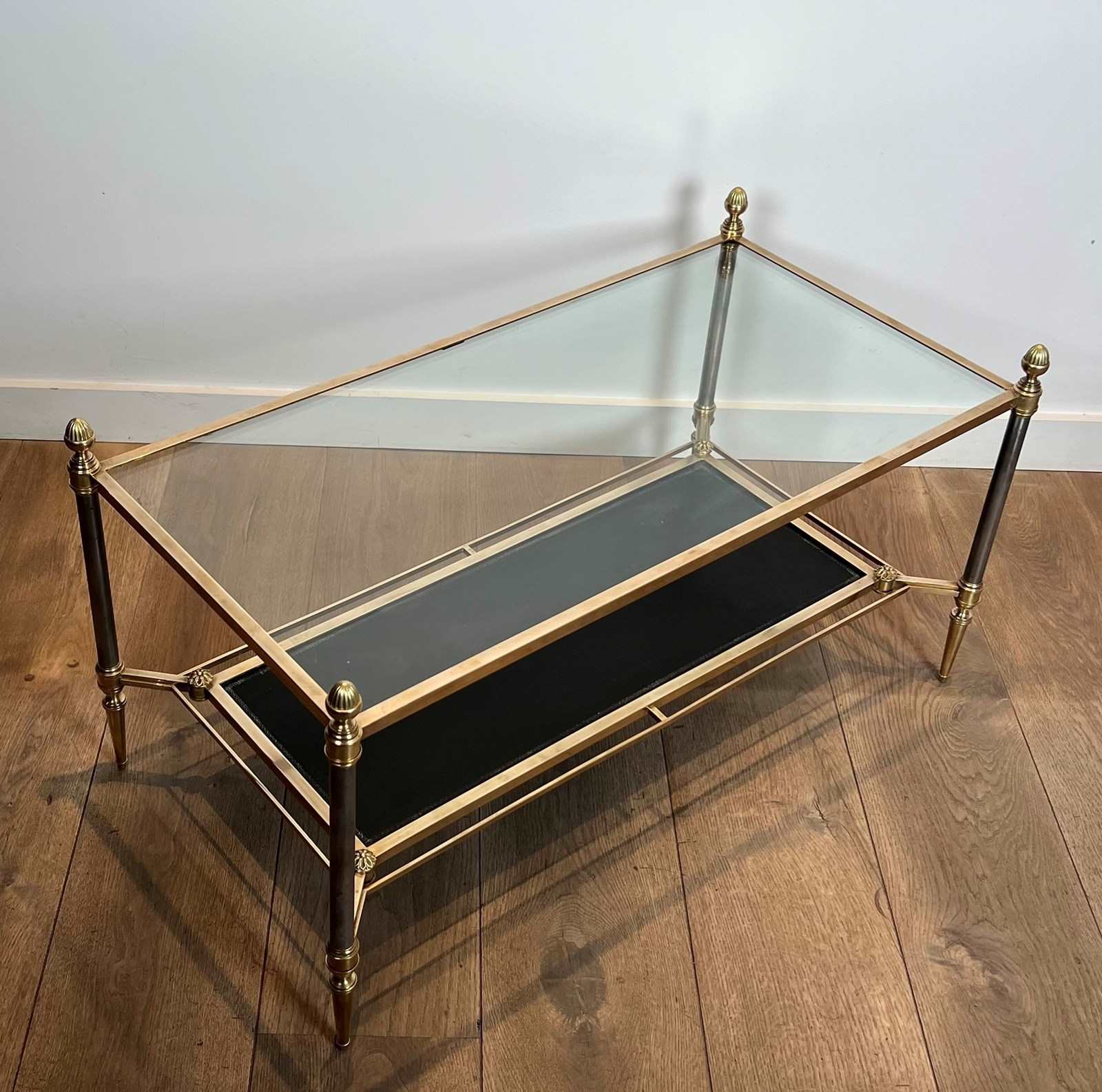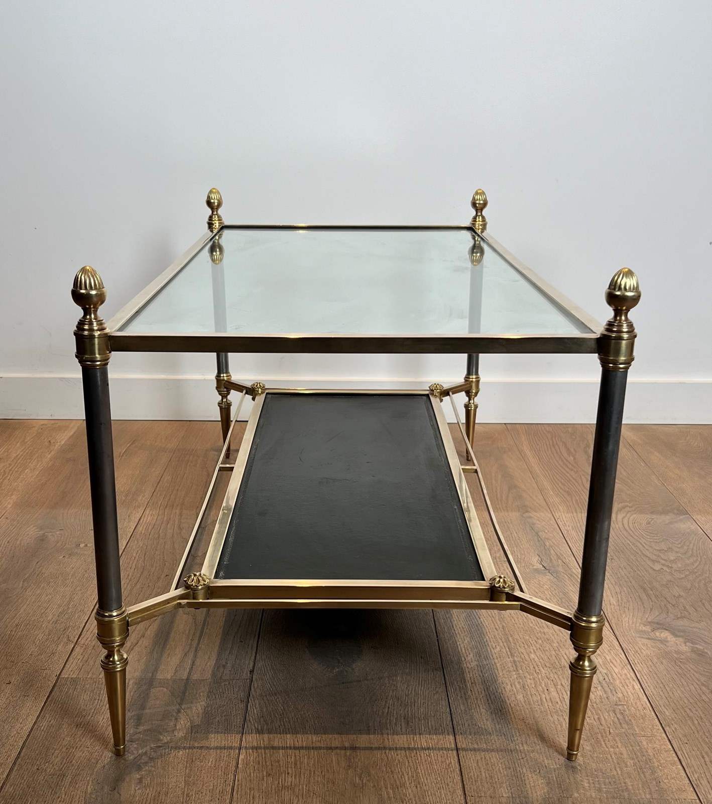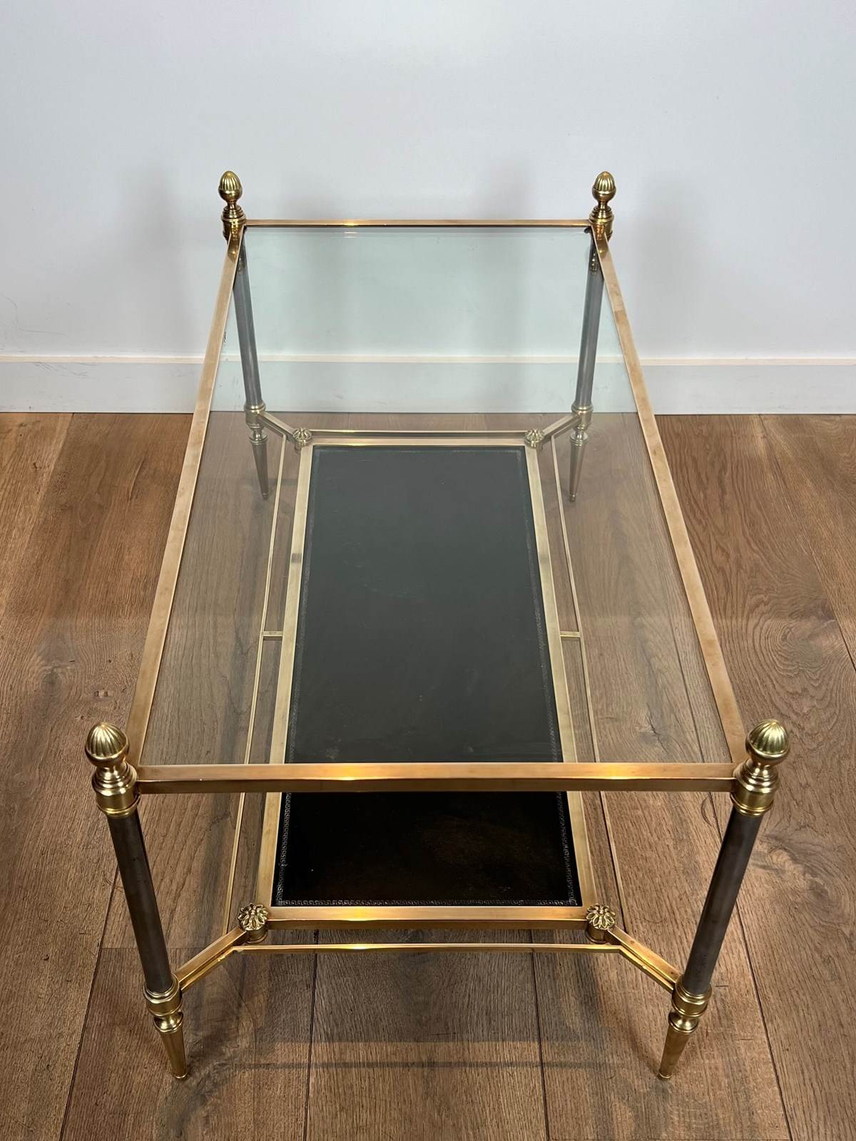 Neoclassical style brass coffee table with clear glass on top and red leather bottom shelf. French work by Maison Jansen. Circa 1940