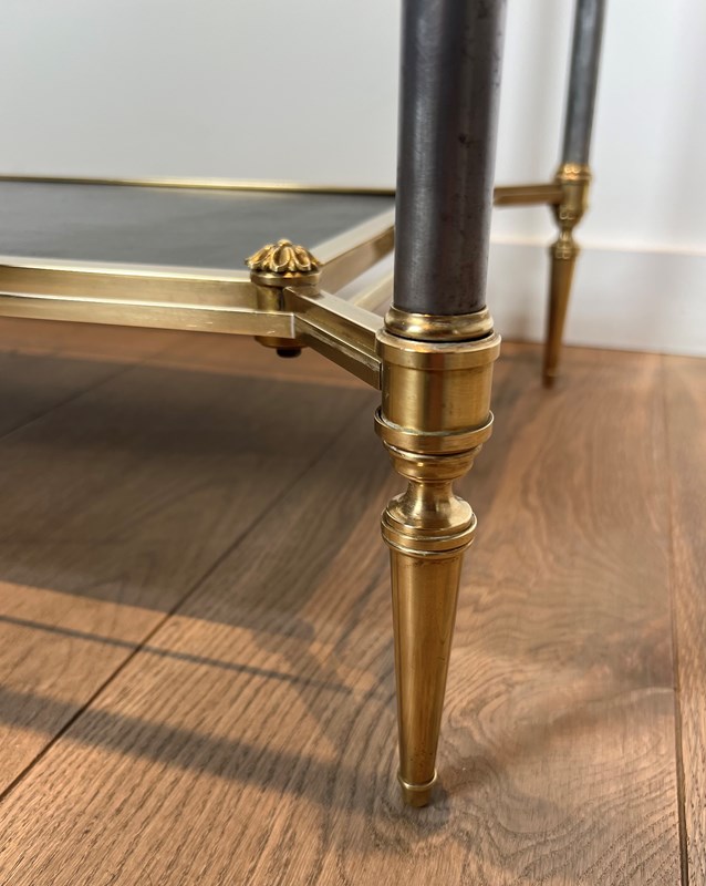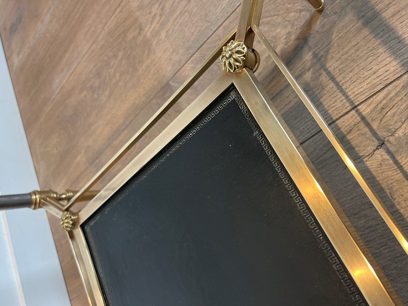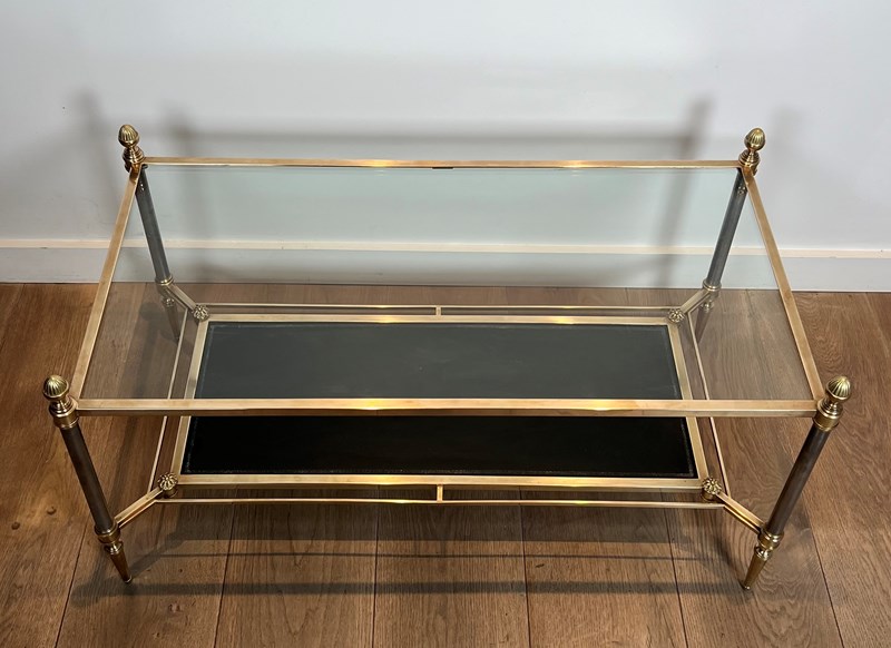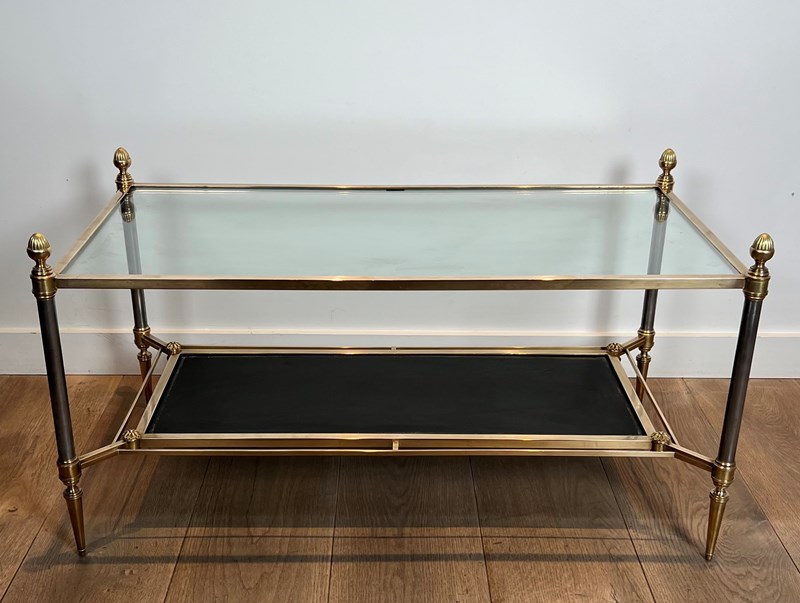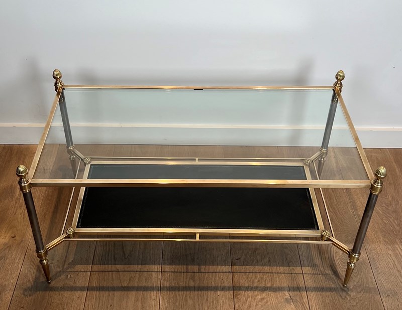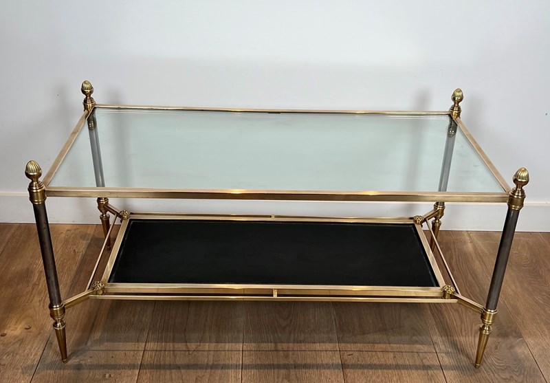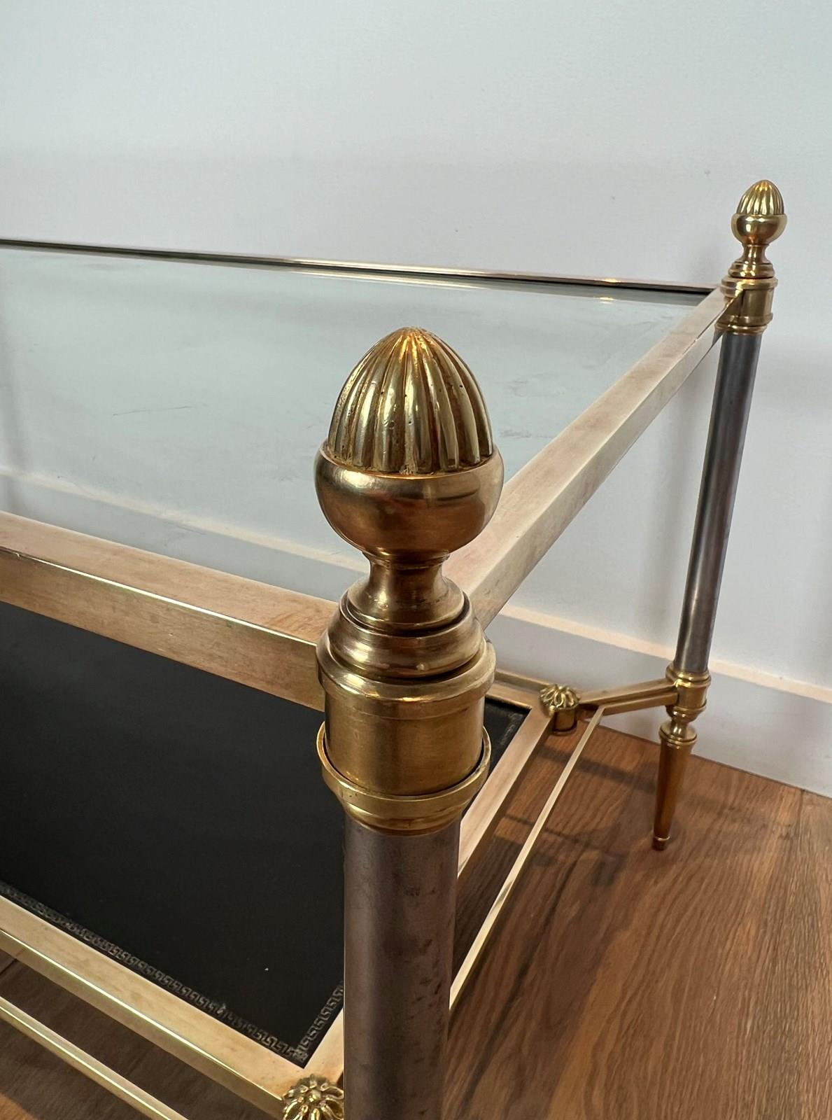 Neoclassical style brass coffee table with clear glass on top and red leather bottom shelf. French work by Maison Jansen. Circa 1940