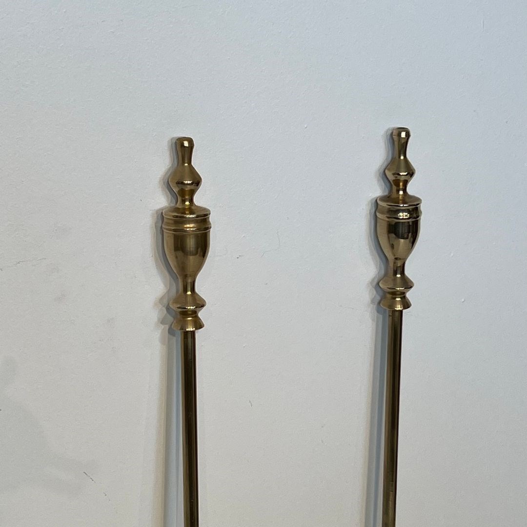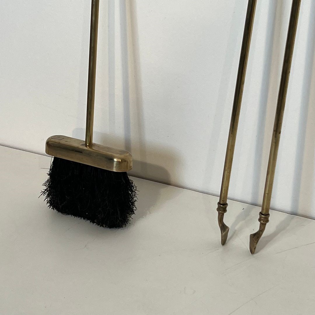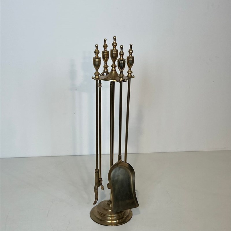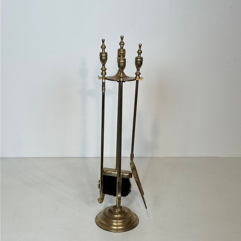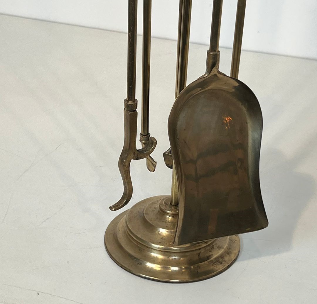 Neoclassical Style Brass Fireplace Tools on Stand. French work. Circa 1940