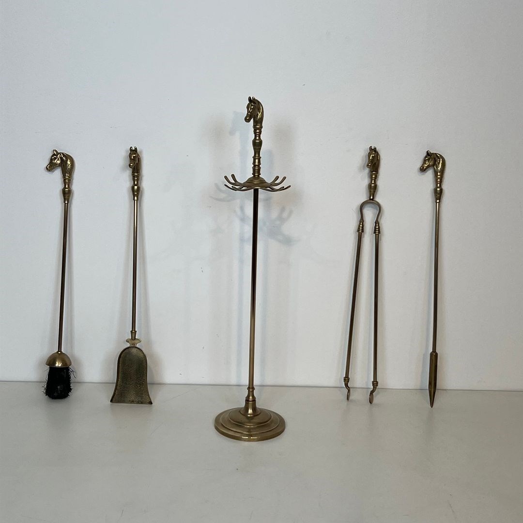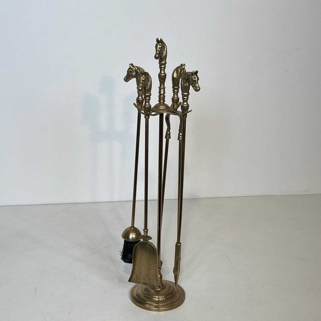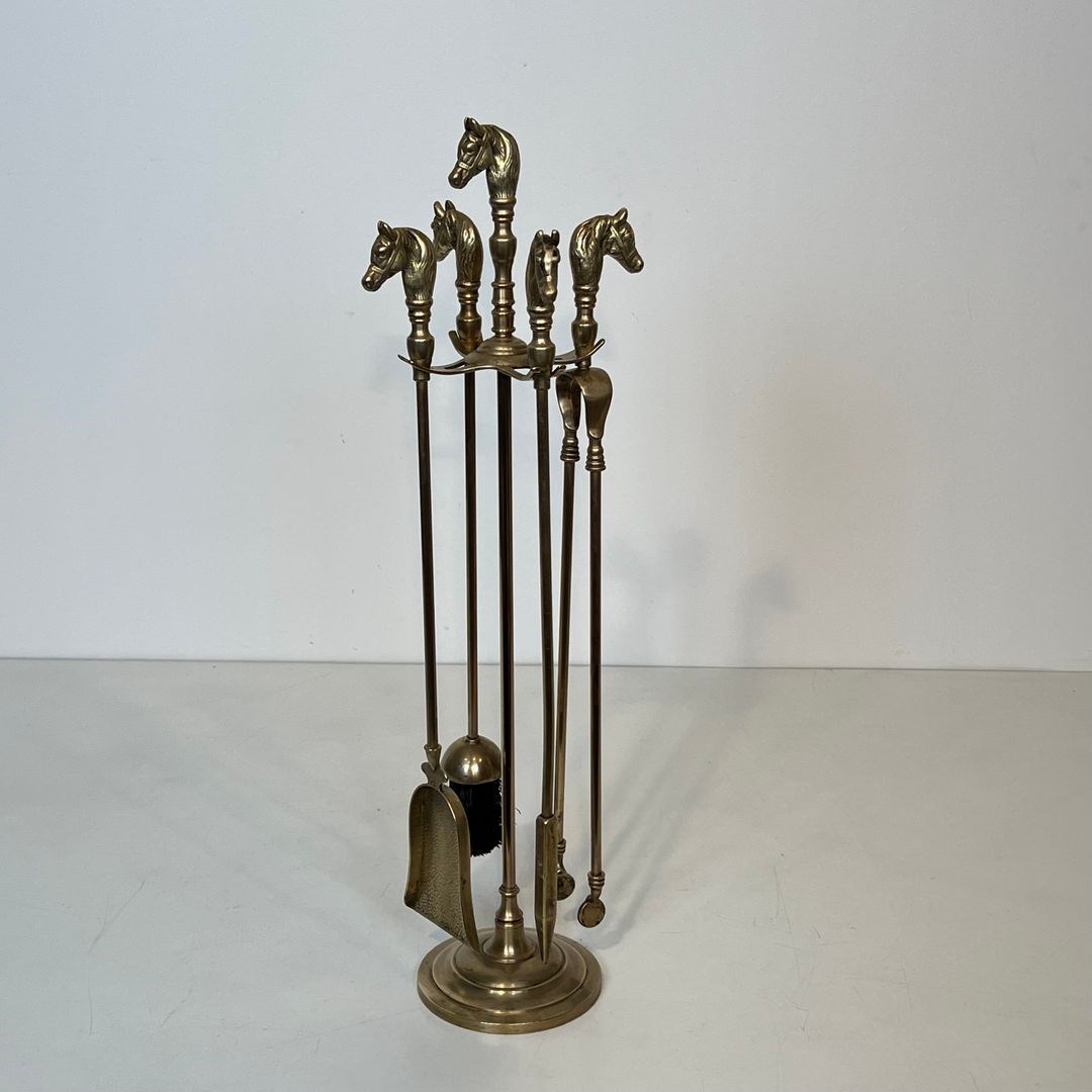 Neoclassical style brass horse heads fireplace tools. French. Circa 1950