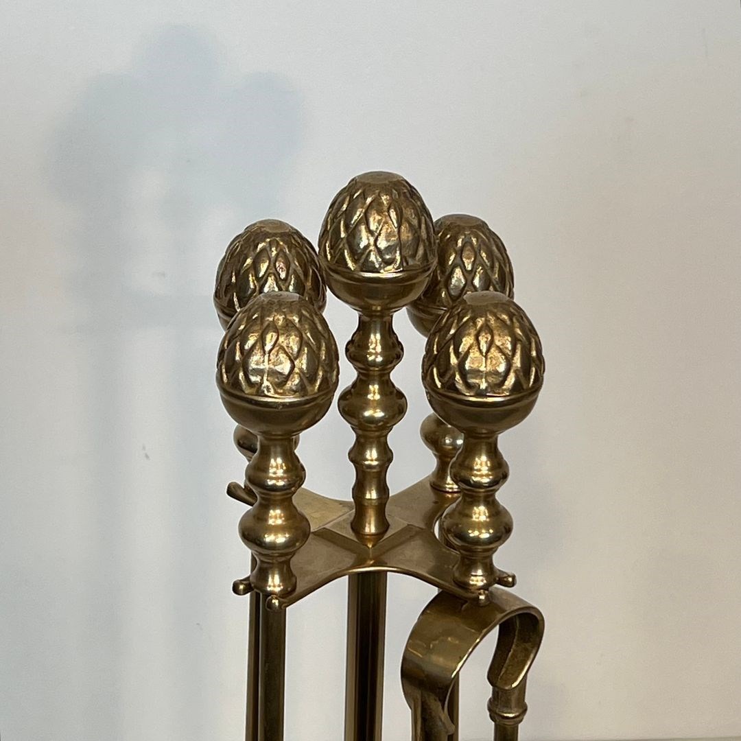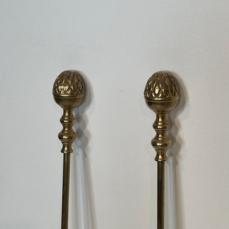 Neoclassical style brass pineapple fireplace tools. French work in the style of Maison Baguès. Circa 1970
