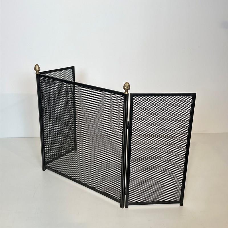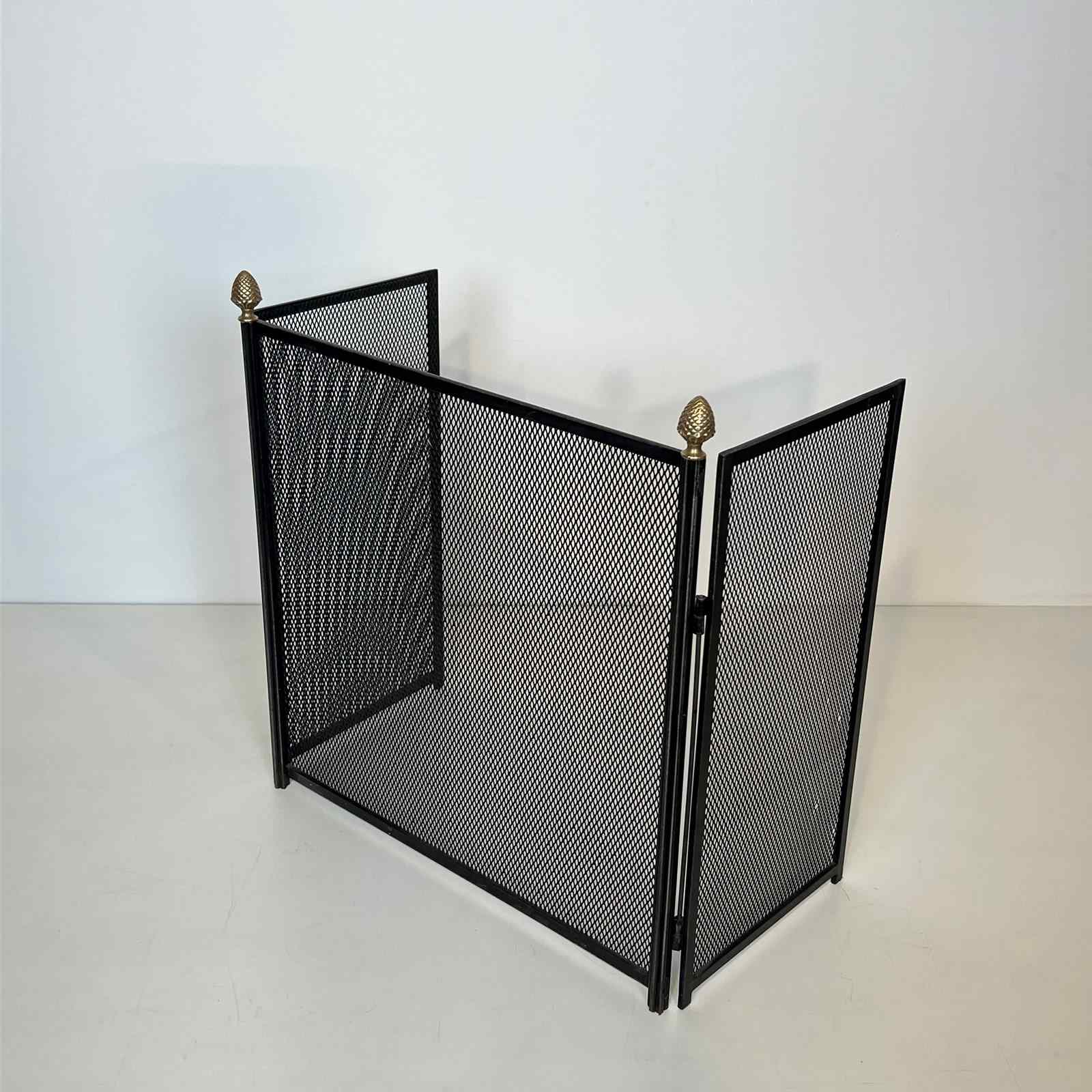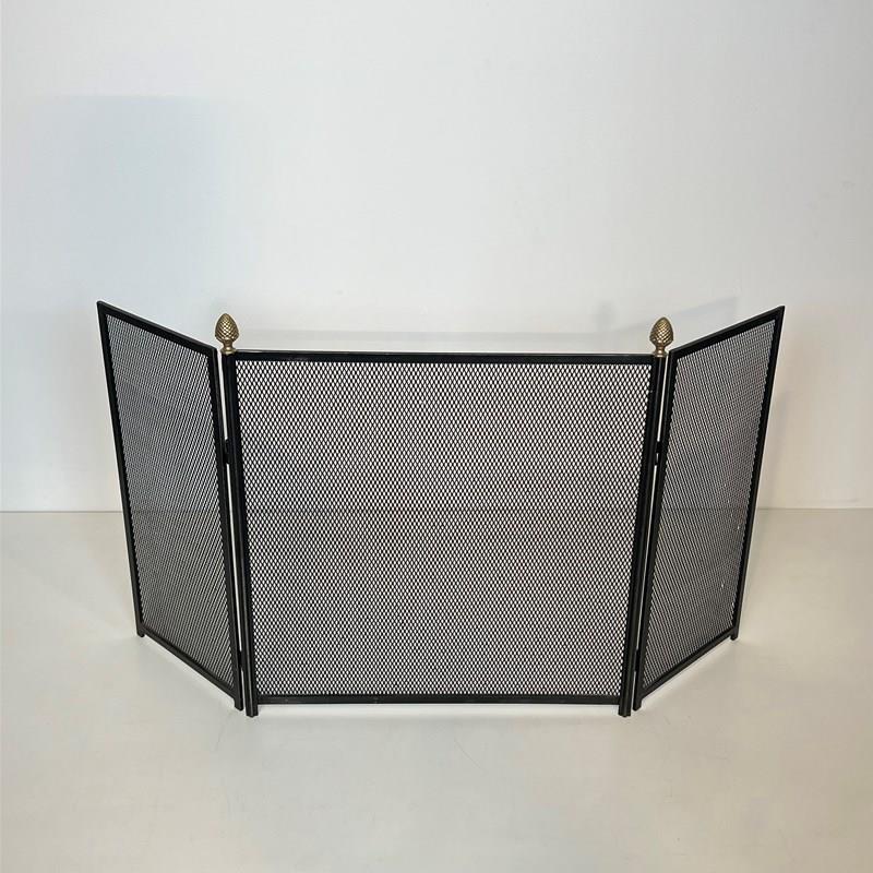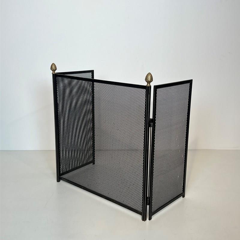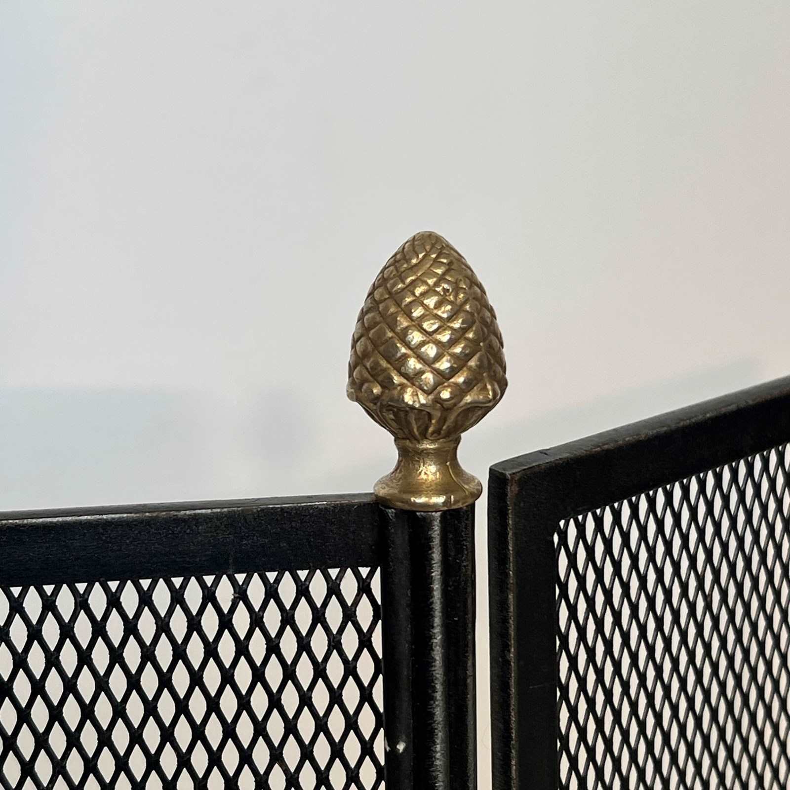 Neoclassical style steel, brass and grilling fireplace screen with bronze pine cones. French work. Circa 1940