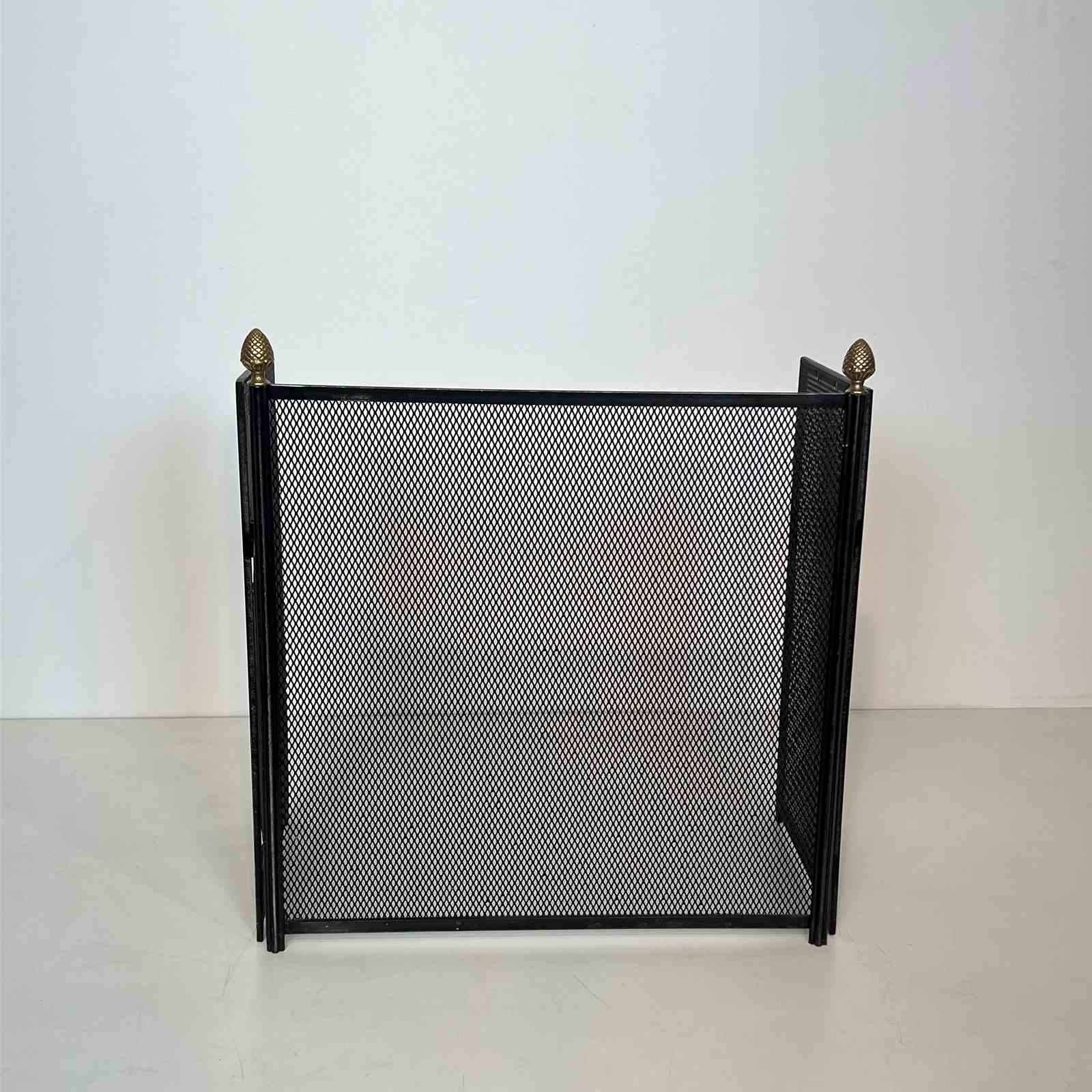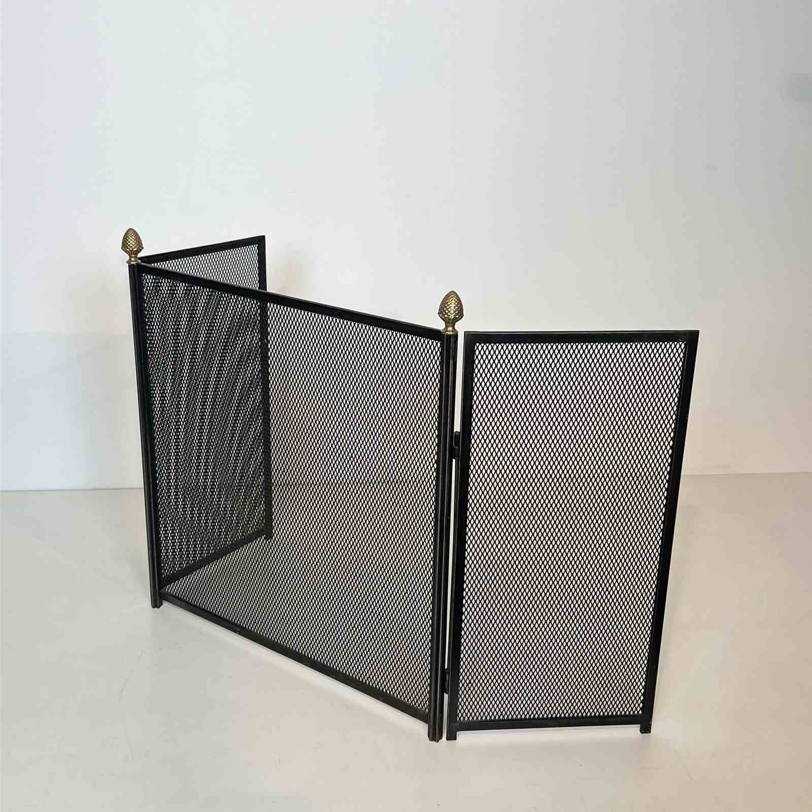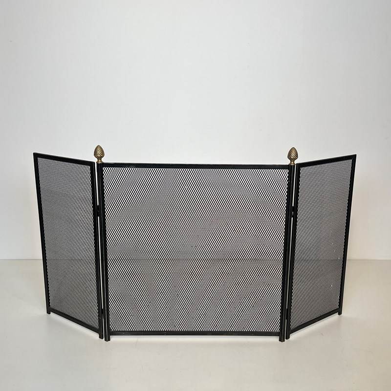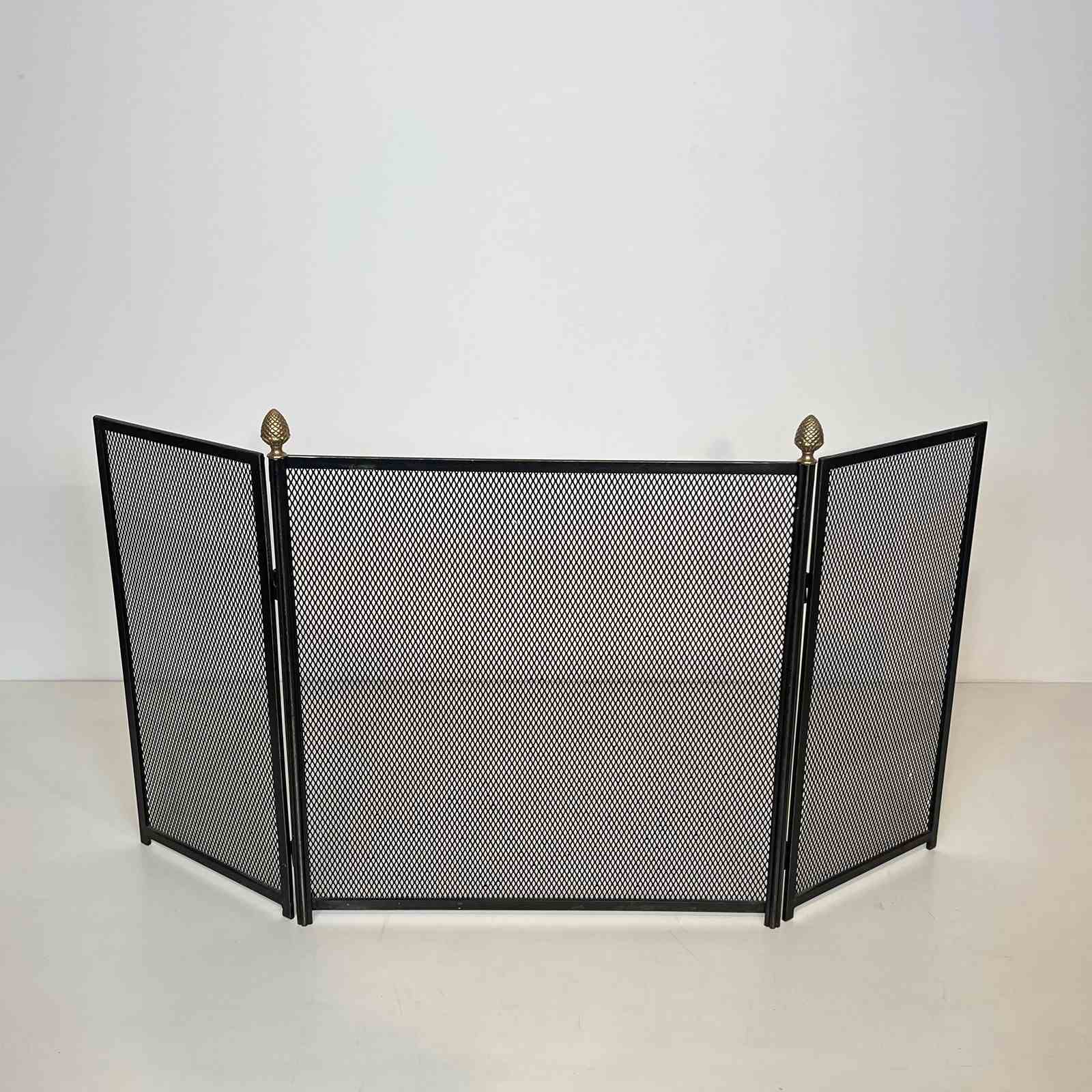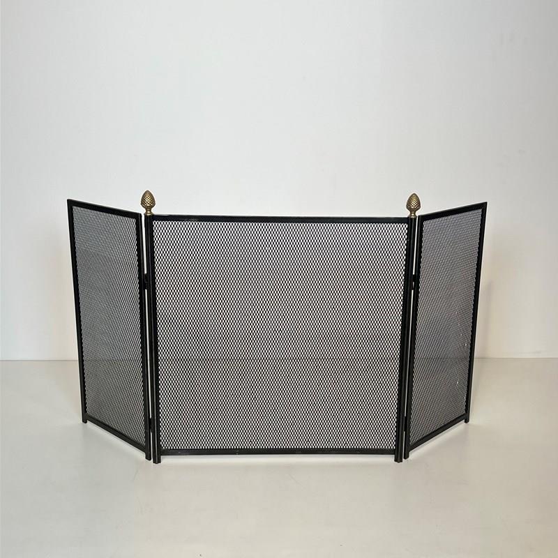 Neoclassical style steel, brass and grilling fireplace screen with bronze pine cones. French work. Circa 1940