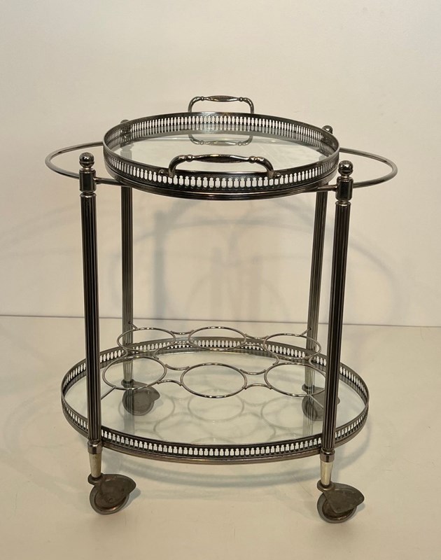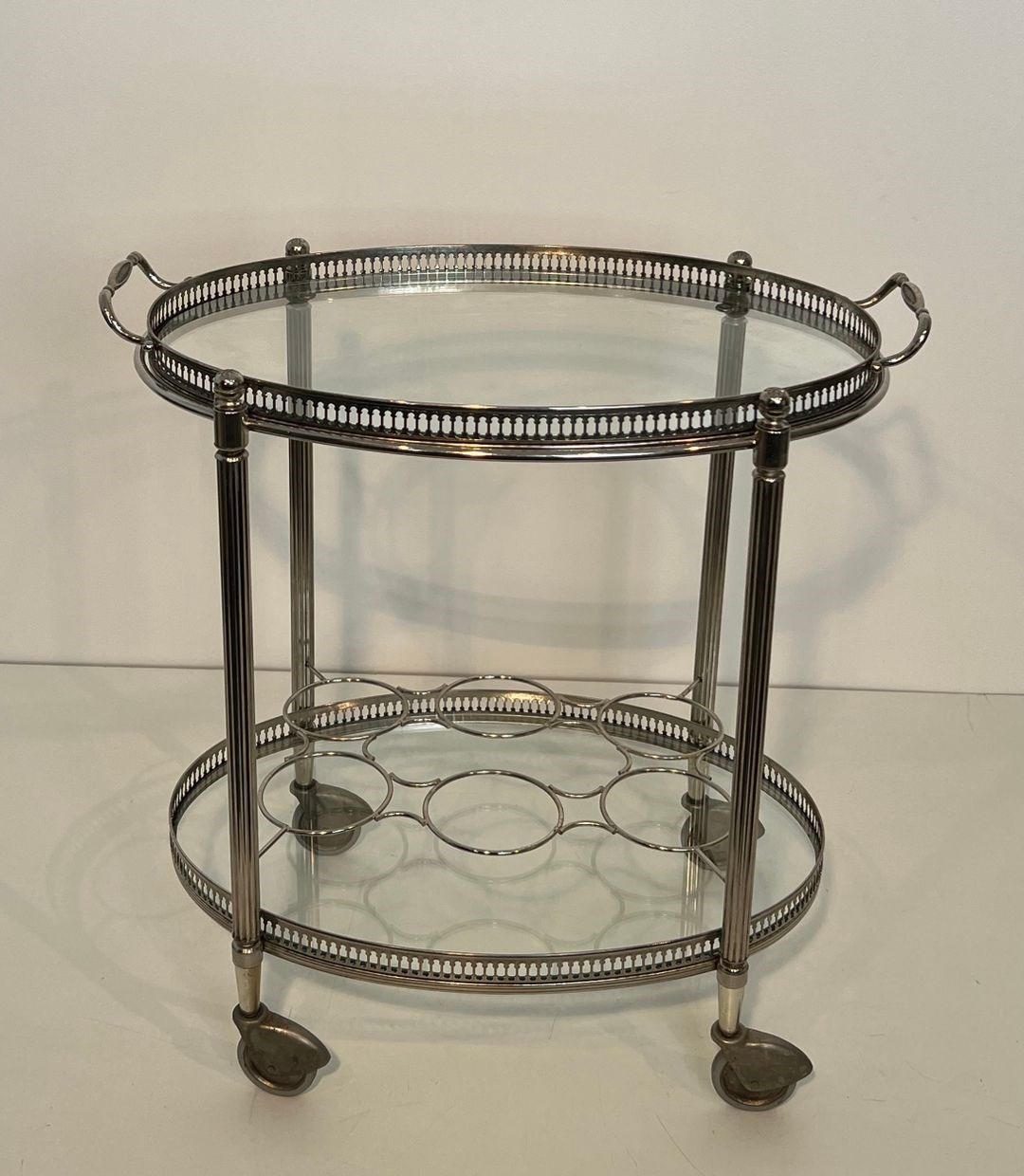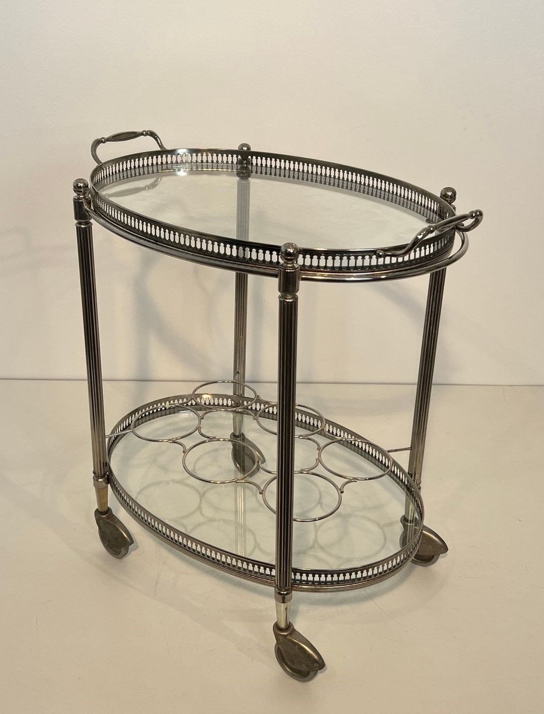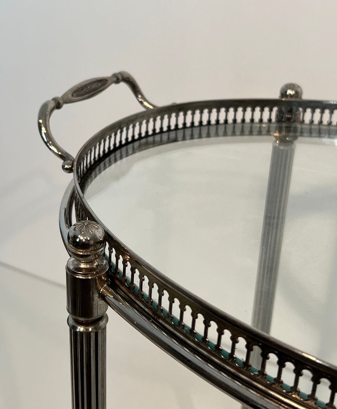Oval neoclassical style silvered brass drinks trolley. French work attributed to Maison Jansen. Circa 1940