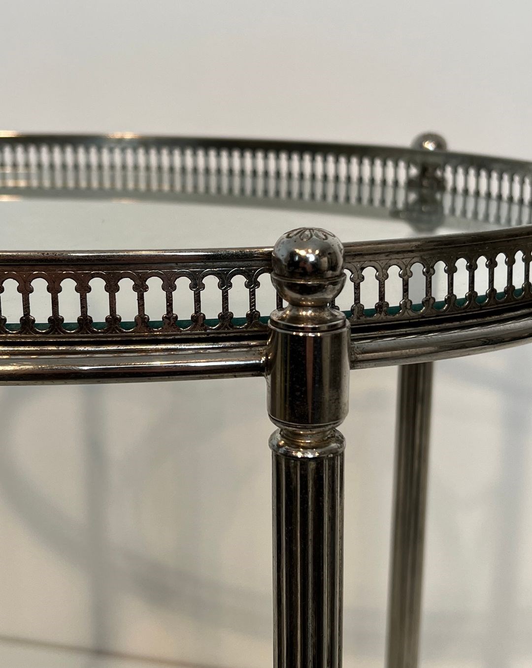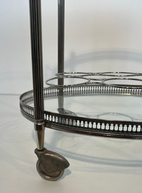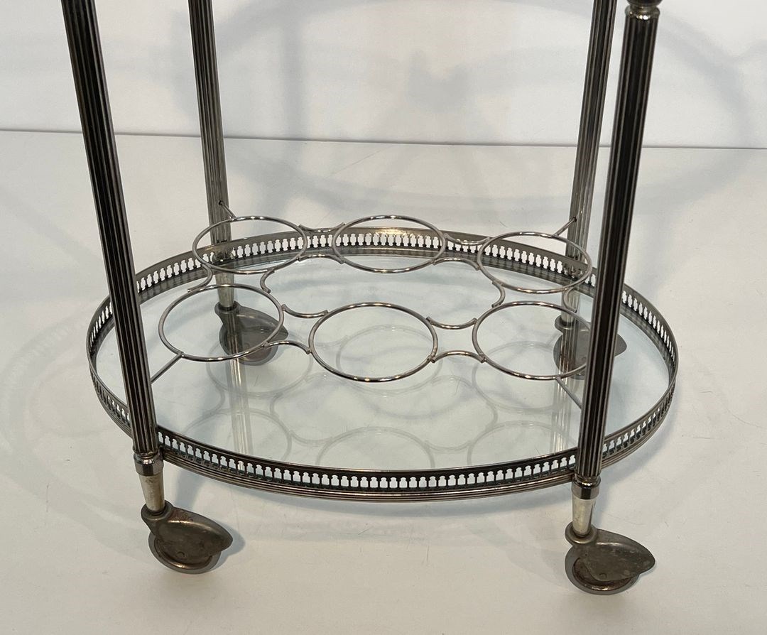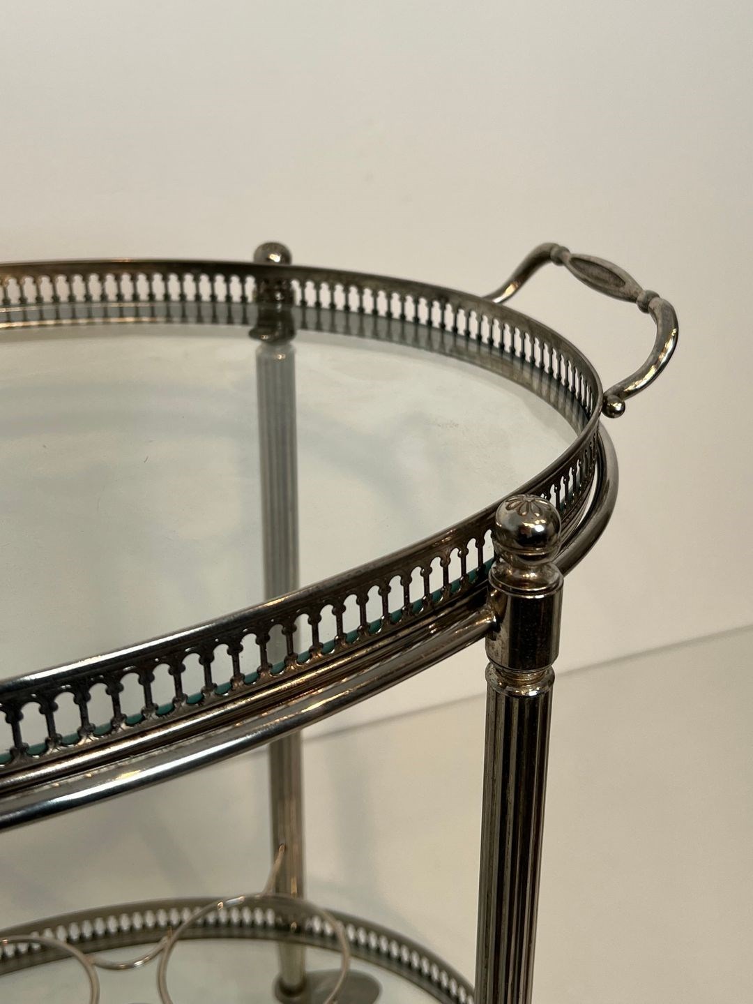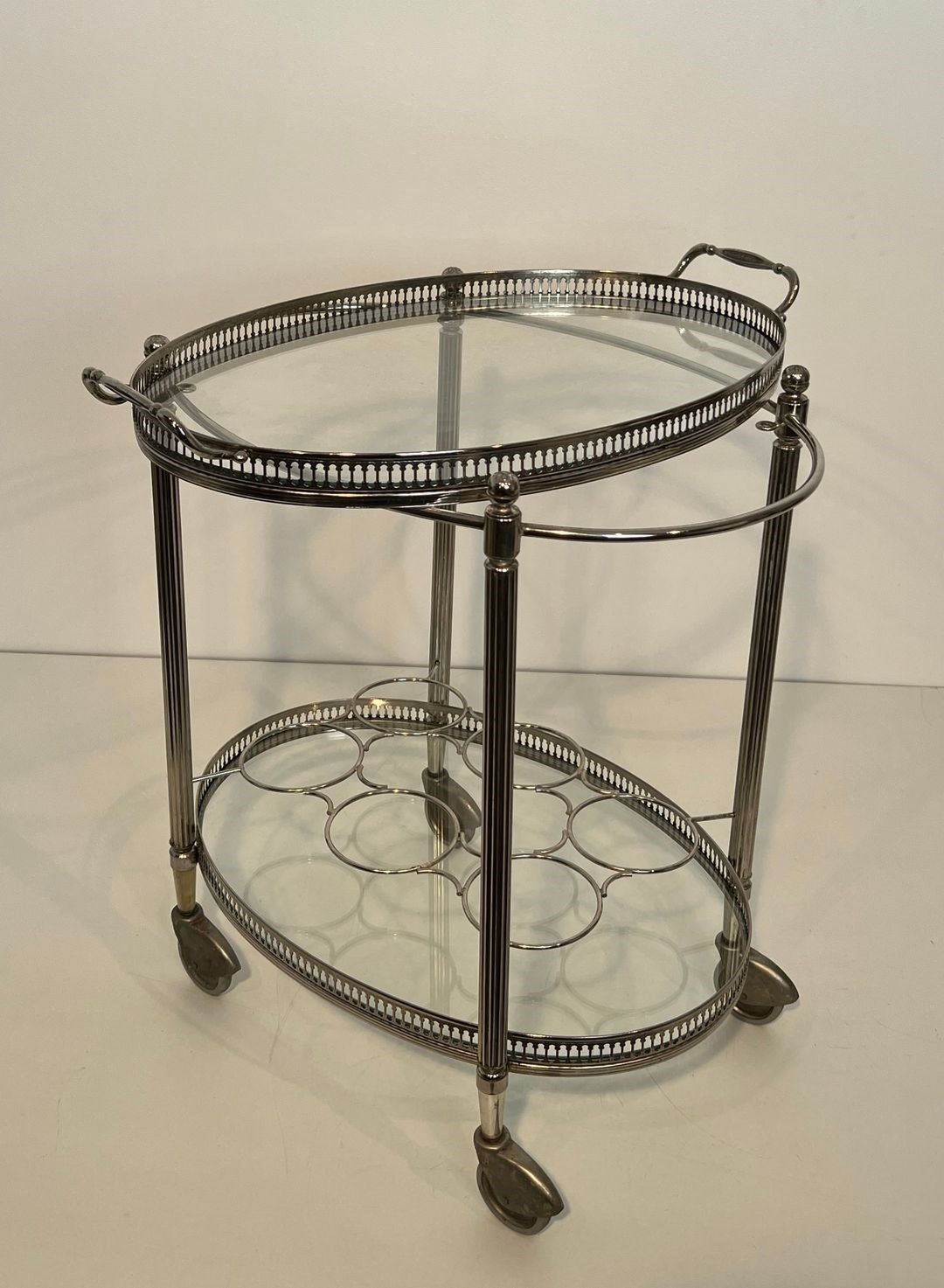 Oval neoclassical style silvered brass drinks trolley. French work attributed to Maison Jansen. Circa 1940