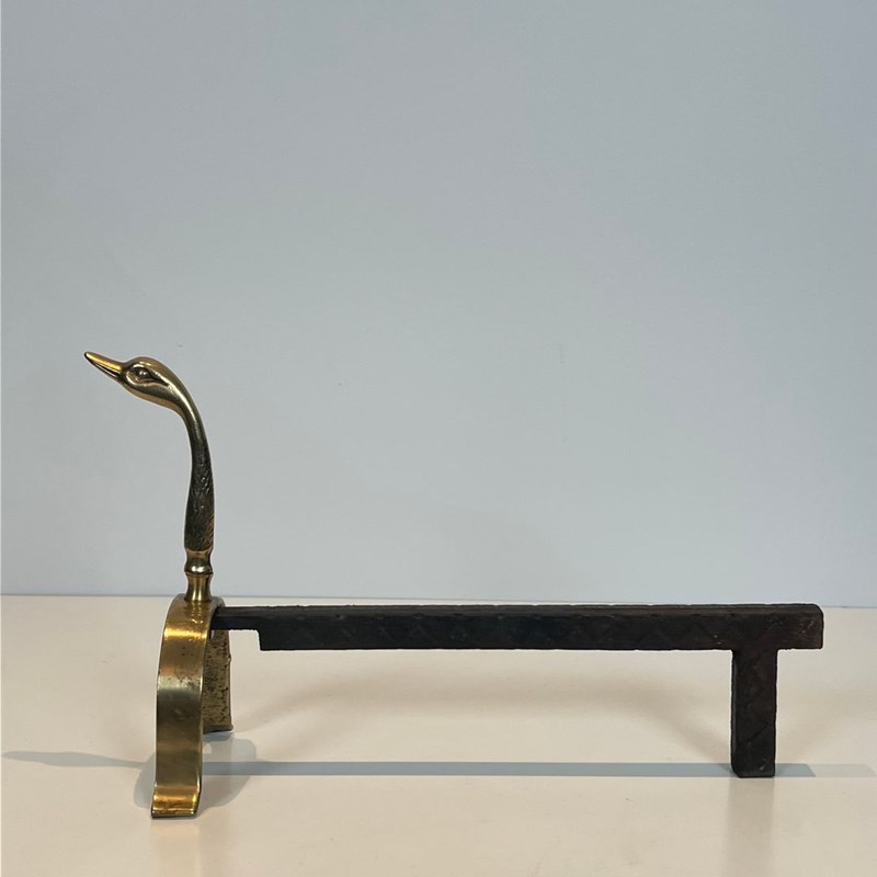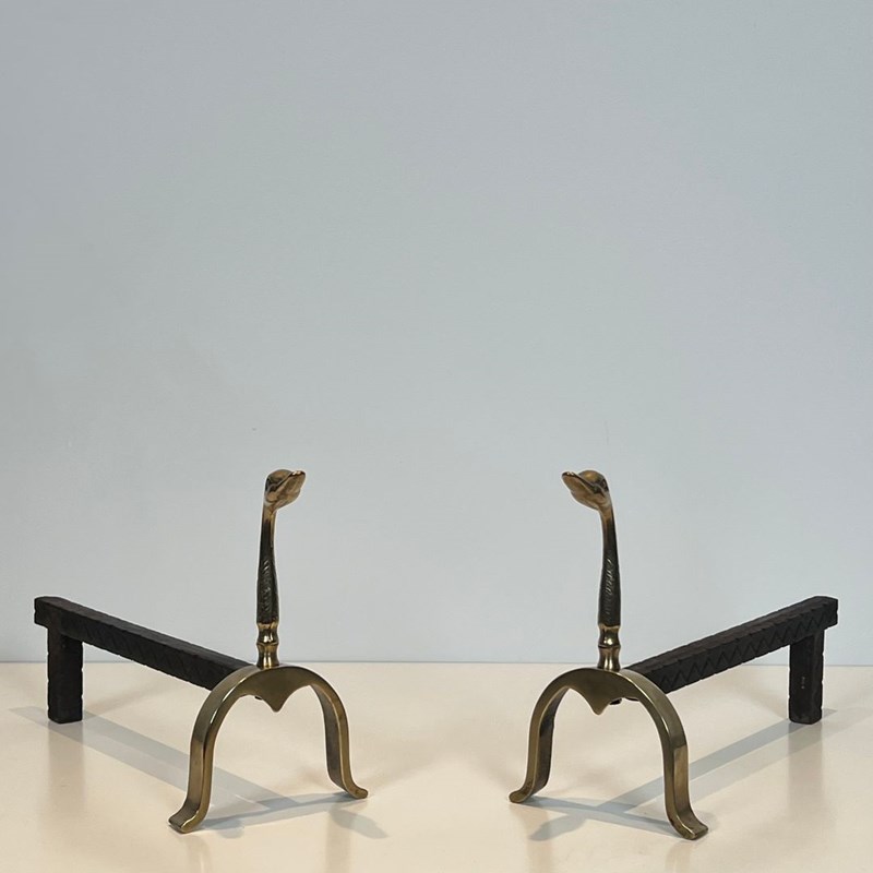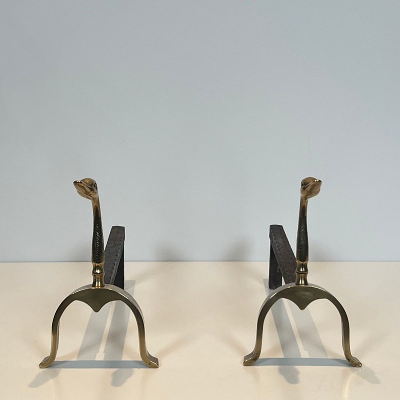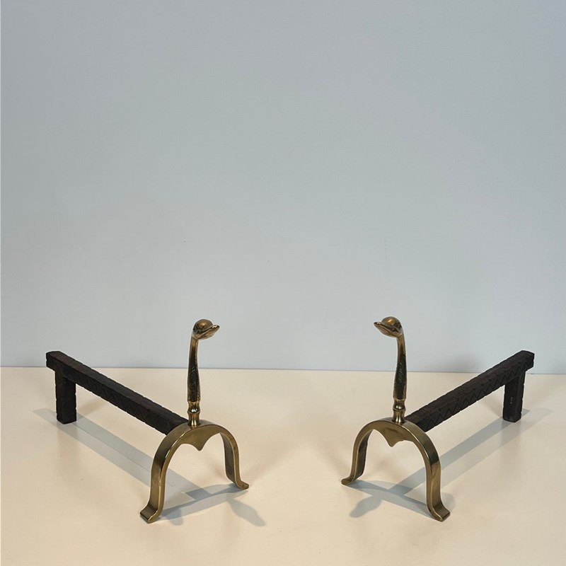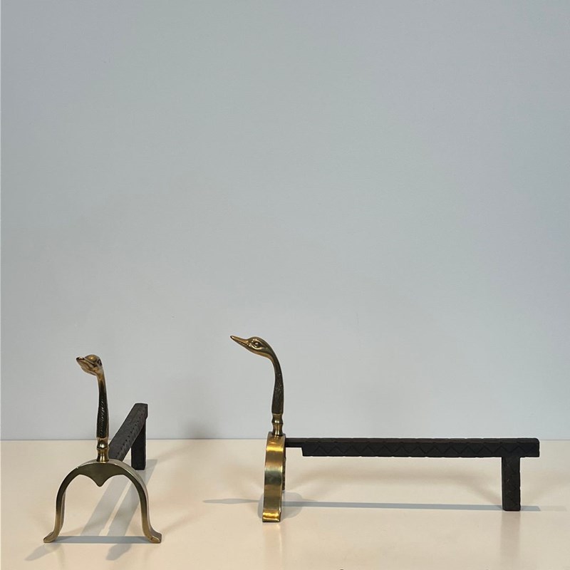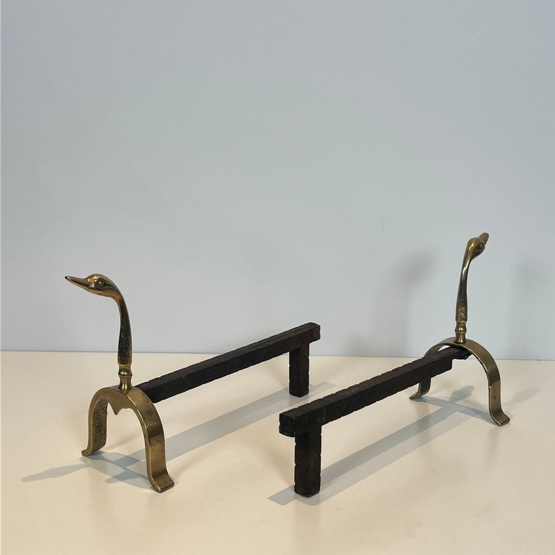 Pair of brass ducks andirons. French work in the style of Maison Jansen. Circa 1970