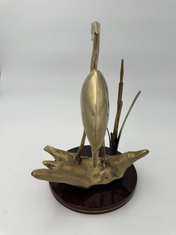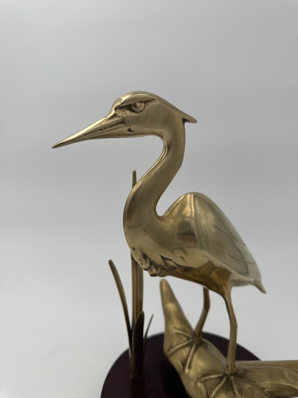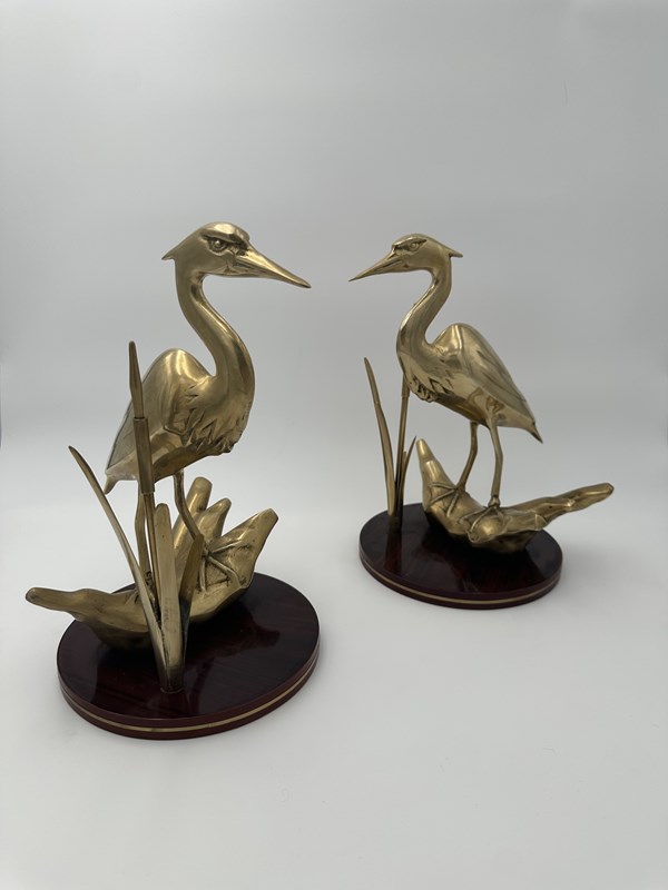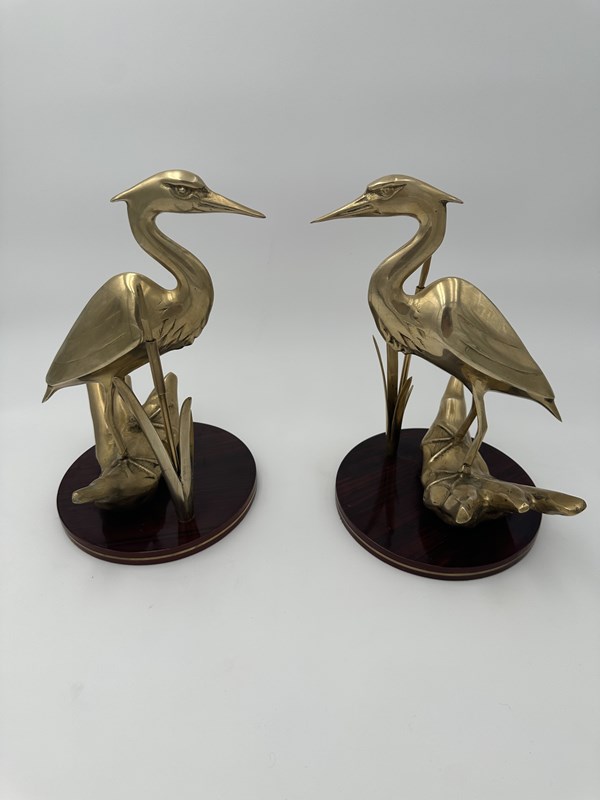 Pair Of Brass Sculptures Depicting Stylized Birds On Wooden Bases