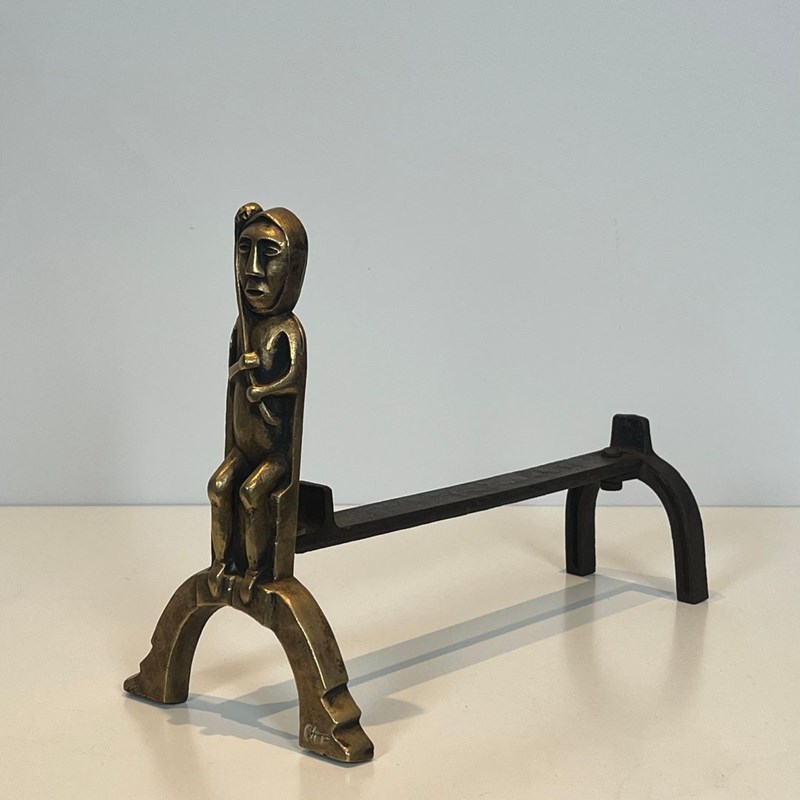 Pair Of Bronze Andirons With Seated Shamans
