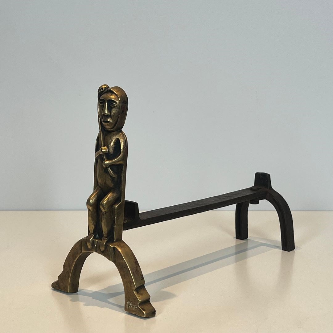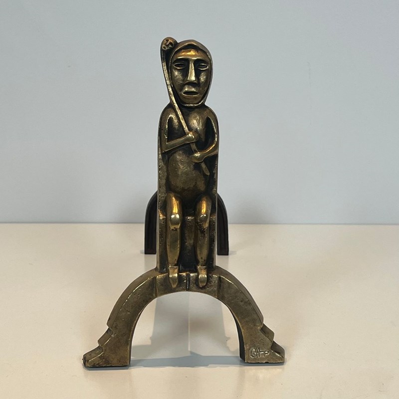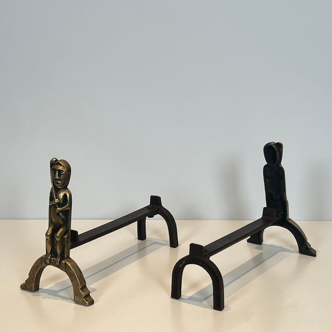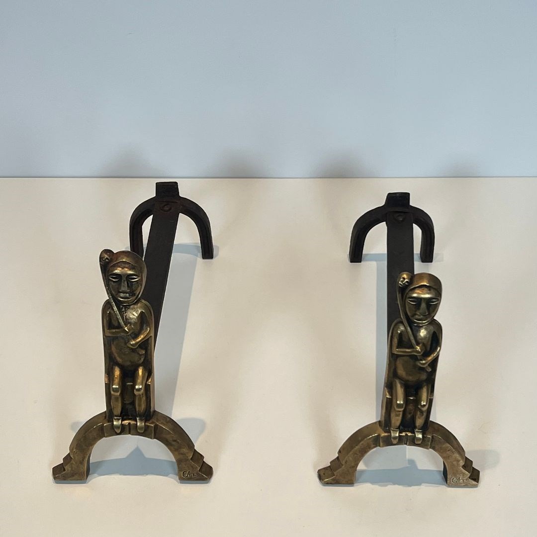 Pair of bronze andirons with seated shamans. French work monogrammed by Anton Prinner. Circa 1930