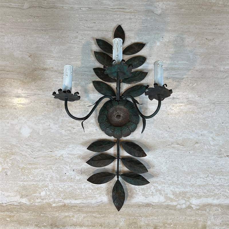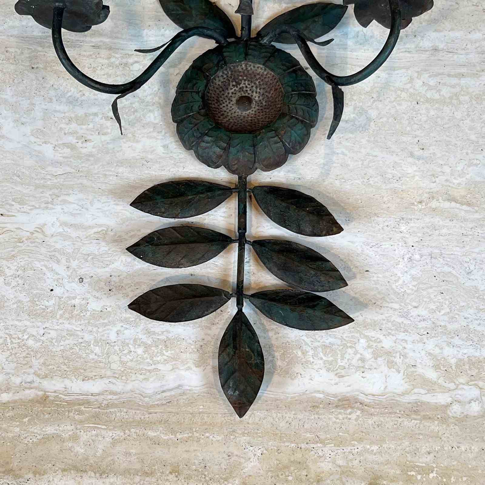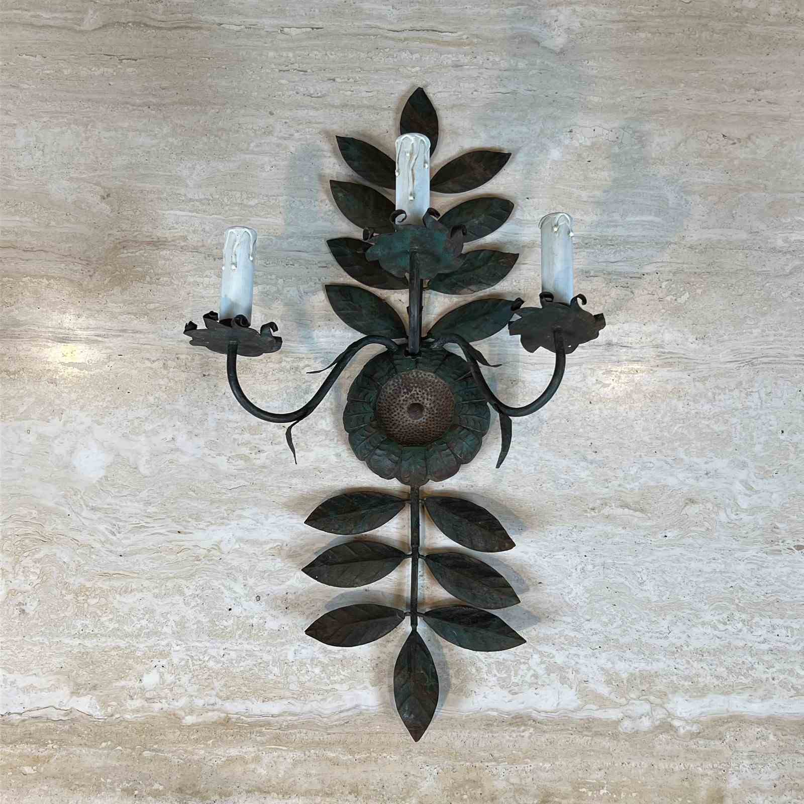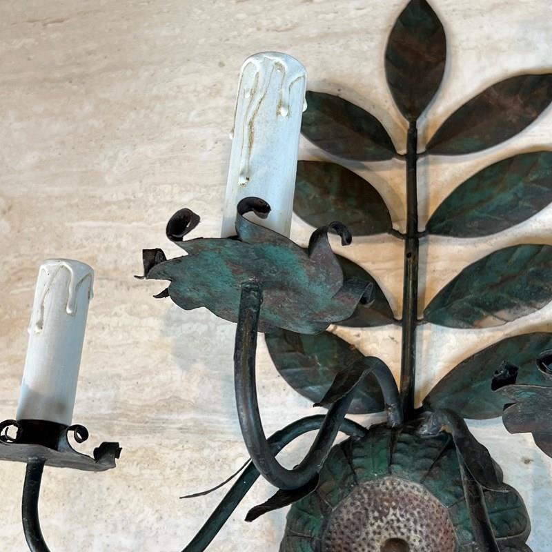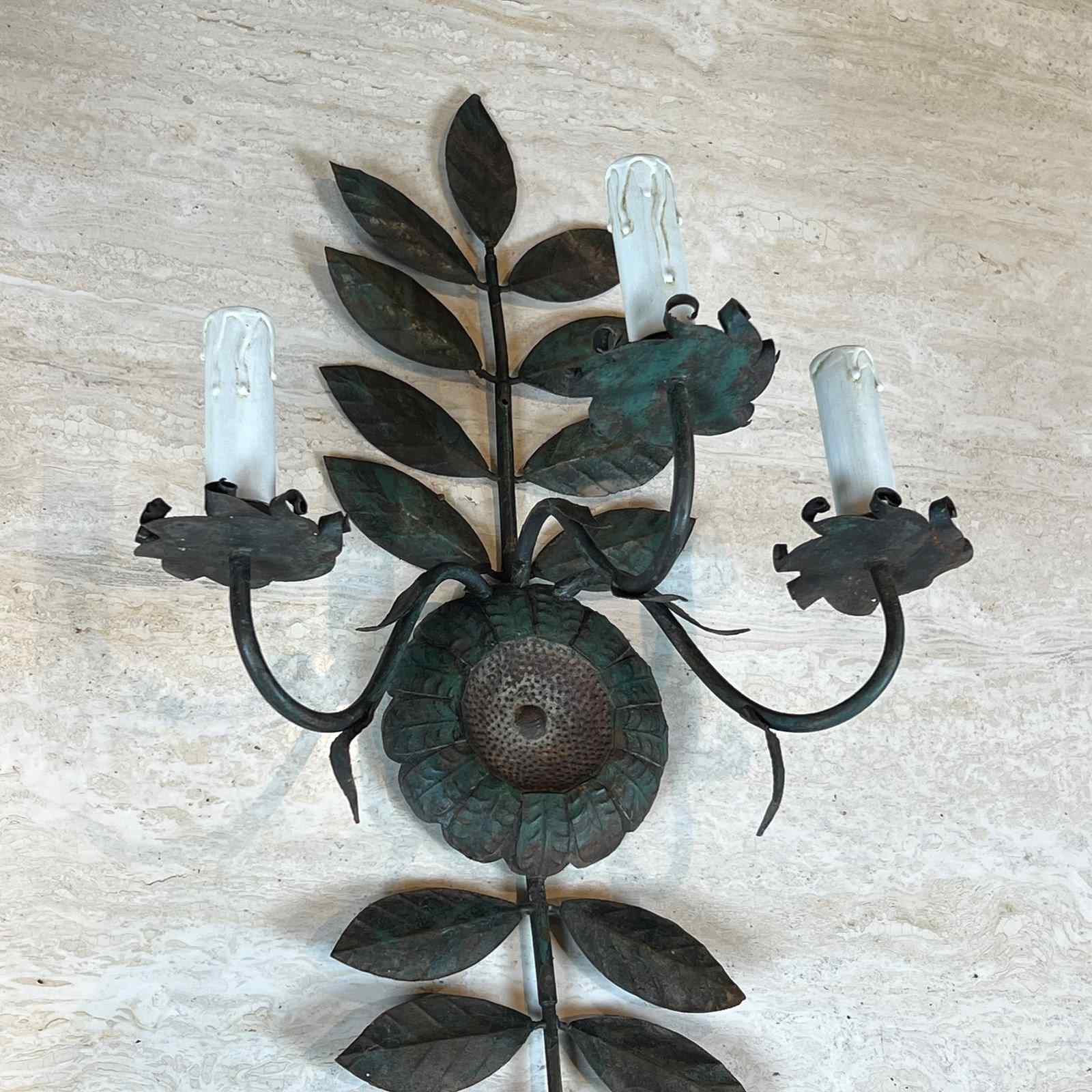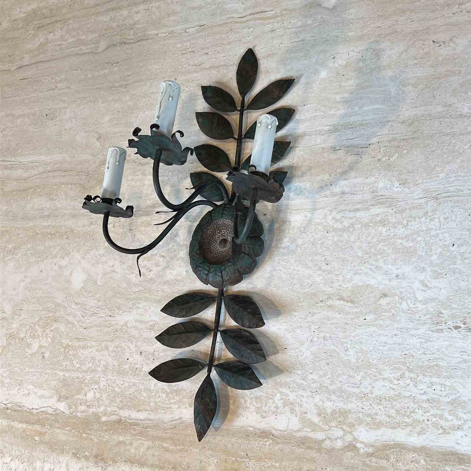Pair of decorative wall sconces in patinated metal depicting sunflowers and foliage. French work. Circa 1940
